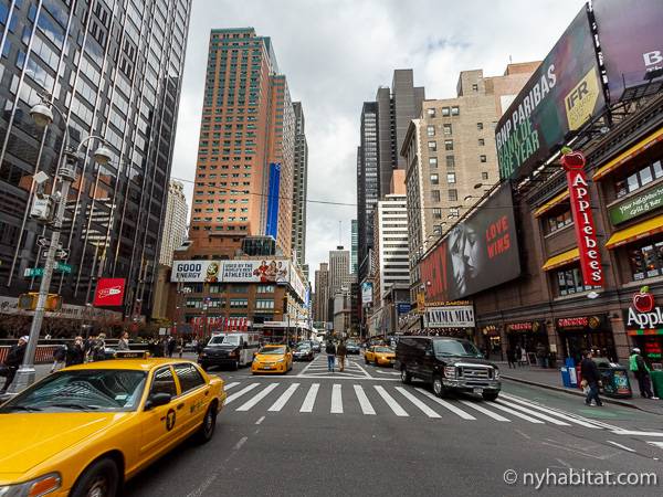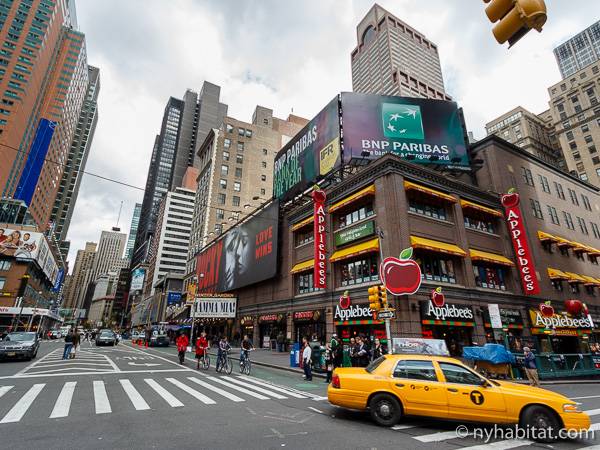 - Times Square: le quartier de New York le plus apprécié des touristes, il représente tout ce qui rend la ville populaire comme ses illuminations, ses rues bondées et ses innombrables magasins. Il se situe à Broadway entre la 42ème et la 47ème rue.