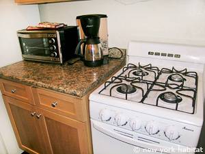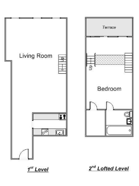 Cette location meublée dispose de hauts plafonds, de parquets et d'un balcon privé. Au premier niveau le salon est meublé de deux grands canapés-lits et d'un matelas gonflable pour les invités. Dans ce salon se trouve aussi un espace pour les repas avec une table et des chaises. Une climatisation installée sur la fenêtre permet de rafraîchir la pièce pendant l'été.La cuisine séparée est entièrement équipée d'une gazinière, d'une machine à café, d'un micro-onde, d'un lave-vaisselle et d'un four. Un escalier ouvert donne accès au second niveau avec chambre à coucher et salle de bain.Il convient de préciser que la chambre à coucher donne sur le salon limitant donc l'intimité.La salle de bain est adjacente à la chambre à coucher du second niveau et comporte une baignoire avec douche.Un accès Internet sans fil est disponible.