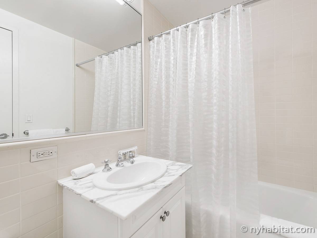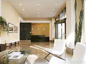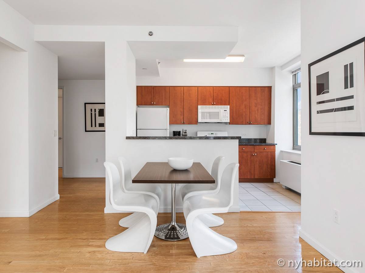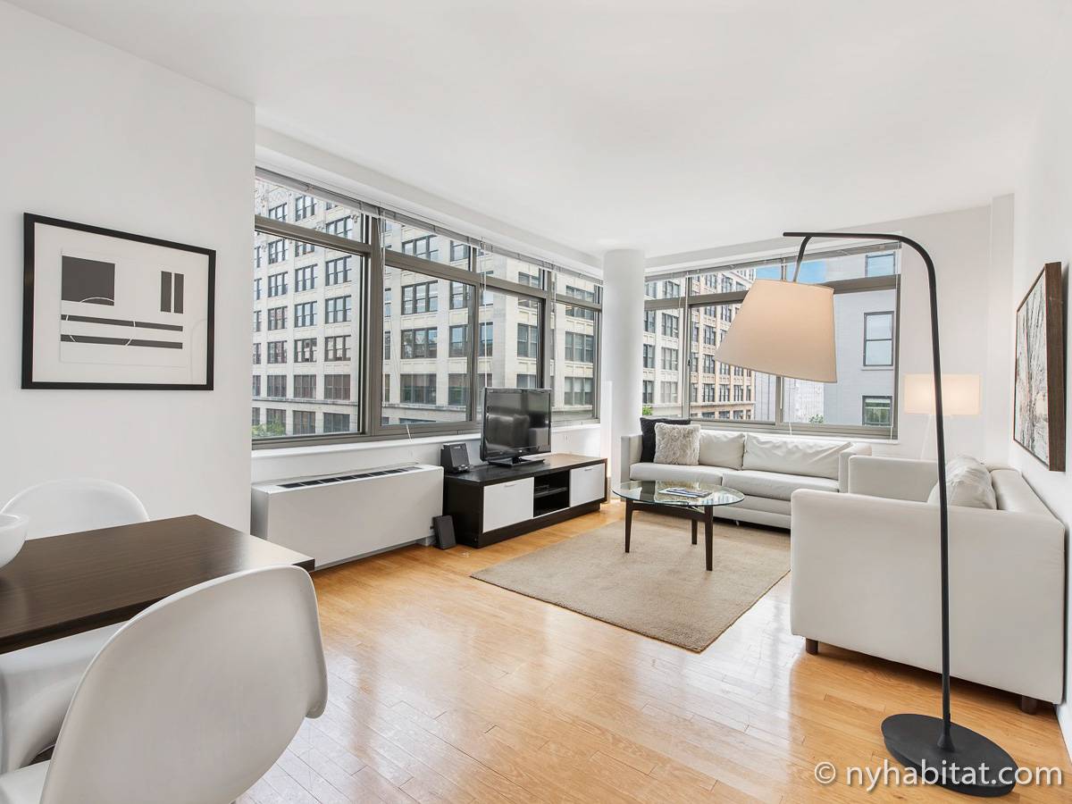 Grâce aux immenses baies vitrées du salon, cette location meublée à New York est très lumineuse. Le parquet et les accessoires de décoration moderne, comme des tableaux et un tapis décoratif noirs et blancs, y font régner une ambiance élégante mais toutefois contemporaine. Dans le salon, les locataires trouveront une grande télévision écran plat qui fait face à deux canapés. Sur le coté, il y une petite table de salle à manger, parfaite pour un diner romantique à la maison.