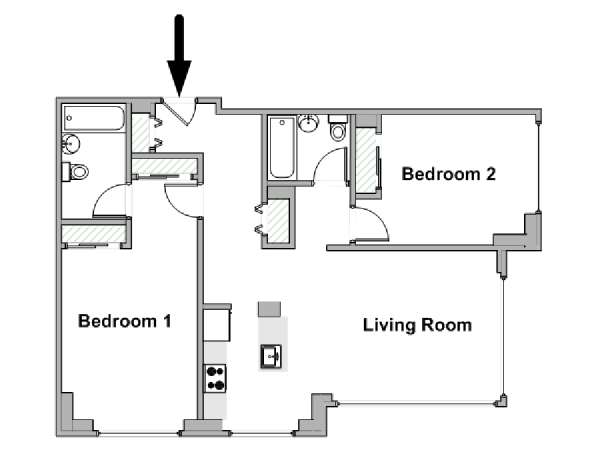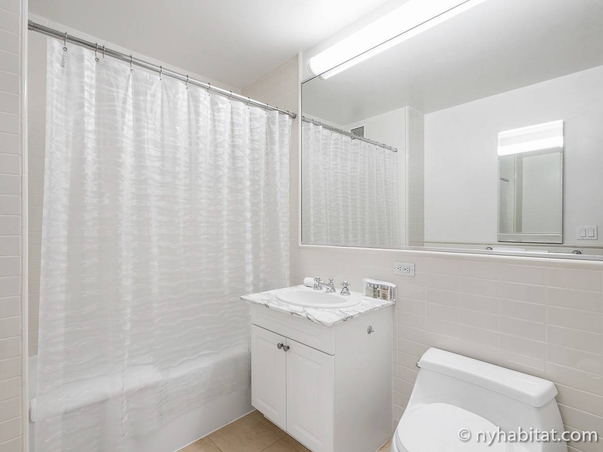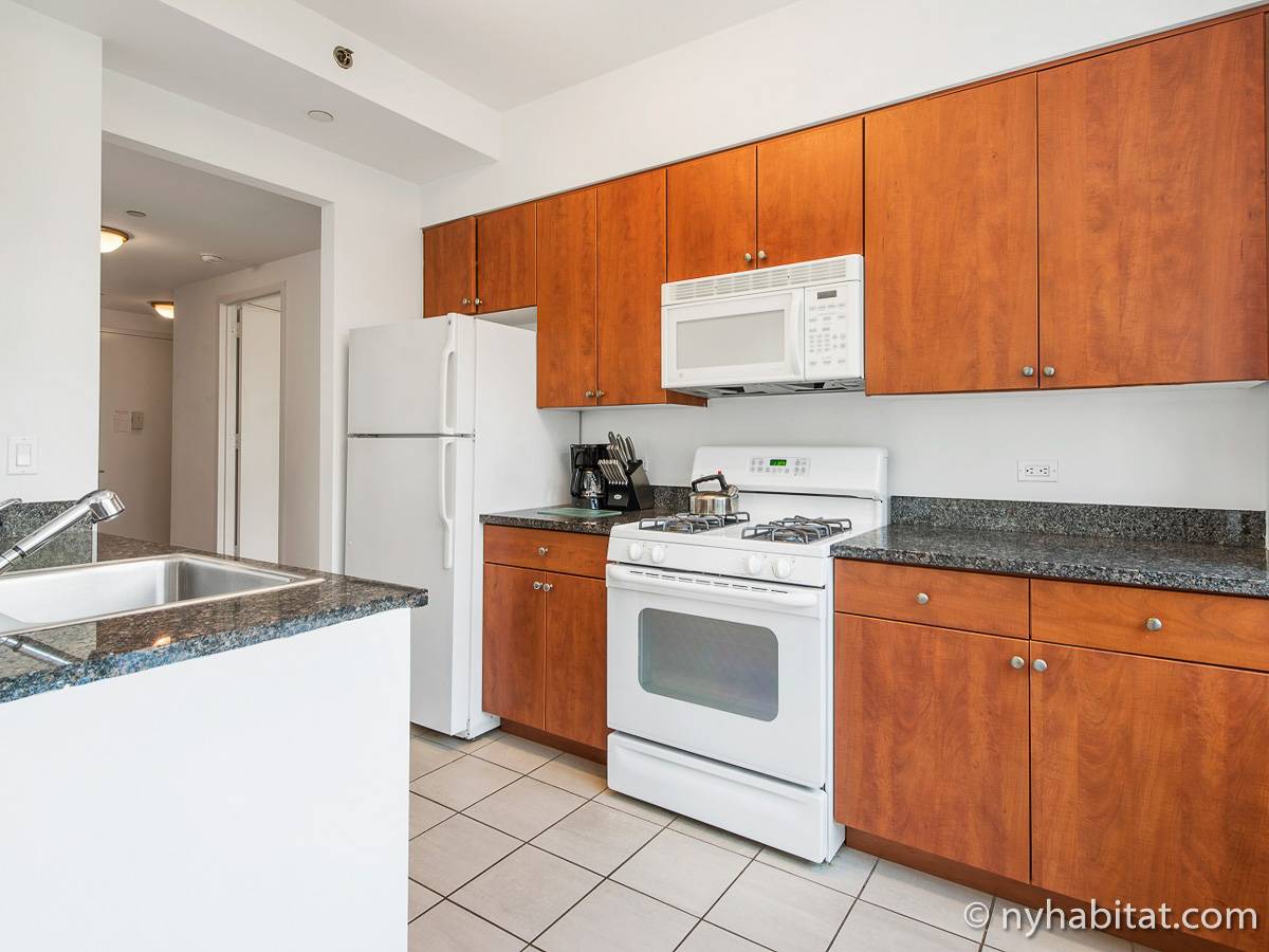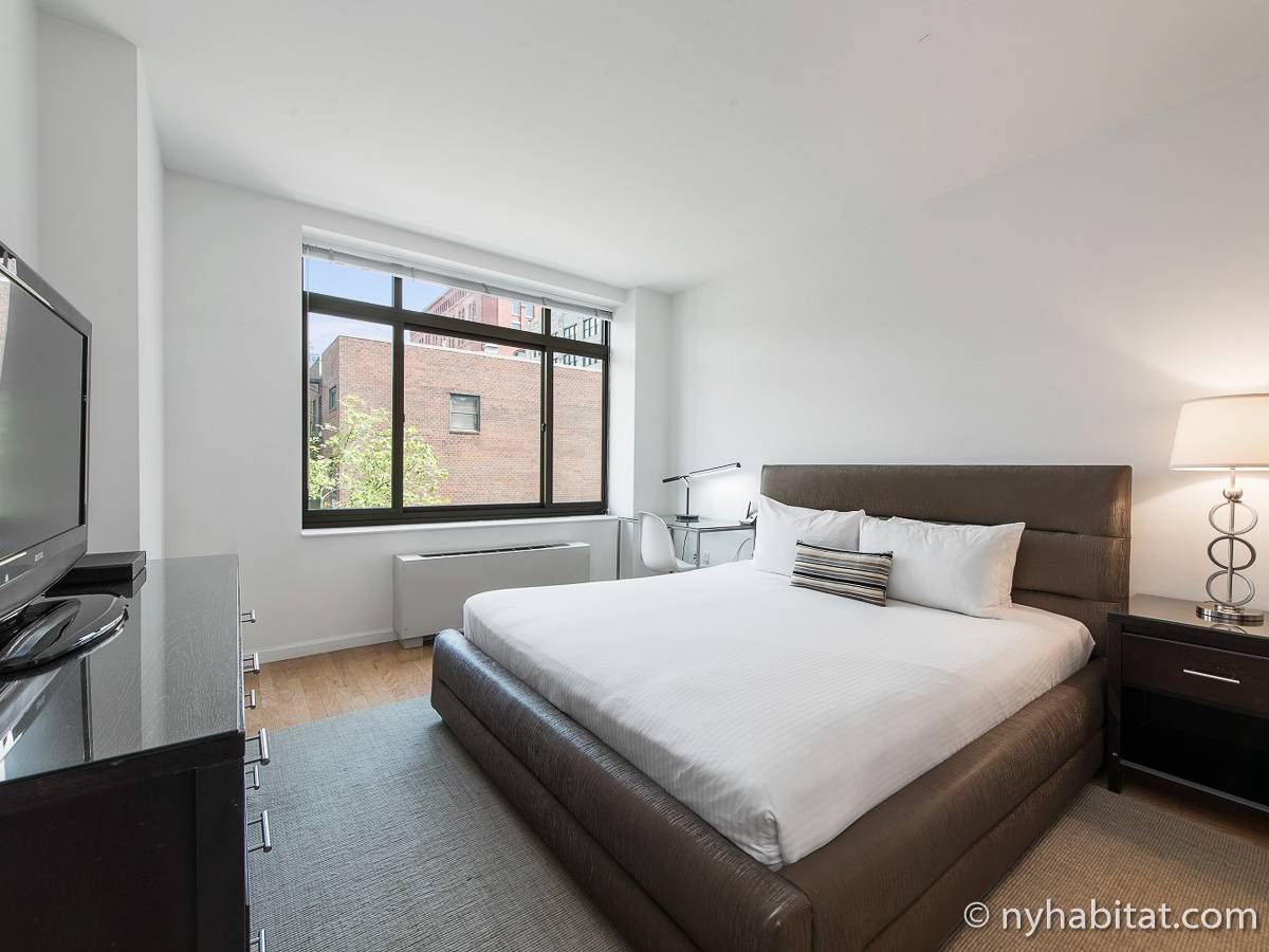 Grâce aux immenses baies vitrées du salon, cette location meublée à New York est très lumineuse. Le parquet et les accessoires de décoration moderne, comme des tableaux et un tapis décoratif noirs et blancs, y font régner une ambiance élégante mais toutefois contemporaine. Dans le salon, les locataires trouveront une grande télévision écran plat qui fait face à deux canapés. Sur le coté, il y une petite table de salle à manger, parfaite pour un diner romantique à la maison.