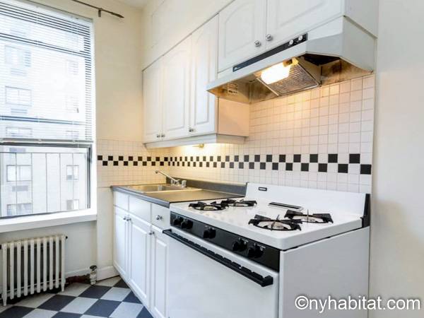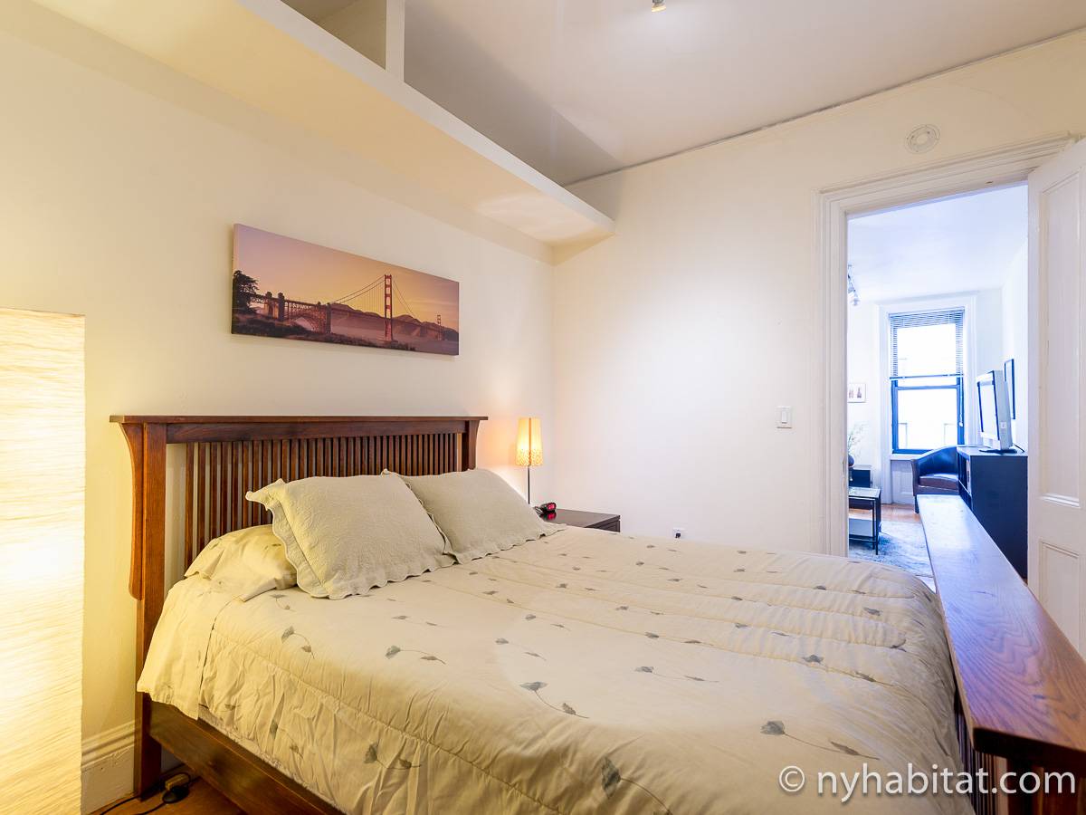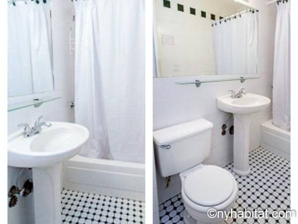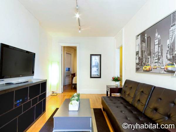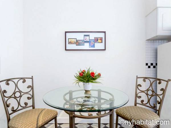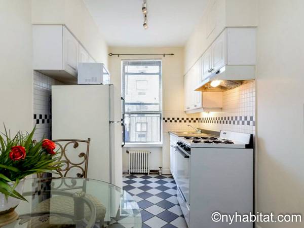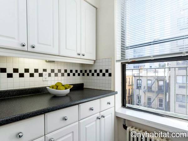 Cette location meublée avec l’air conditionné dispose d’un salon moderne avec un canapé convertible et une table. Veuillez noter que le canapé lit ne devrait pas utilisé comme solution de couchage permanente et n'offre pas le même confort qu'un matelas. Vous vous sentirez comme un vrai new yorkais en observant les tableaux accrochés aux murs, représentant les immeubles de Manhattan. Les deux fenêtres donnent sur les buildings alentours. Une cuisine indépendante dispose des équipements basiques ainsi que d’un four à micro-ondes et d’une table de style bistro. La chambre dispose d’un grand lit Queen, d’une armoire et d’une fenêtre. Une grande armoire est également disposée à côté de l’entrée de l’appartement. La salle de bain est dotée d’une baignoire/douche, de toilettes et d’un lavabo.