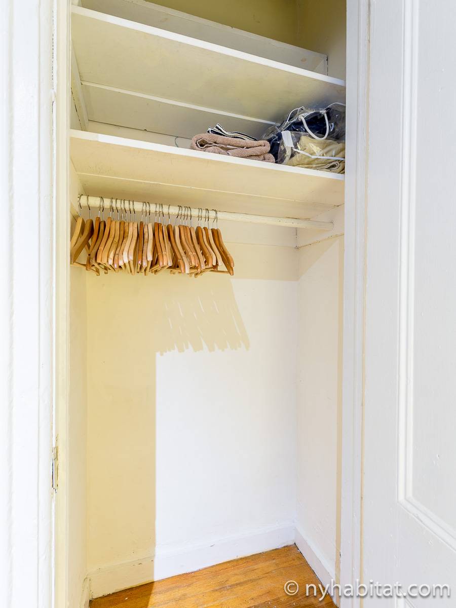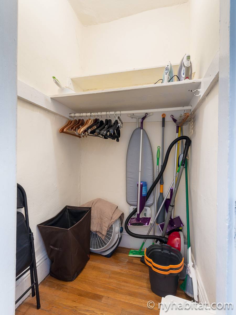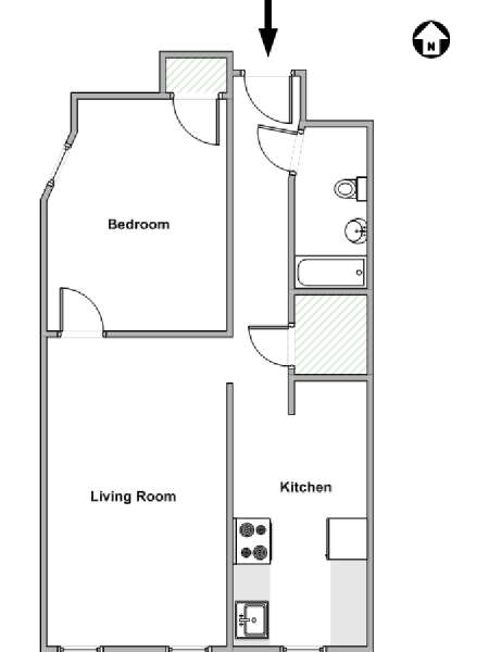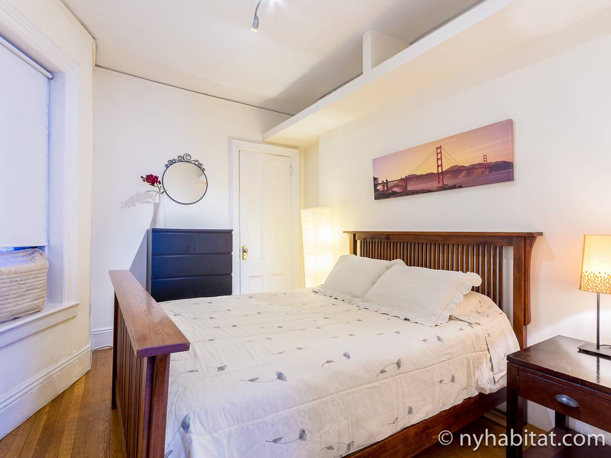 Cette location meublée avec l’air conditionné dispose d’un salon moderne avec un canapé convertible et une table. Veuillez noter que le canapé lit ne devrait pas utilisé comme solution de couchage permanente et n'offre pas le même confort qu'un matelas. Vous vous sentirez comme un vrai new yorkais en observant les tableaux accrochés aux murs, représentant les immeubles de Manhattan. Les deux fenêtres donnent sur les buildings alentours. Une cuisine indépendante dispose des équipements basiques ainsi que d’un four à micro-ondes et d’une table de style bistro. La chambre dispose d’un grand lit Queen, d’une armoire et d’une fenêtre. Une grande armoire est également disposée à côté de l’entrée de l’appartement. La salle de bain est dotée d’une baignoire/douche, de toilettes et d’un lavabo.