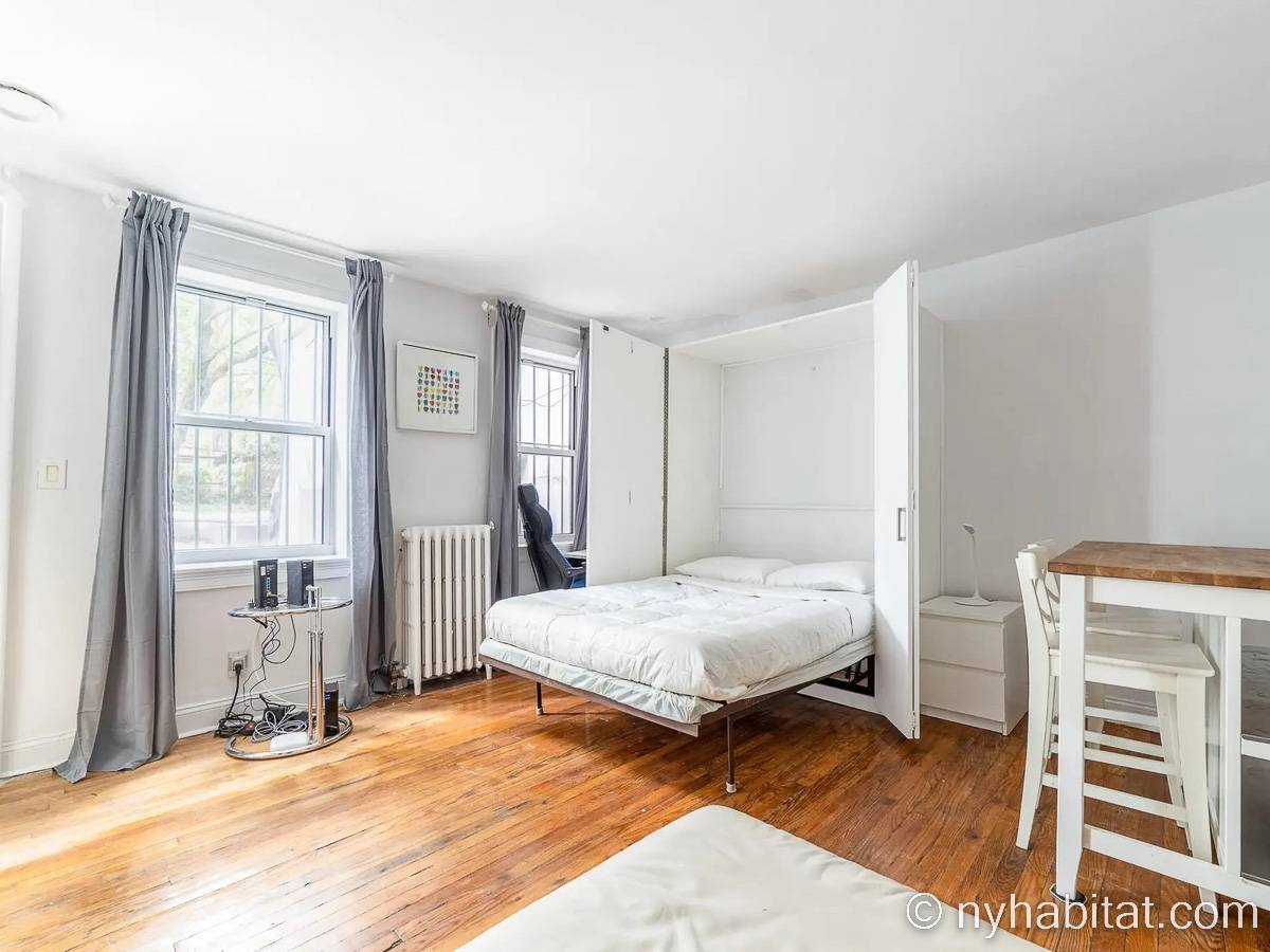 Situé au croisement de Hall Street et de Park Avenue, ce studio T1 se trouve au 1er étage (équivalent du rez-de-chaussée en Europe) d’une maison d’avant-guerre de 3 étages sans ascenseur. Il offre un cadre idéal pour les touristes souhaitant vivre comme un habitant de Brooklyn tout en dormant dans un quartier résidentiel calme et uni.