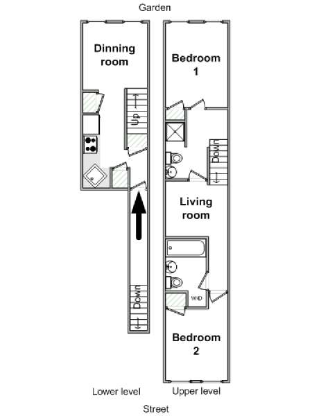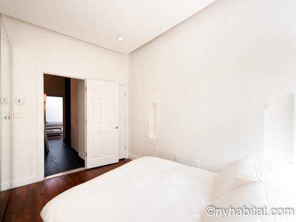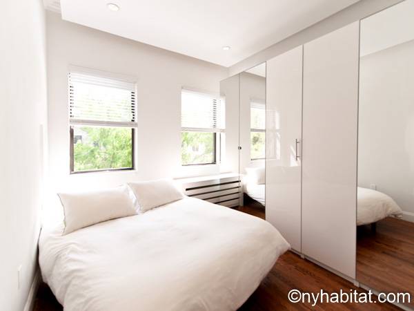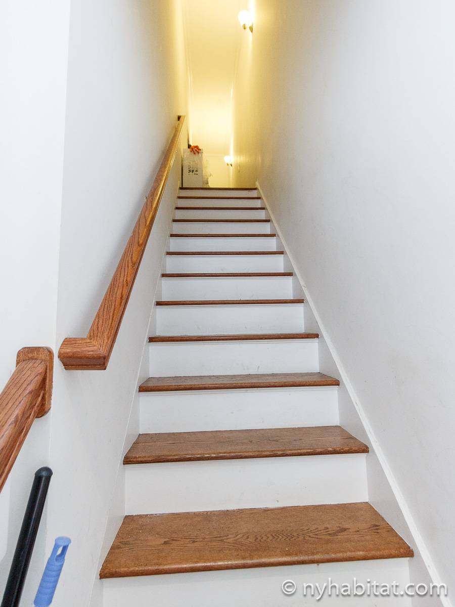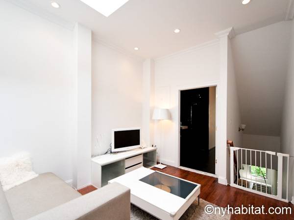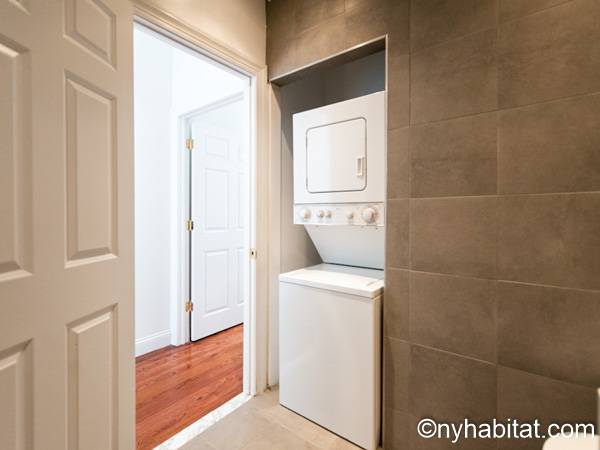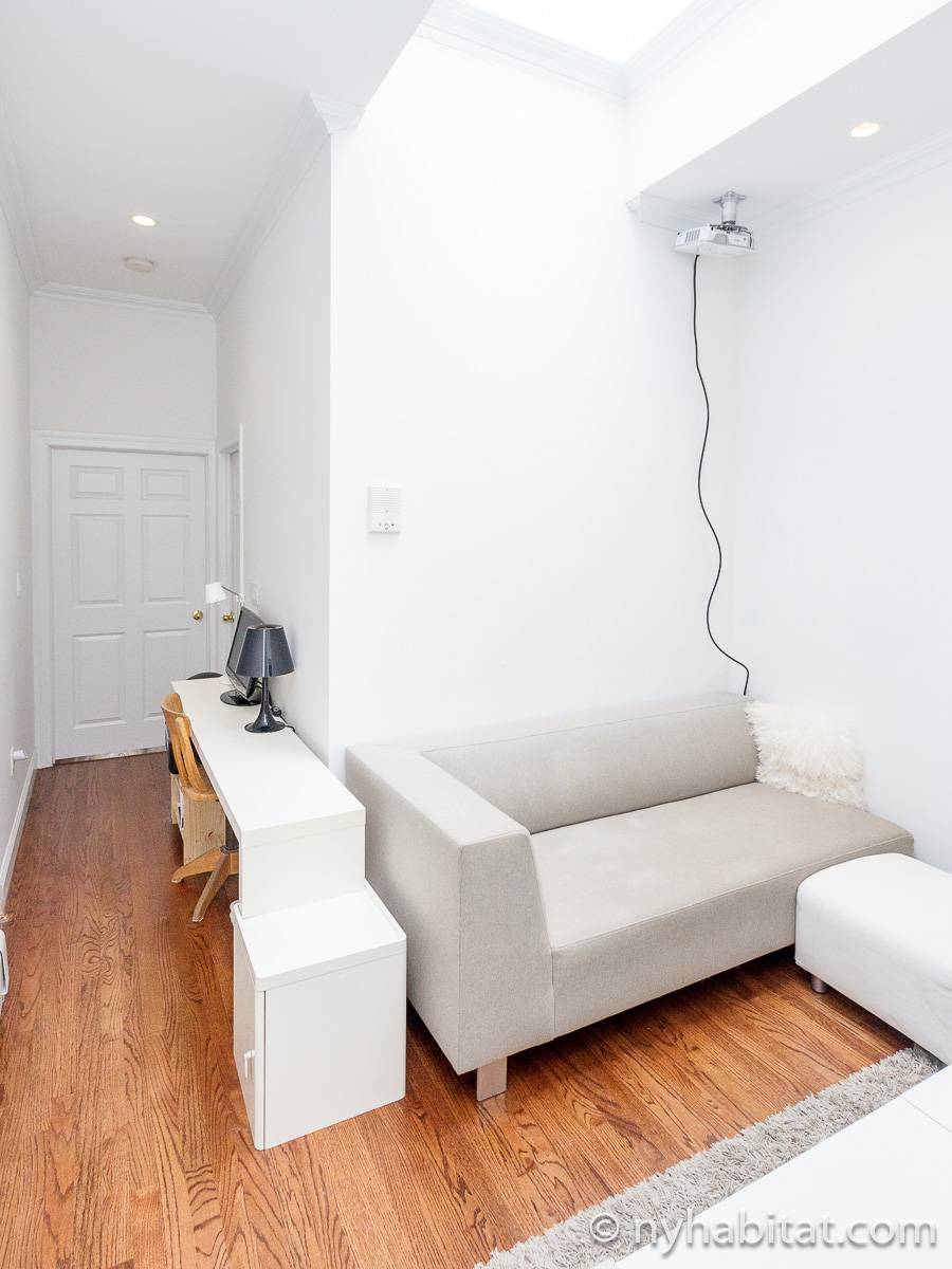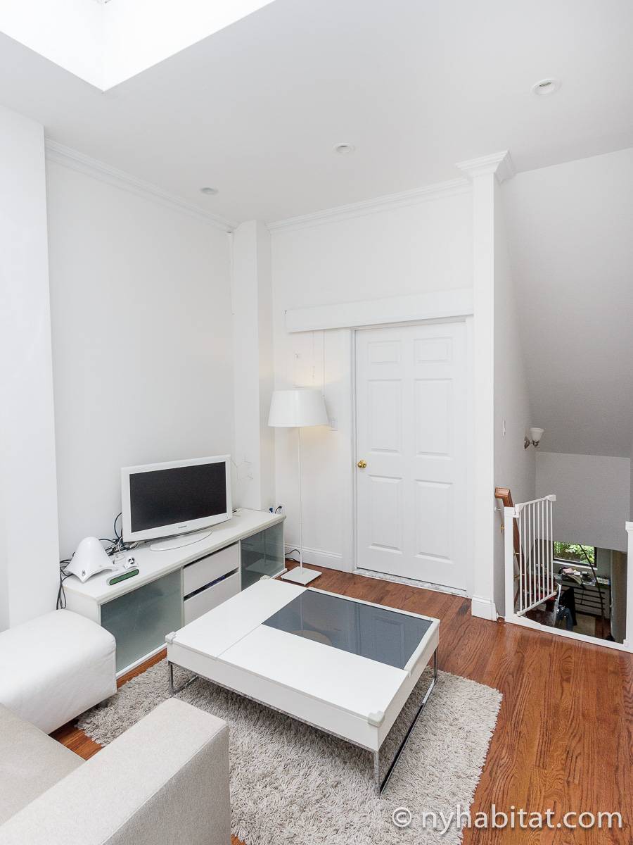 En haut, vous découvrirez un salon de 10 m² doté d’un canapé, d’une télévision avec lecteur DVD et d’un bureau pour ordinateur. La chambre 1 est de même taille que le salon et comprend un lit queen-size (160 cm de largeur) ainsi qu’un placard avec miroir et deux fenêtres donnant sur l’arrière-cour. La deuxième chambre est plus grande (14 m²) et dispose d’un lit simple (90 cm de largeur) offrant ainsi plus d’espace. Elle compte aussi un placard et des fenêtres donnant sur la 132ème rue. À cet étage, se trouvent également deux salles de bain, l’une étant équipée d’un lave-linge et d’un sèche-linge.