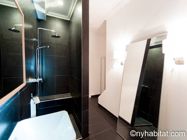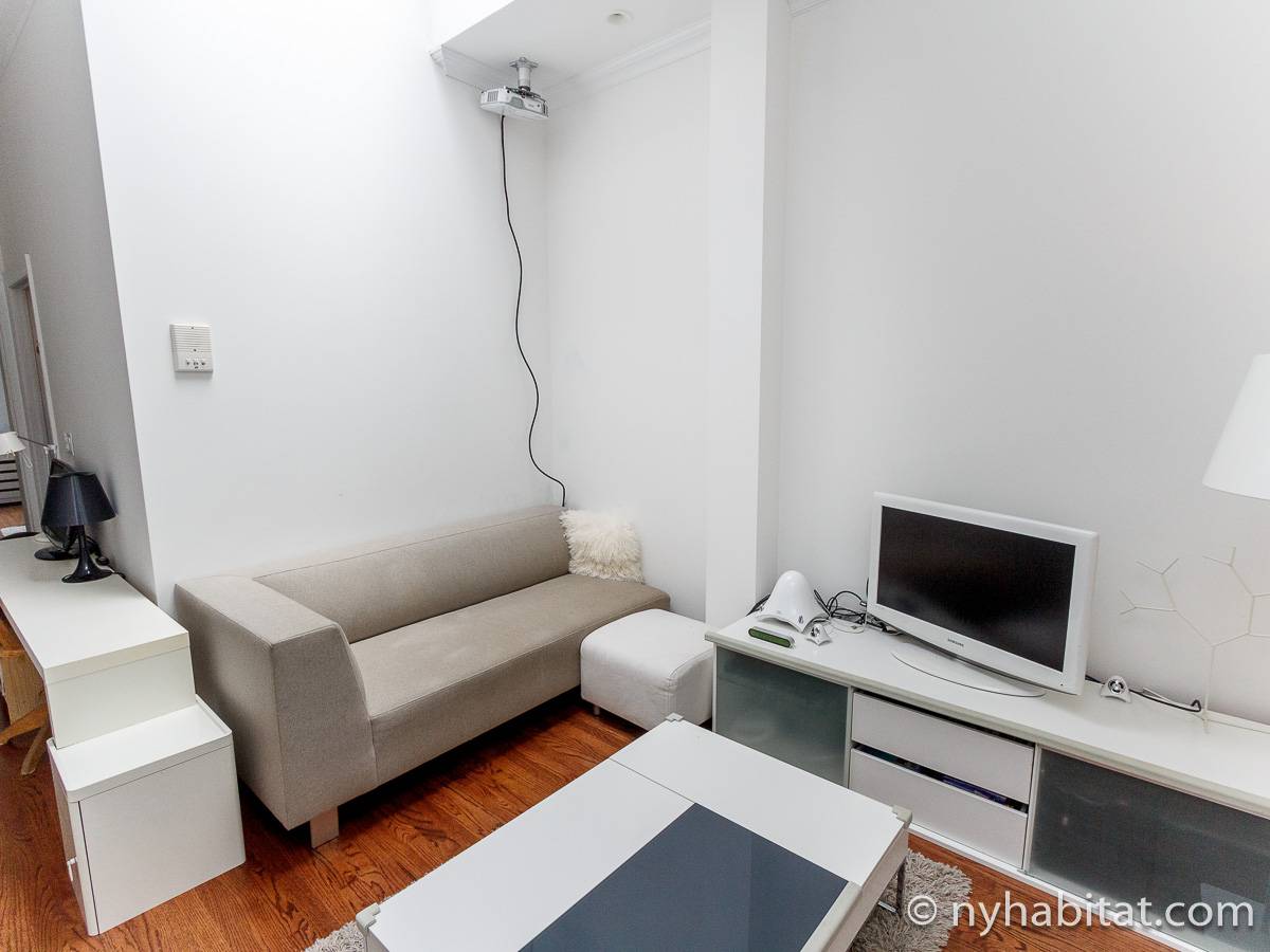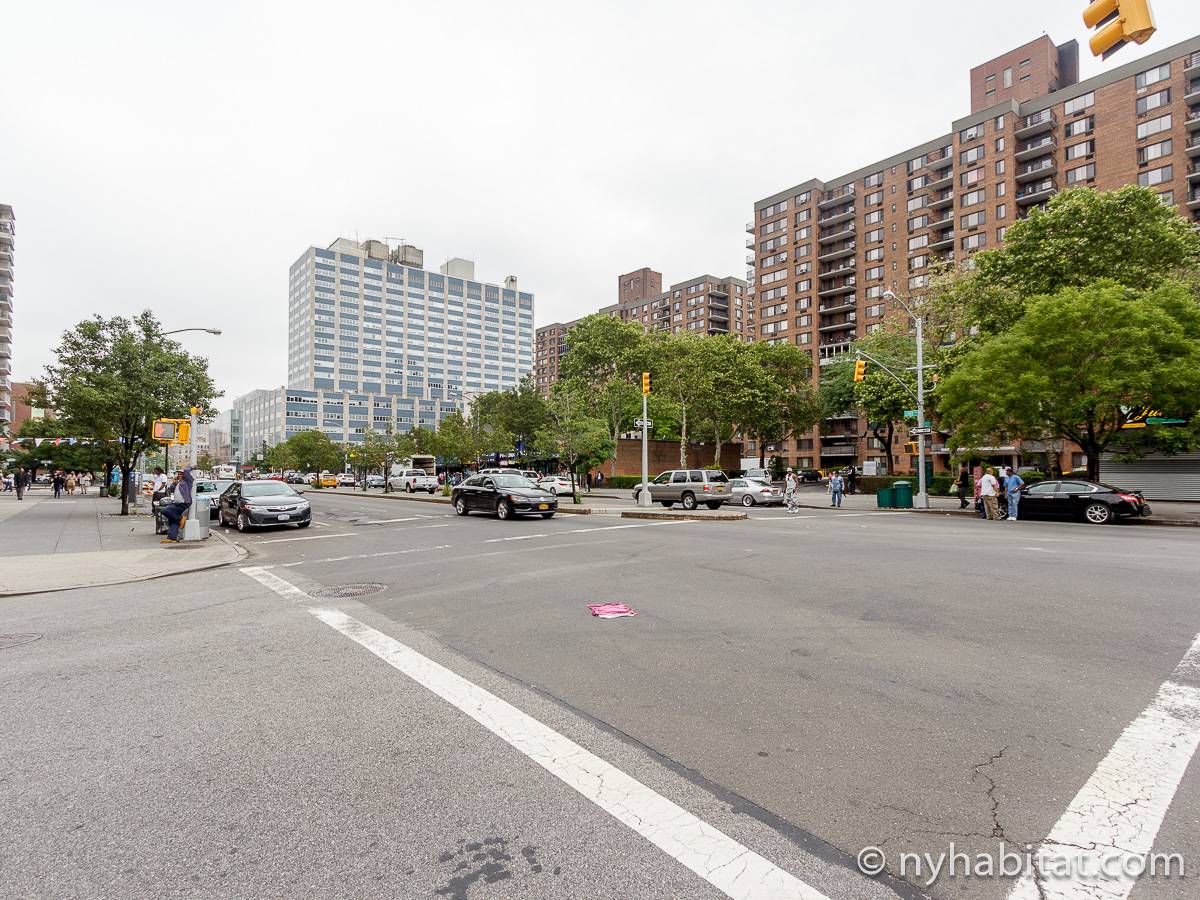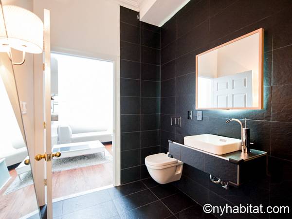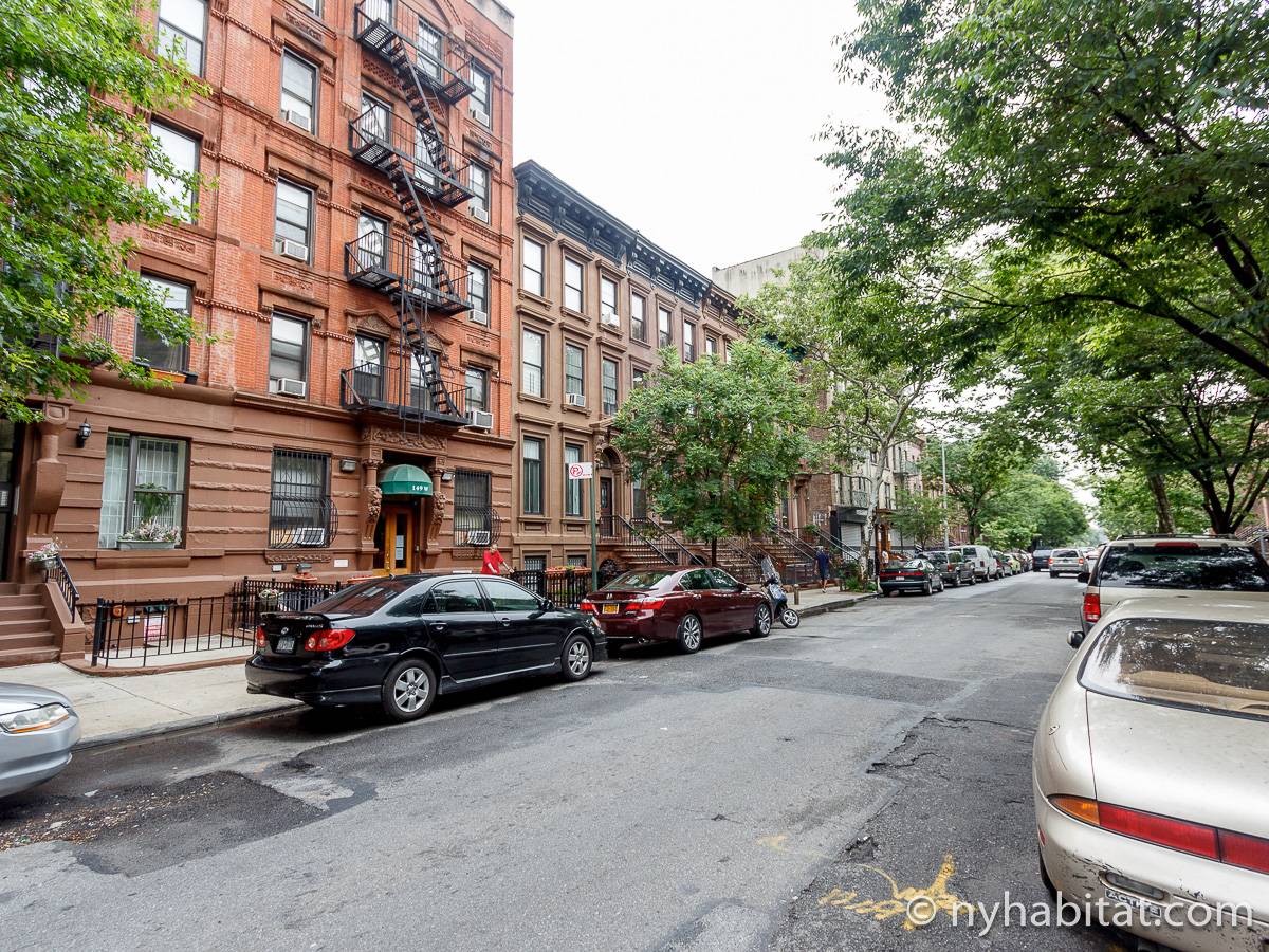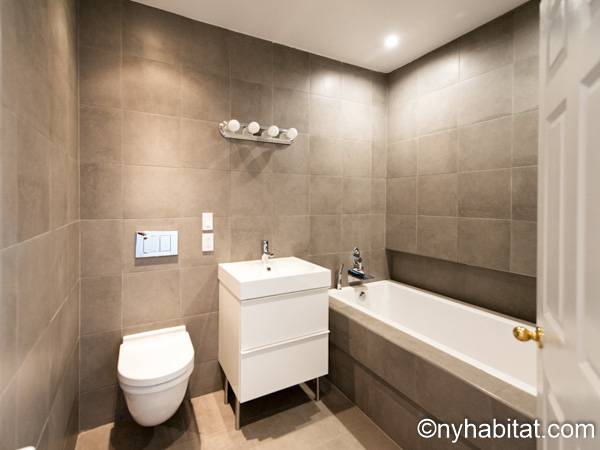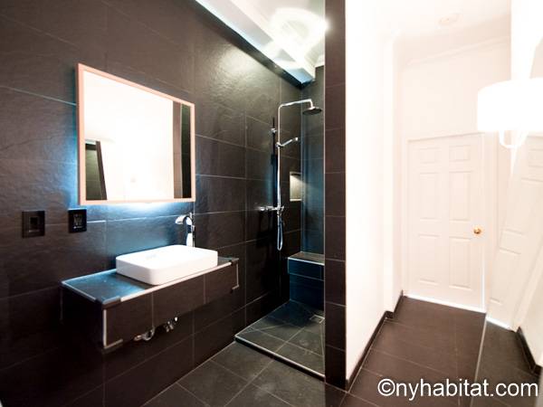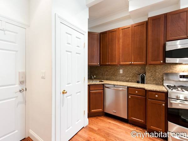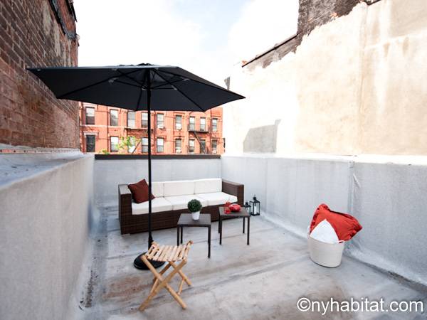 En haut, vous découvrirez un salon de 10 m² doté d’un canapé, d’une télévision avec lecteur DVD et d’un bureau pour ordinateur. La chambre 1 est de même taille que le salon et comprend un lit queen-size (160 cm de largeur) ainsi qu’un placard avec miroir et deux fenêtres donnant sur l’arrière-cour. La deuxième chambre est plus grande (14 m²) et dispose d’un lit simple (90 cm de largeur) offrant ainsi plus d’espace. Elle compte aussi un placard et des fenêtres donnant sur la 132ème rue. À cet étage, se trouvent également deux salles de bain, l’une étant équipée d’un lave-linge et d’un sèche-linge.