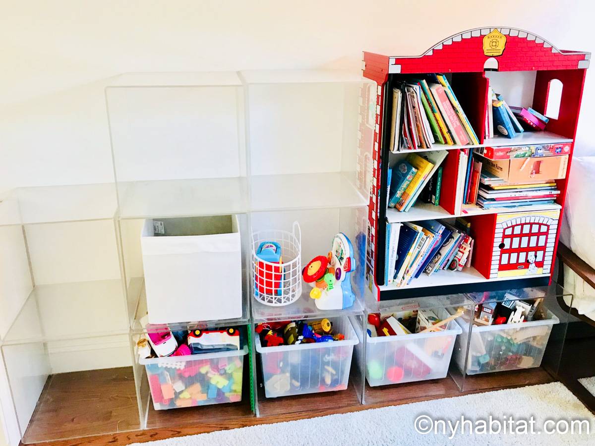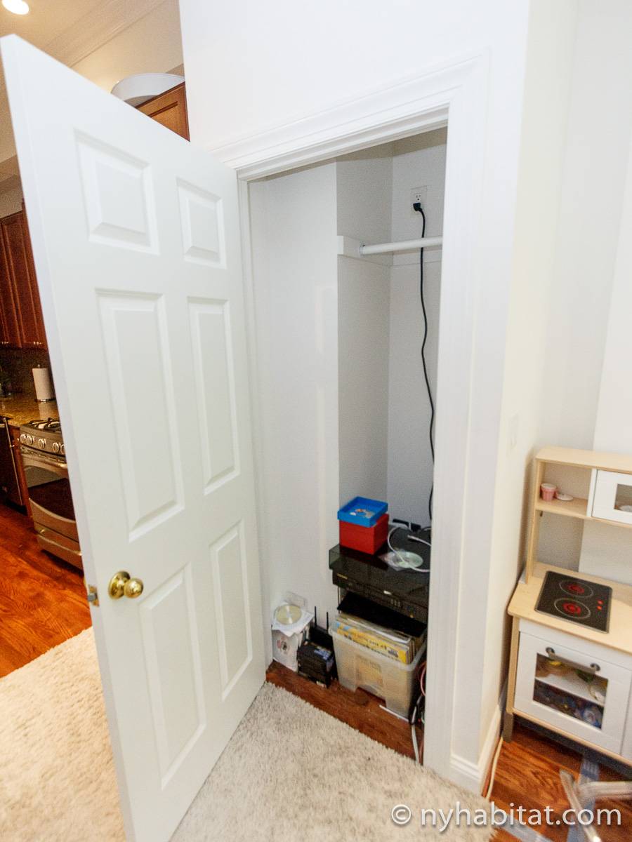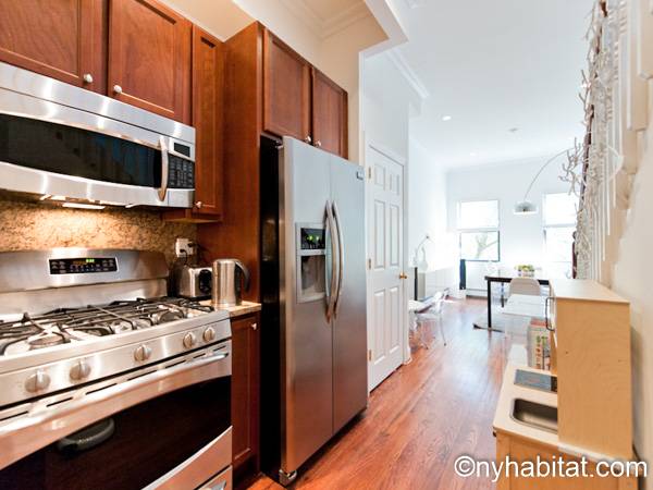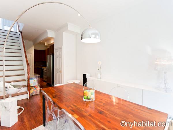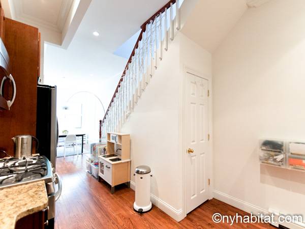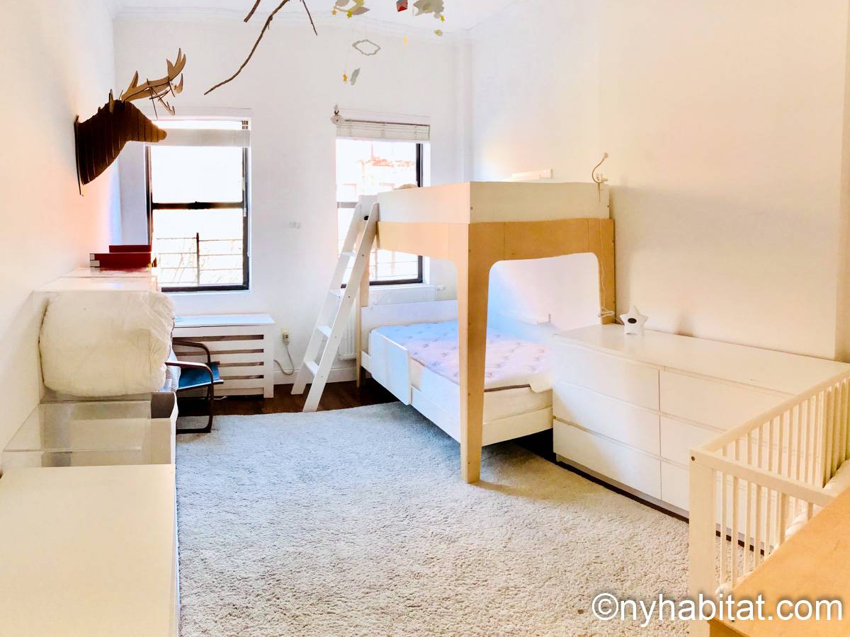 En haut, vous découvrirez un salon de 10 m² doté d’un canapé, d’une télévision avec lecteur DVD et d’un bureau pour ordinateur. La chambre 1 est de même taille que le salon et comprend un lit queen-size (160 cm de largeur) ainsi qu’un placard avec miroir et deux fenêtres donnant sur l’arrière-cour. La deuxième chambre est plus grande (14 m²) et dispose d’un lit superposé (90 cm de largeur) offrant ainsi plus d’espace. Elle compte aussi un placard et des fenêtres donnant sur la 132ème rue. À cet étage, se trouvent également deux salles de bain, l’une étant équipée d’un lave-linge et d’un sèche-linge.