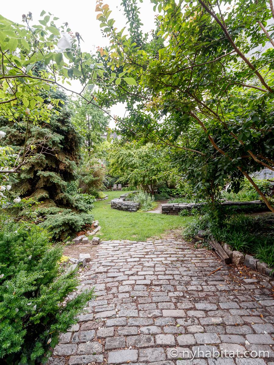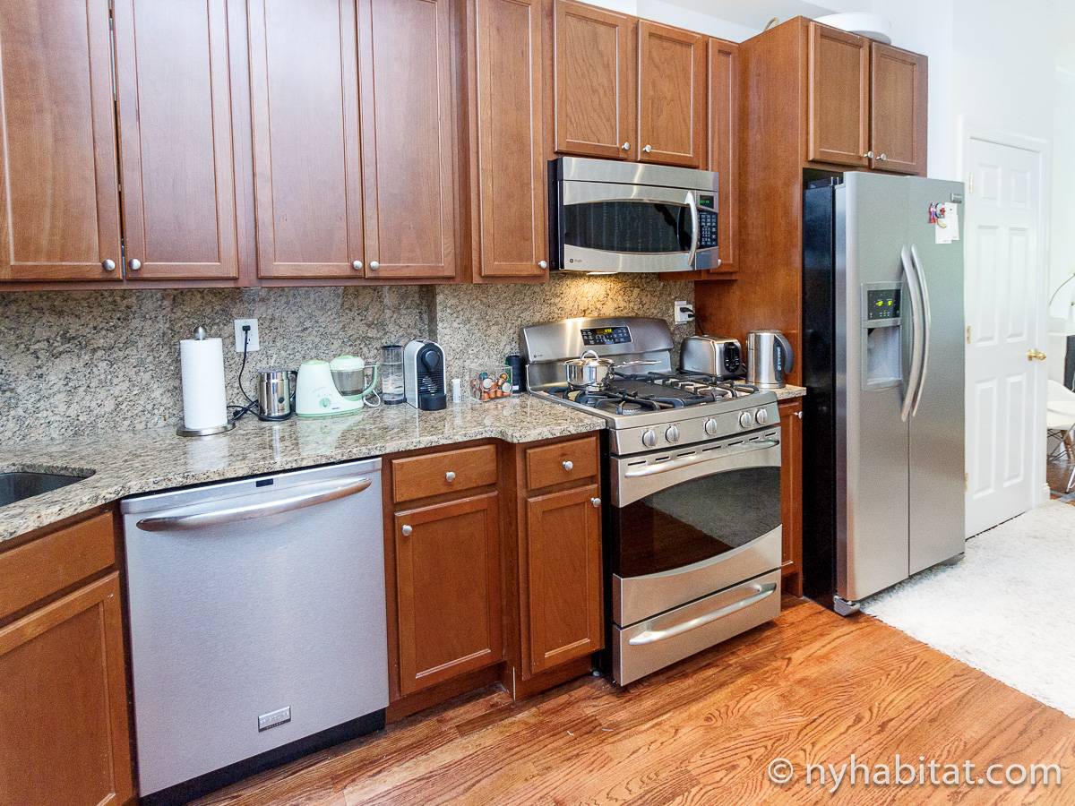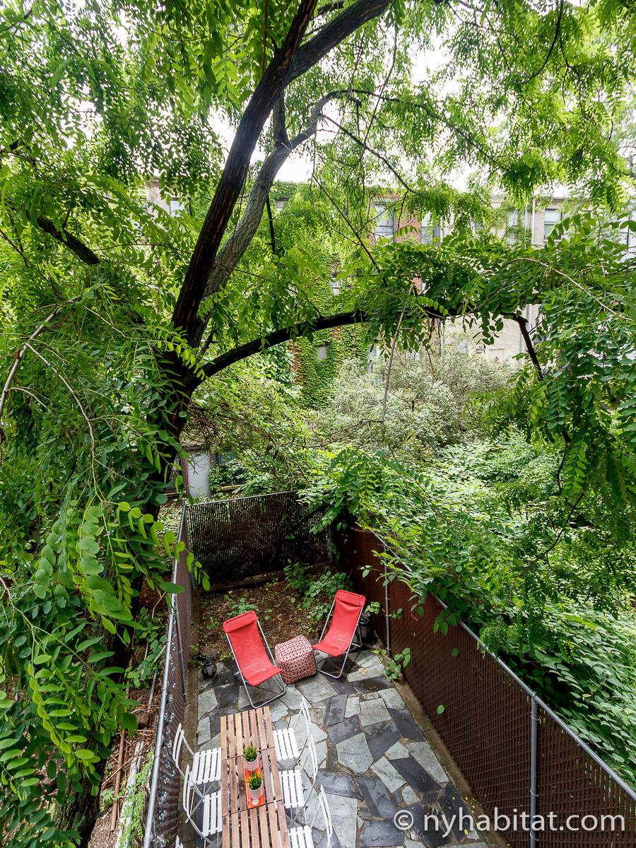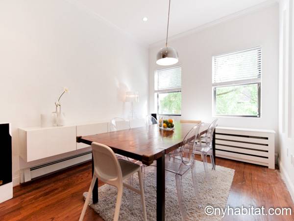 En haut, vous découvrirez un salon de 10 m² doté d’un canapé, d’une télévision avec lecteur DVD et d’un bureau pour ordinateur. La chambre 1 est de même taille que le salon et comprend un lit queen-size (160 cm de largeur) ainsi qu’un placard avec miroir et deux fenêtres donnant sur l’arrière-cour. La deuxième chambre est plus grande (14 m²) et dispose d’un lit superposé (90 cm de largeur) offrant ainsi plus d’espace. Elle compte aussi un placard et des fenêtres donnant sur la 132ème rue. À cet étage, se trouvent également deux salles de bain, l’une étant équipée d’un lave-linge et d’un sèche-linge.