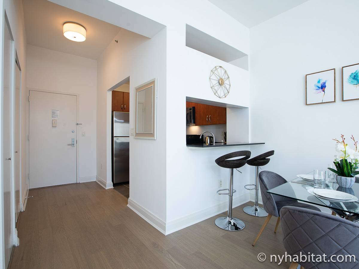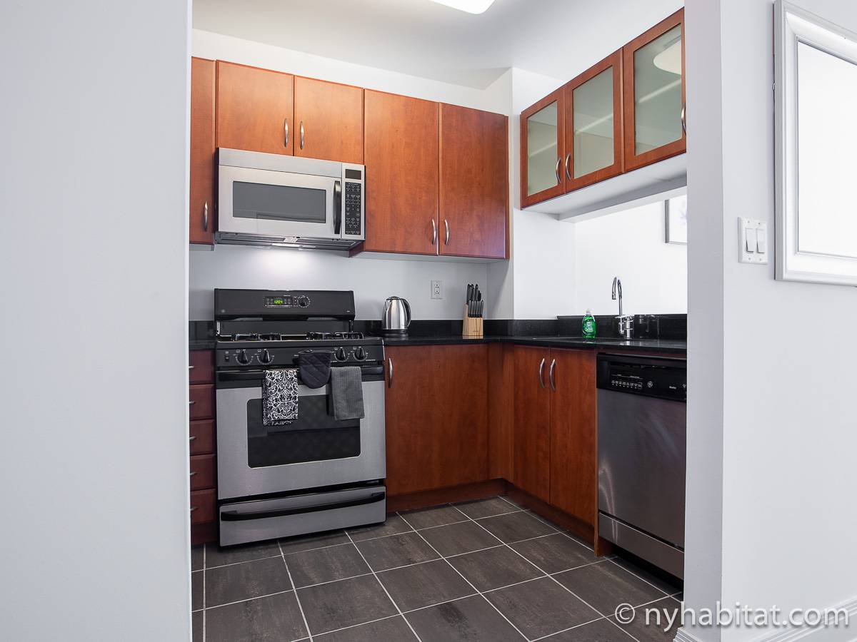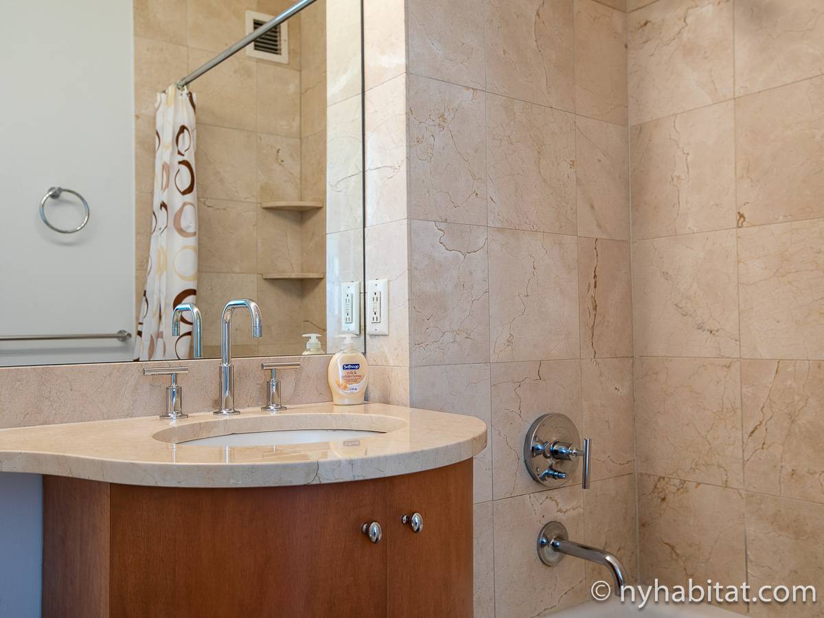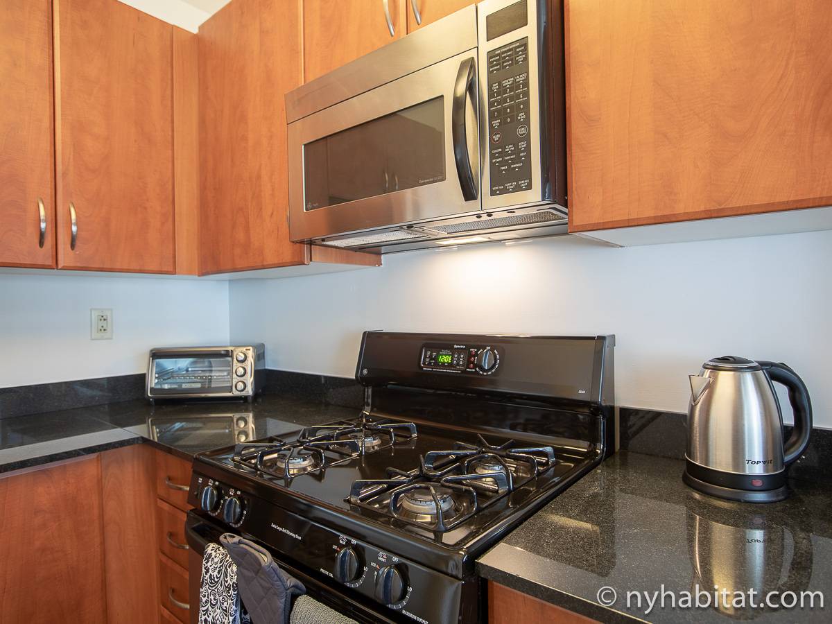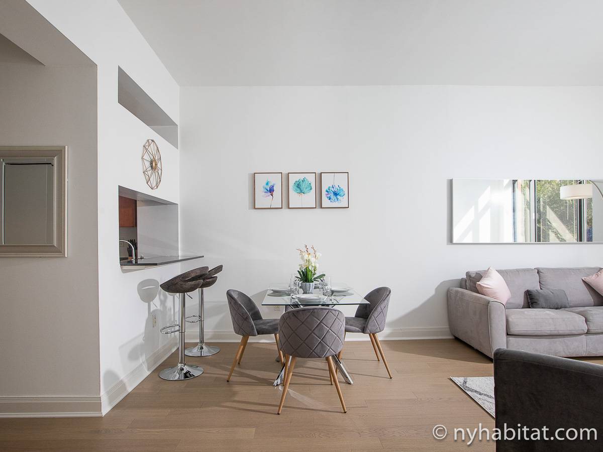 Cet appartement T2 meublé à New York est décoré avec goût dans des tons gris et blancs. Le salon est doté d’une grande fenêtre éclairant naturellement la pièce, pendant que vous êtes confortablement installé sur le canapé à regarder vos séries préférées sur la télé écran plat. Une table pour quatre est à votre disposition afin que vous puissiez inviter vos amis à dîner, maintenant que vous avez une cuisine entièrement équipée à votre disposition. La cuisine dispose d’un plan de travail qui donne sur le salon avec des tabourets sur lesquels vous installer pour un repas détendu. Dotée de placards en bois de cerisier et d’électroménager en inox, la cuisine dispose aussi d’avantages comme un lave-vaisselle qui vous faciliteront la réception. La chambre est meublée d’un lit Queen size et d’une grande fenêtre ainsi que de nombreux placards pour vos affaires. Des draps et serviettes sont fournis, et le Wi-Fi est disponible dans l’ensemble de l’appartement. La salle de bain carrelée en marbre est équipée d’une baignoire-douche, d’un grand miroir et d’un lavabo avec un placard de rangement en-dessous.