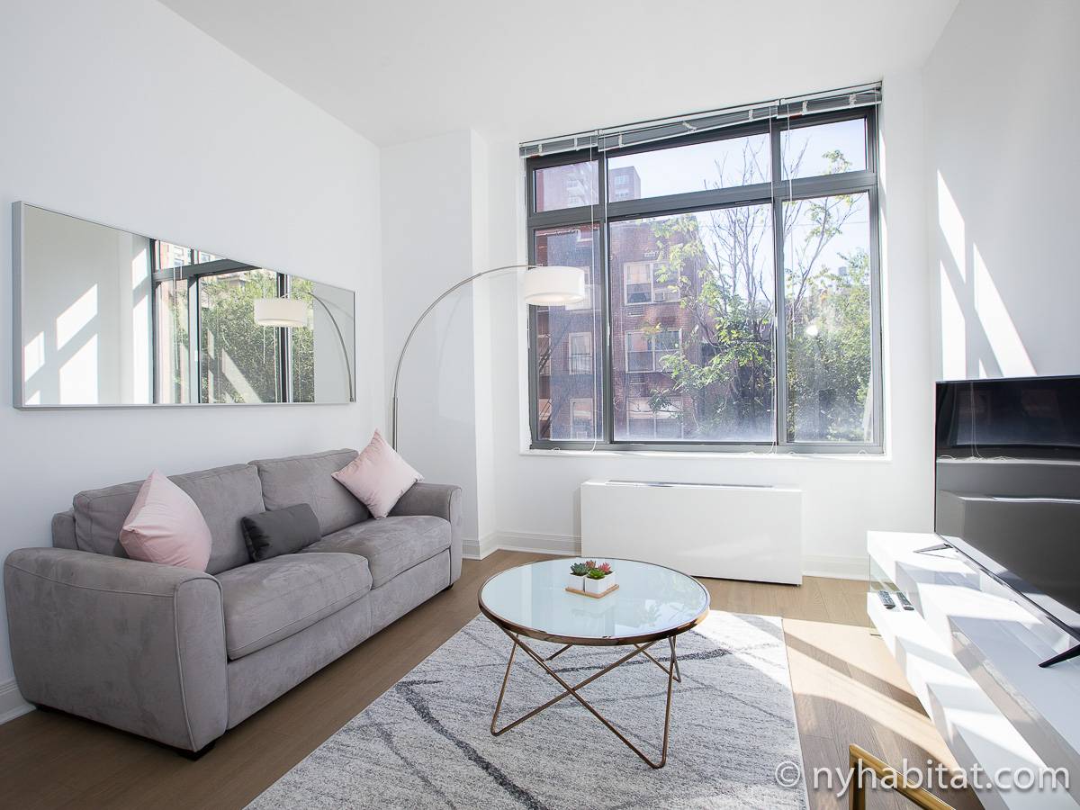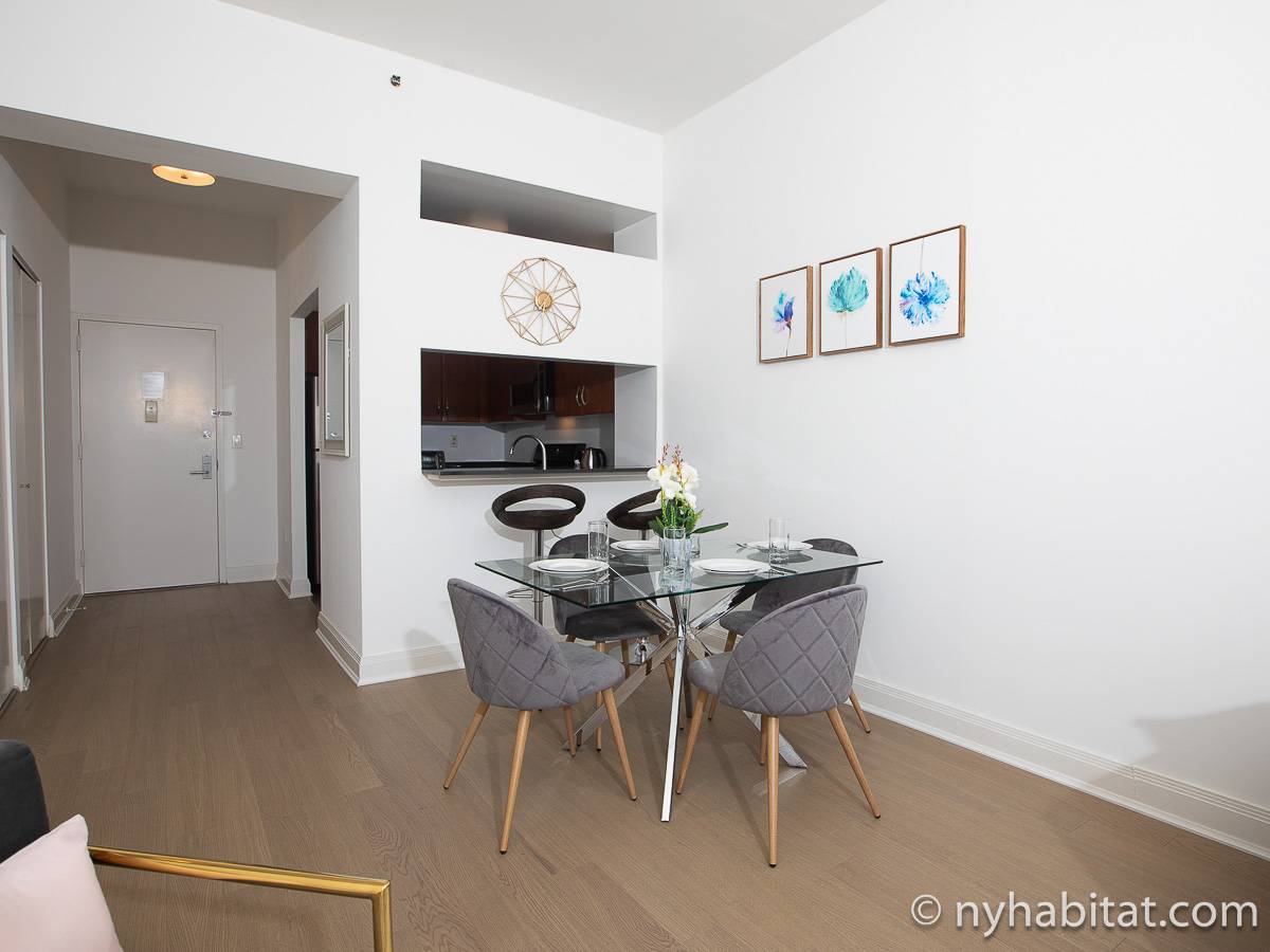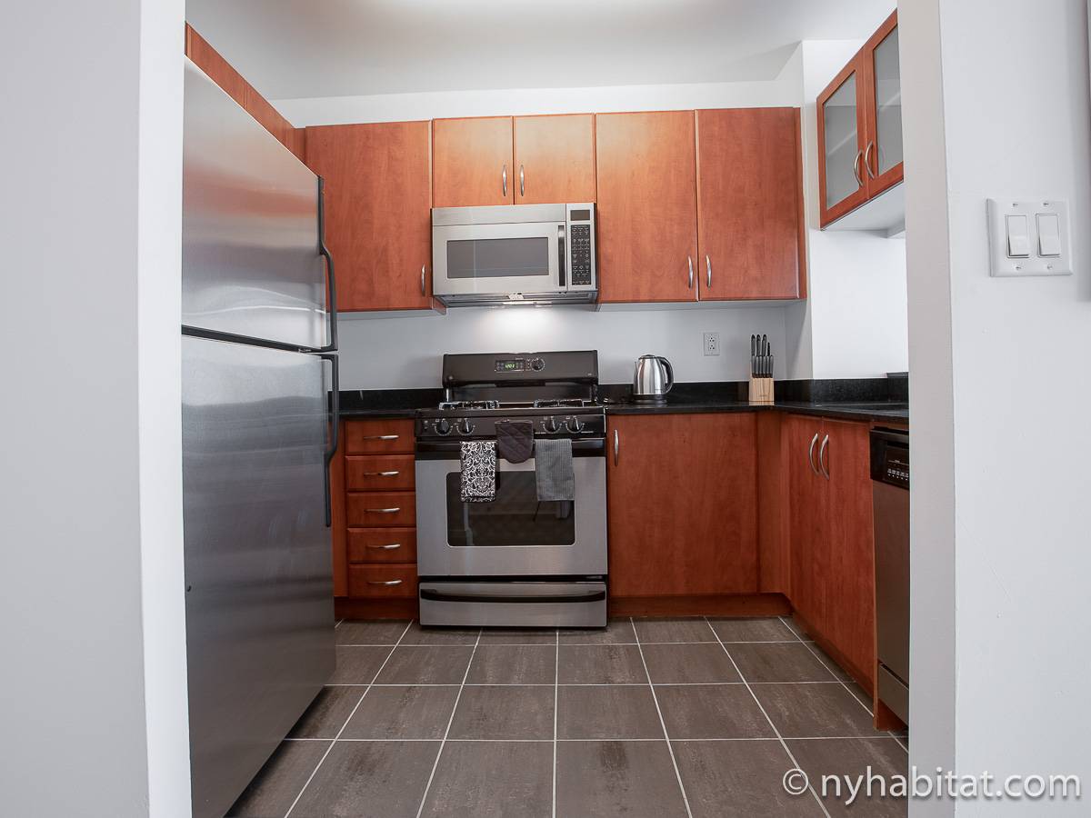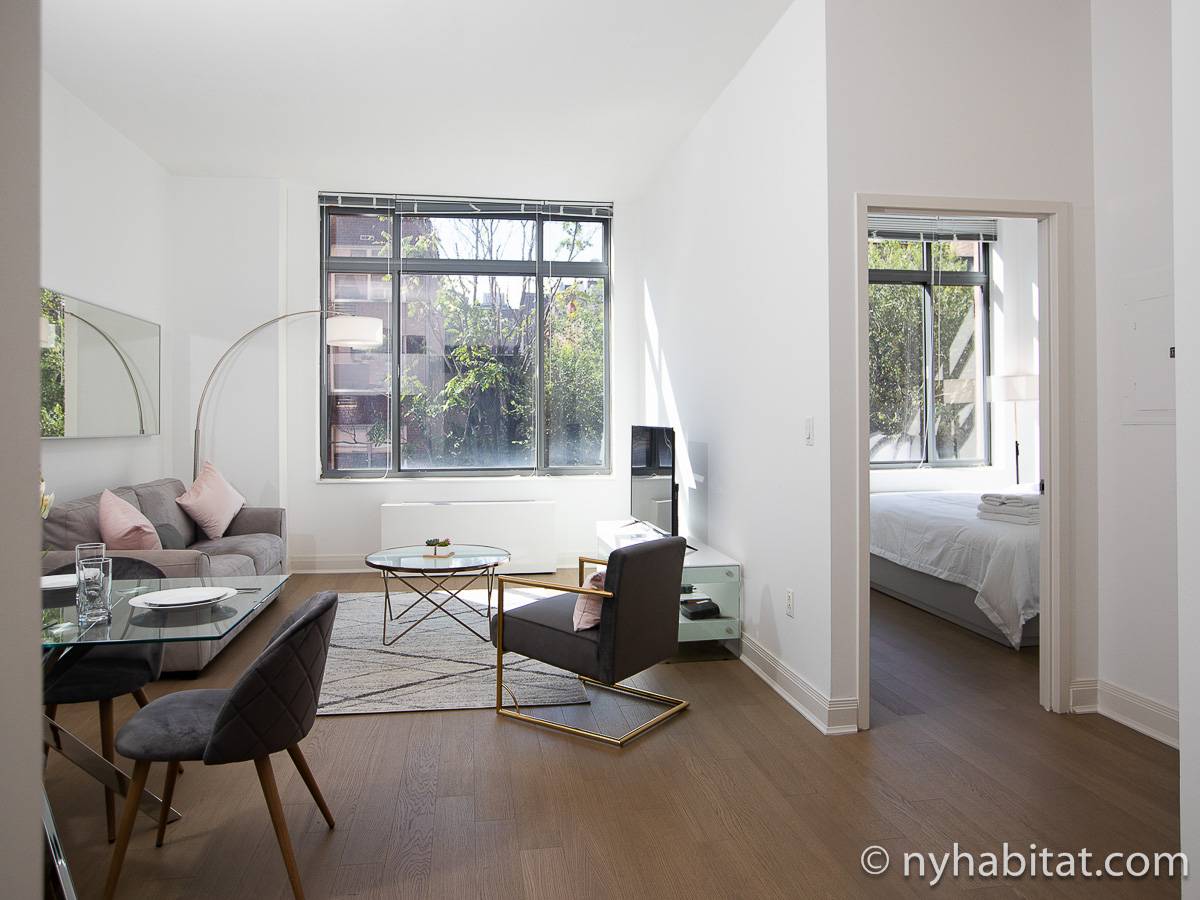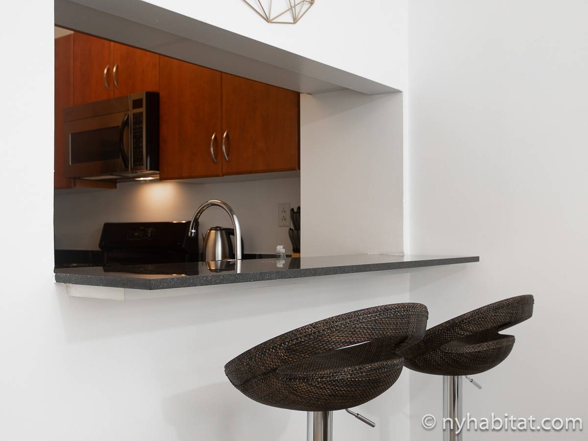 Cet appartement T2 meublé à New York est décoré avec goût dans des tons gris et blancs. Le salon est doté d’une grande fenêtre éclairant naturellement la pièce, pendant que vous êtes confortablement installé sur le canapé à regarder vos séries préférées sur la télé écran plat. Une table pour quatre est à votre disposition afin que vous puissiez inviter vos amis à dîner, maintenant que vous avez une cuisine entièrement équipée à votre disposition. La cuisine dispose d’un plan de travail qui donne sur le salon avec des tabourets sur lesquels vous installer pour un repas détendu. Dotée de placards en bois de cerisier et d’électroménager en inox, la cuisine dispose aussi d’avantages comme un lave-vaisselle qui vous faciliteront la réception. La chambre est meublée d’un lit Queen size et d’une grande fenêtre ainsi que de nombreux placards pour vos affaires. Des draps et serviettes sont fournis, et le Wi-Fi est disponible dans l’ensemble de l’appartement. La salle de bain carrelée en marbre est équipée d’une baignoire-douche, d’un grand miroir et d’un lavabo avec un placard de rangement en-dessous.