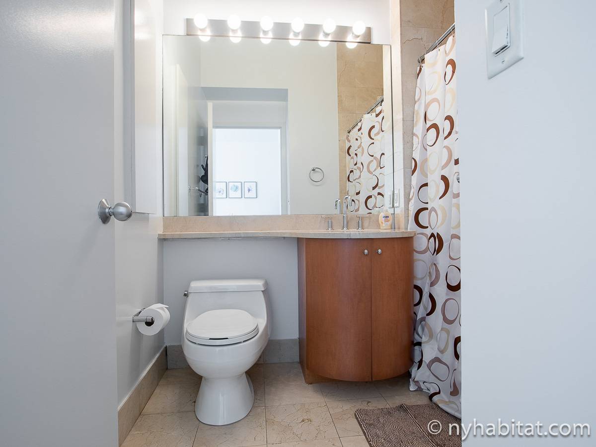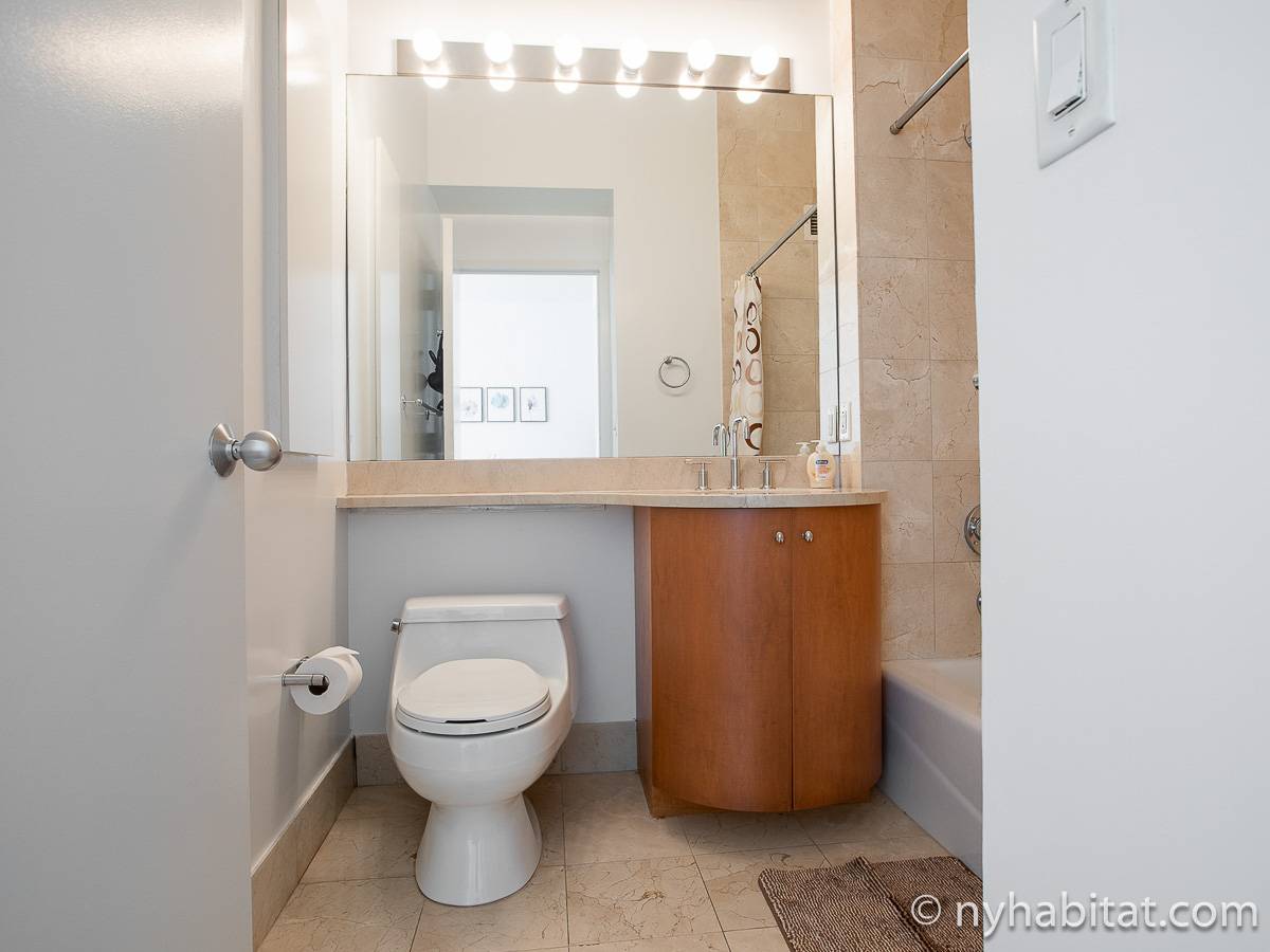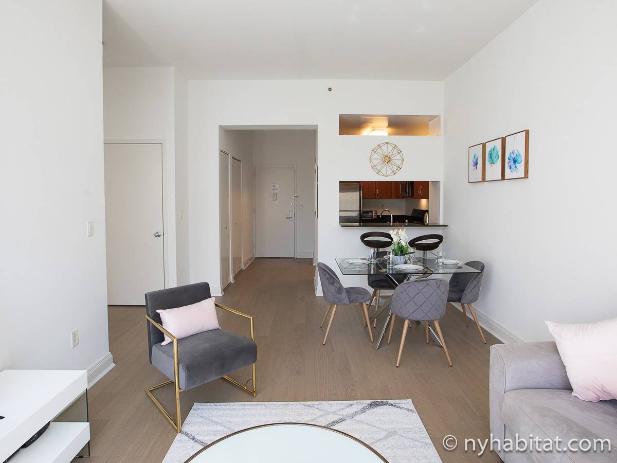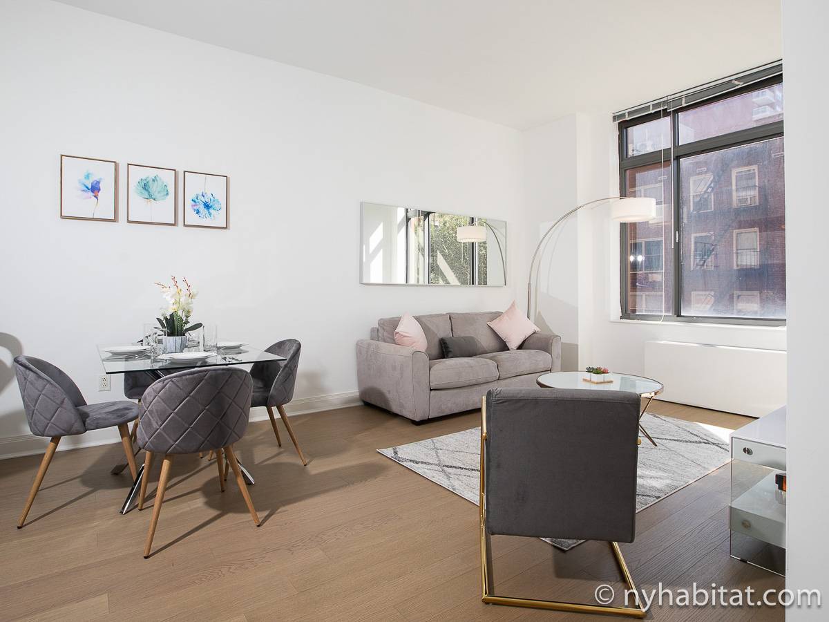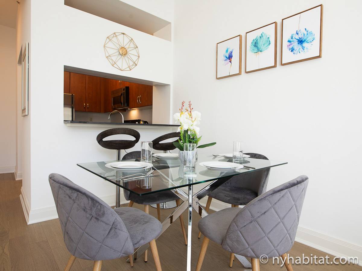 Cet appartement T2 meublé à New York est décoré avec goût dans des tons gris et blancs. Le salon est doté d’une grande fenêtre éclairant naturellement la pièce, pendant que vous êtes confortablement installé sur le canapé à regarder vos séries préférées sur la télé écran plat. Une table pour quatre est à votre disposition afin que vous puissiez inviter vos amis à dîner, maintenant que vous avez une cuisine entièrement équipée à votre disposition. La cuisine dispose d’un plan de travail qui donne sur le salon avec des tabourets sur lesquels vous installer pour un repas détendu. Dotée de placards en bois de cerisier et d’électroménager en inox, la cuisine dispose aussi d’avantages comme un lave-vaisselle qui vous faciliteront la réception. La chambre est meublée d’un lit Queen size et d’une grande fenêtre ainsi que de nombreux placards pour vos affaires. Des draps et serviettes sont fournis, et le Wi-Fi est disponible dans l’ensemble de l’appartement. La salle de bain carrelée en marbre est équipée d’une baignoire-douche, d’un grand miroir et d’un lavabo avec un placard de rangement en-dessous.
