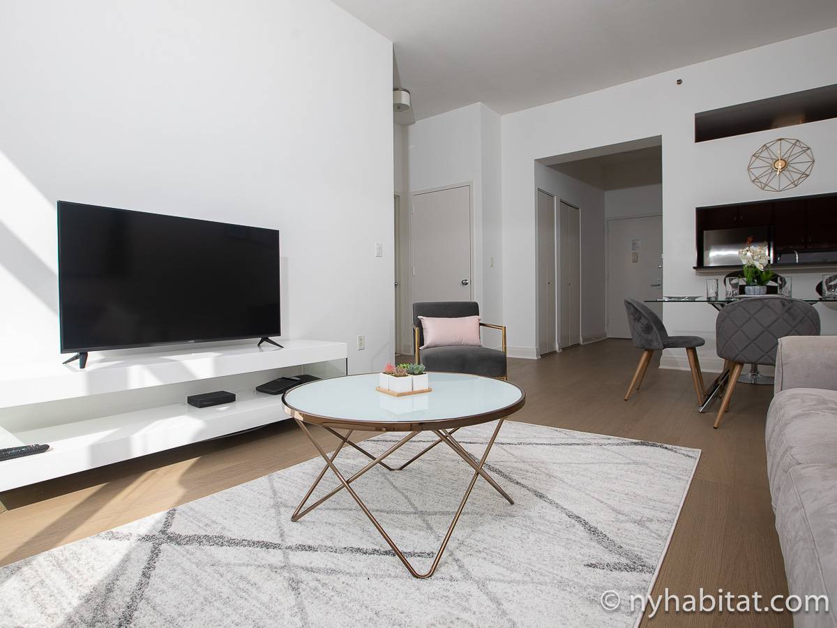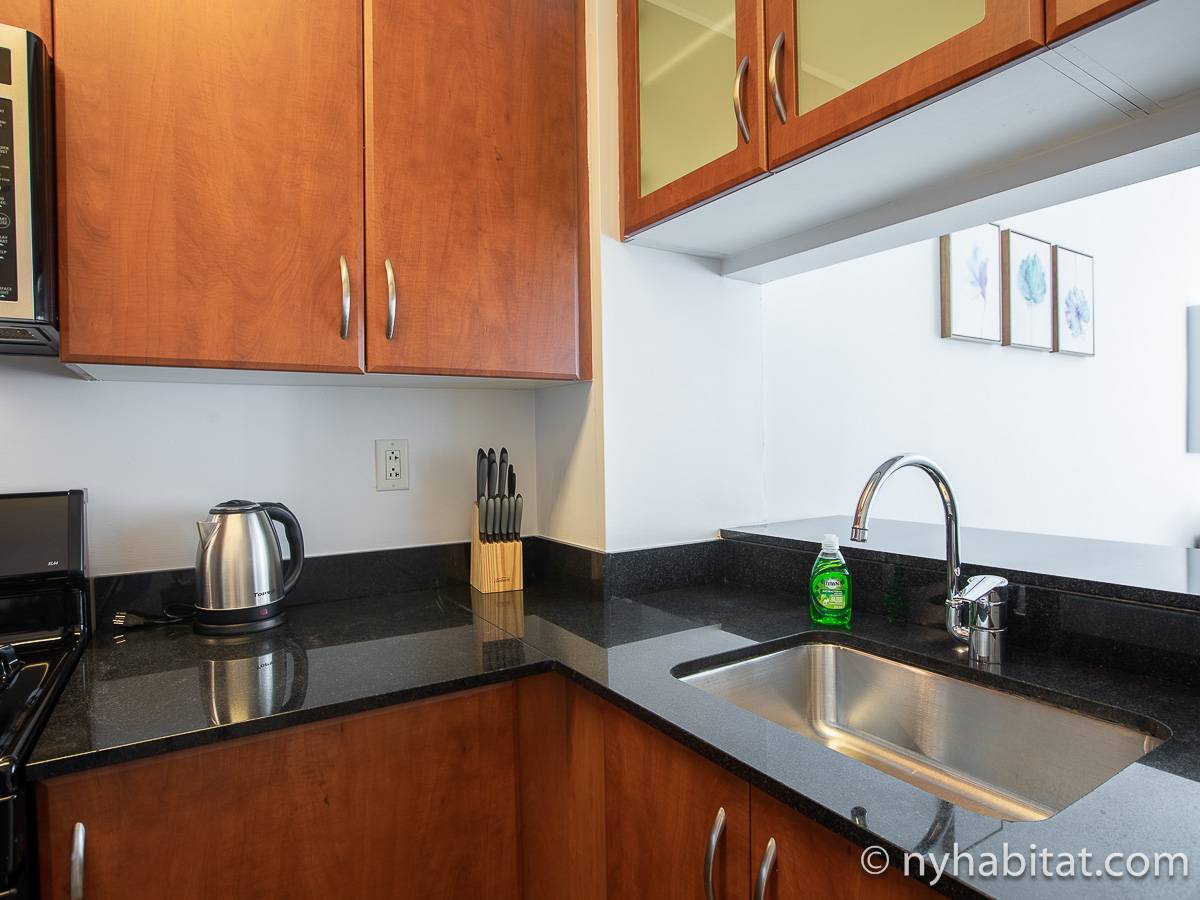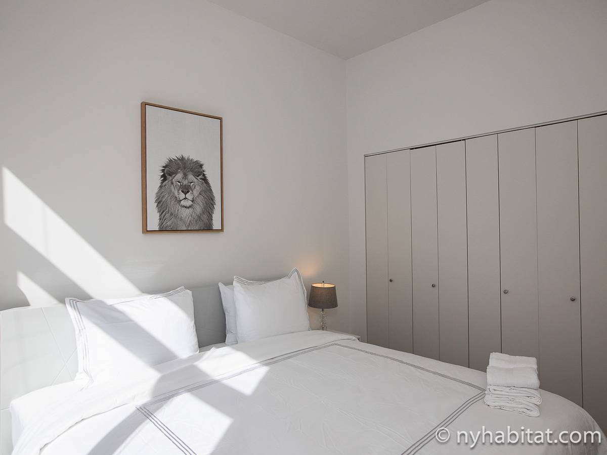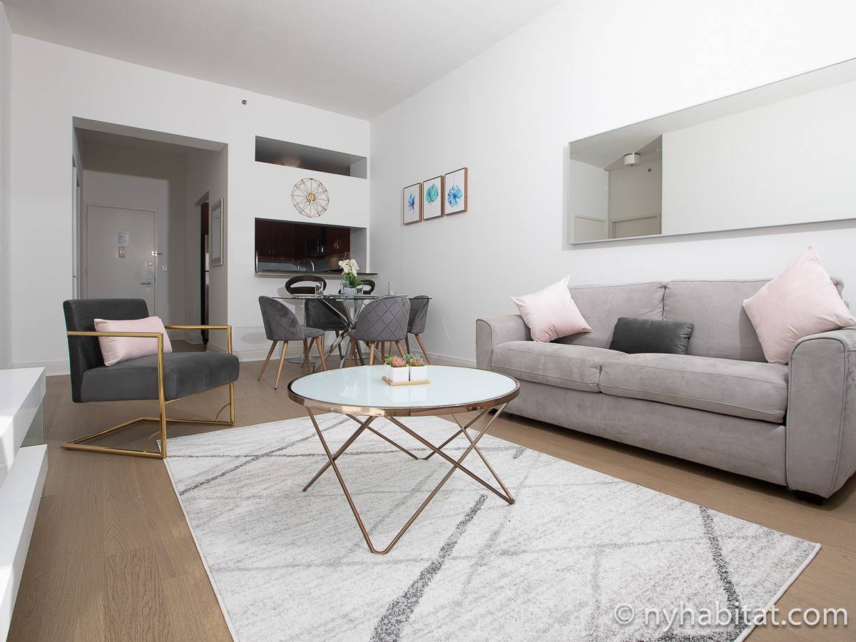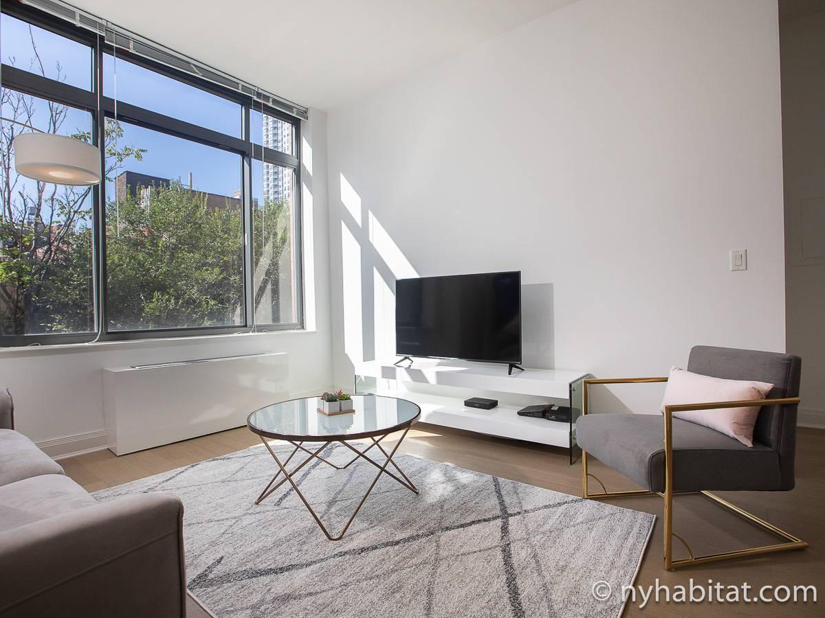 Cet appartement T2 meublé à New York est décoré avec goût dans des tons gris et blancs. Le salon est doté d’une grande fenêtre éclairant naturellement la pièce, pendant que vous êtes confortablement installé sur le canapé à regarder vos séries préférées sur la télé écran plat. Une table pour quatre est à votre disposition afin que vous puissiez inviter vos amis à dîner, maintenant que vous avez une cuisine entièrement équipée à votre disposition. La cuisine dispose d’un plan de travail qui donne sur le salon avec des tabourets sur lesquels vous installer pour un repas détendu. Dotée de placards en bois de cerisier et d’électroménager en inox, la cuisine dispose aussi d’avantages comme un lave-vaisselle qui vous faciliteront la réception. La chambre est meublée d’un lit Queen size et d’une grande fenêtre ainsi que de nombreux placards pour vos affaires. Des draps et serviettes sont fournis, et le Wi-Fi est disponible dans l’ensemble de l’appartement. La salle de bain carrelée en marbre est équipée d’une baignoire-douche, d’un grand miroir et d’un lavabo avec un placard de rangement en-dessous.