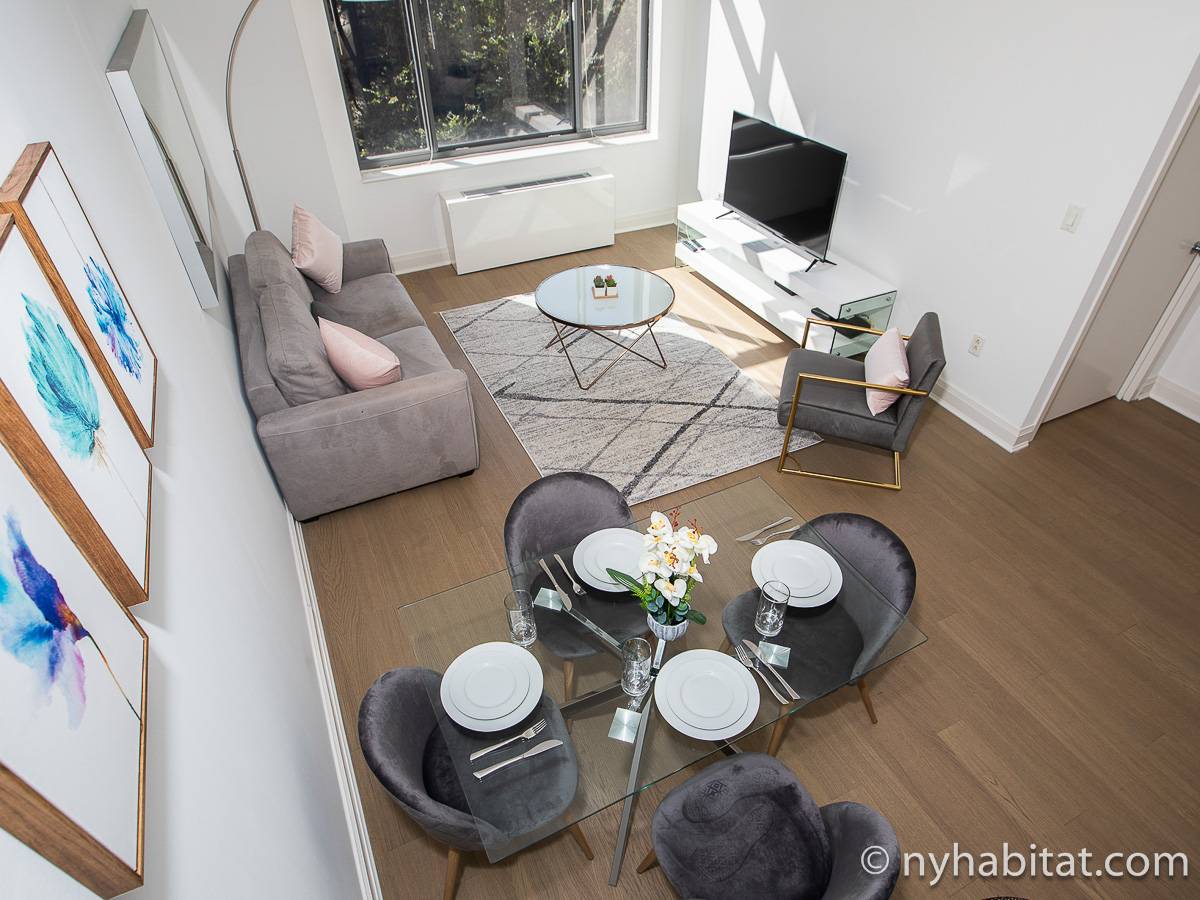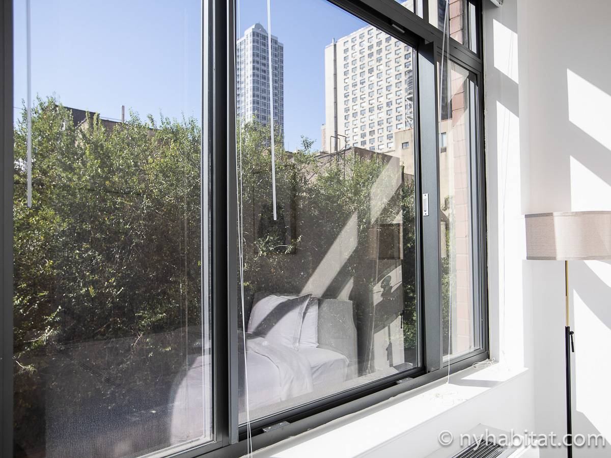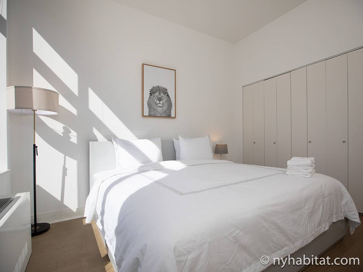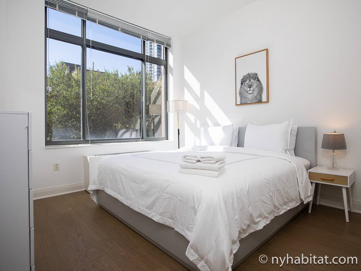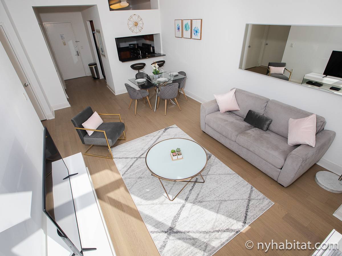 Cet appartement T2 meublé à New York est décoré avec goût dans des tons gris et blancs. Le salon est doté d’une grande fenêtre éclairant naturellement la pièce, pendant que vous êtes confortablement installé sur le canapé à regarder vos séries préférées sur la télé écran plat. Une table pour quatre est à votre disposition afin que vous puissiez inviter vos amis à dîner, maintenant que vous avez une cuisine entièrement équipée à votre disposition. La cuisine dispose d’un plan de travail qui donne sur le salon avec des tabourets sur lesquels vous installer pour un repas détendu. Dotée de placards en bois de cerisier et d’électroménager en inox, la cuisine dispose aussi d’avantages comme un lave-vaisselle qui vous faciliteront la réception. La chambre est meublée d’un lit Queen size et d’une grande fenêtre ainsi que de nombreux placards pour vos affaires. Des draps et serviettes sont fournis, et le Wi-Fi est disponible dans l’ensemble de l’appartement. La salle de bain carrelée en marbre est équipée d’une baignoire-douche, d’un grand miroir et d’un lavabo avec un placard de rangement en-dessous.