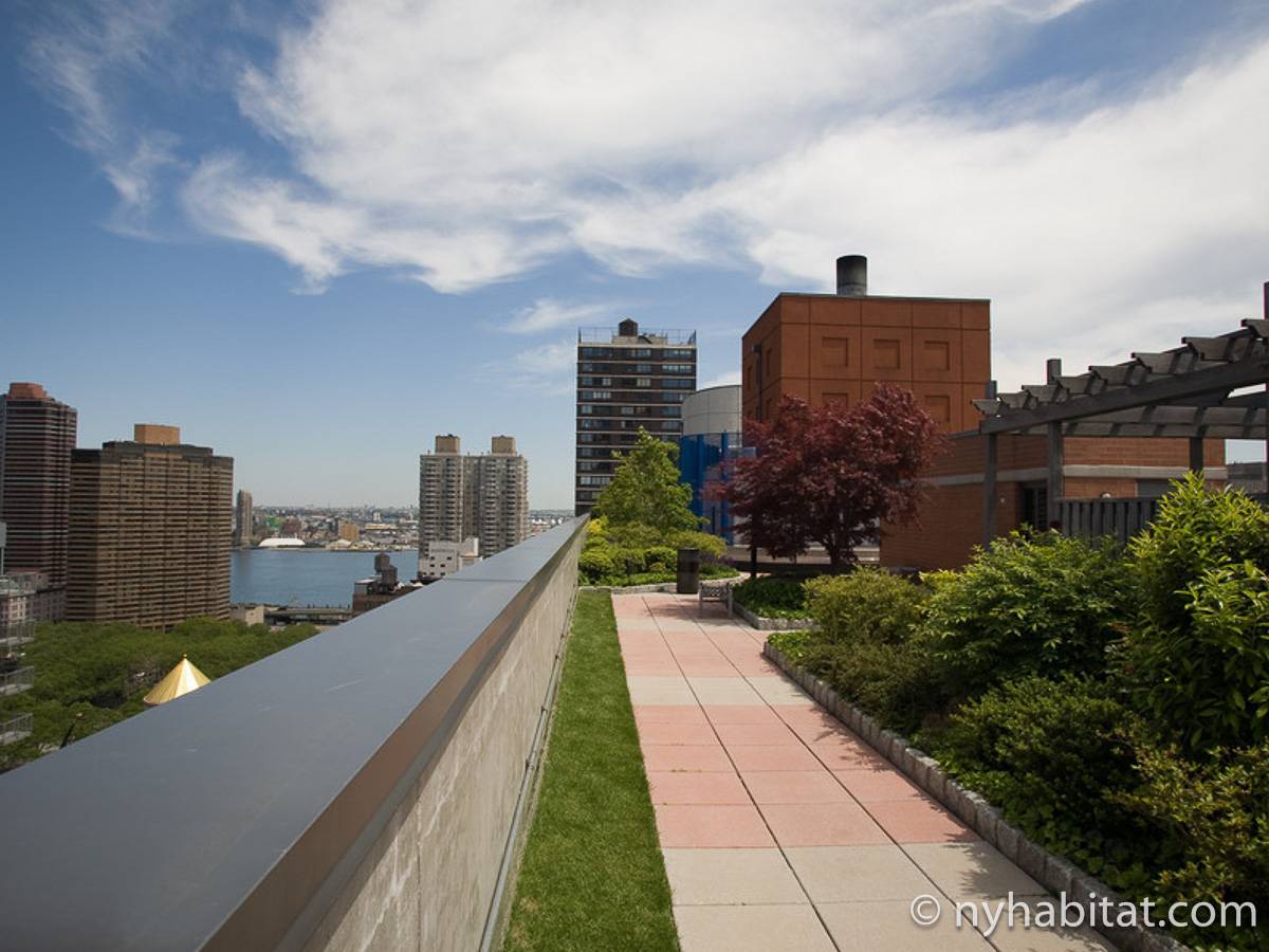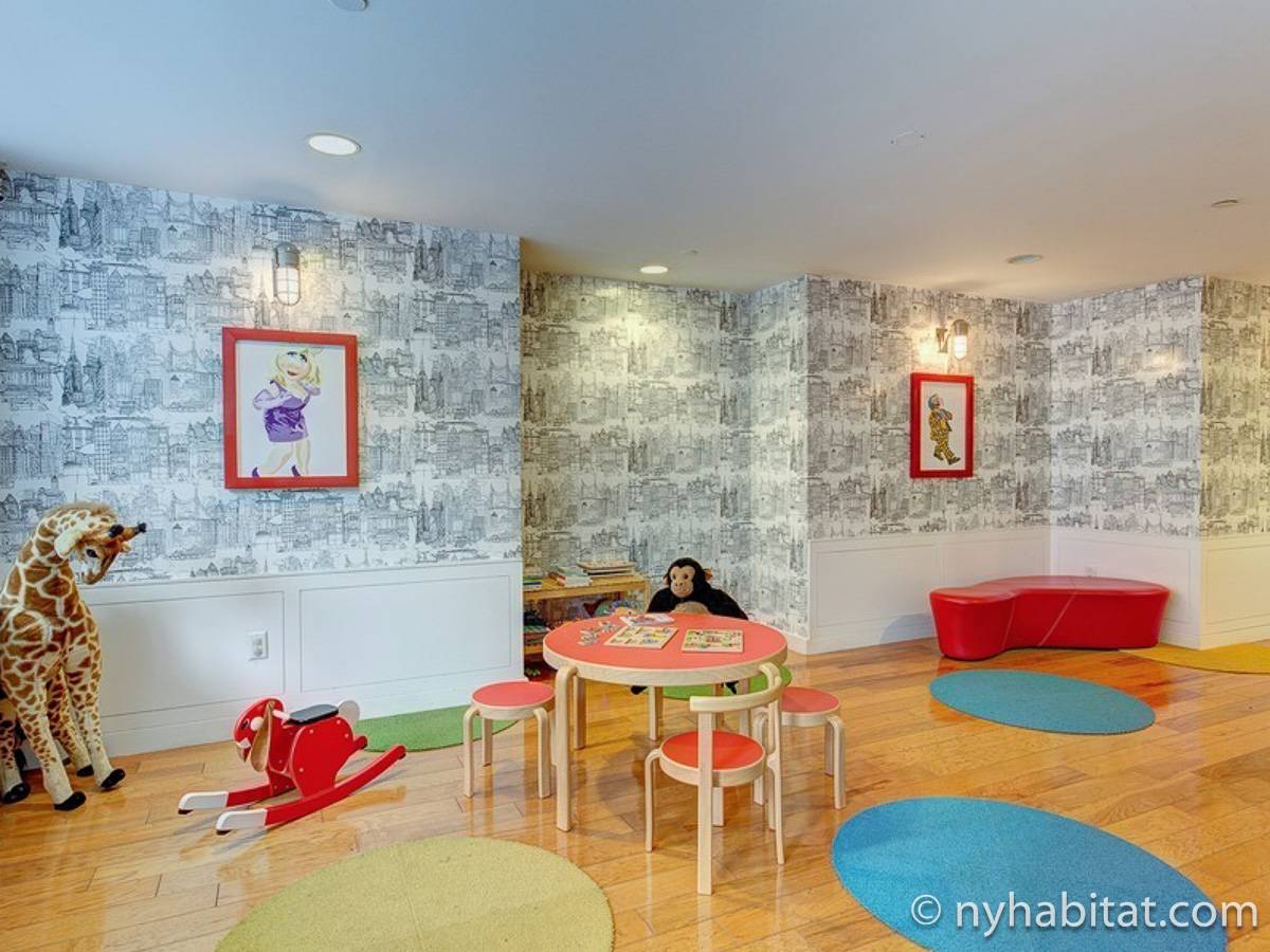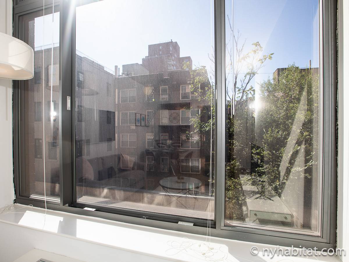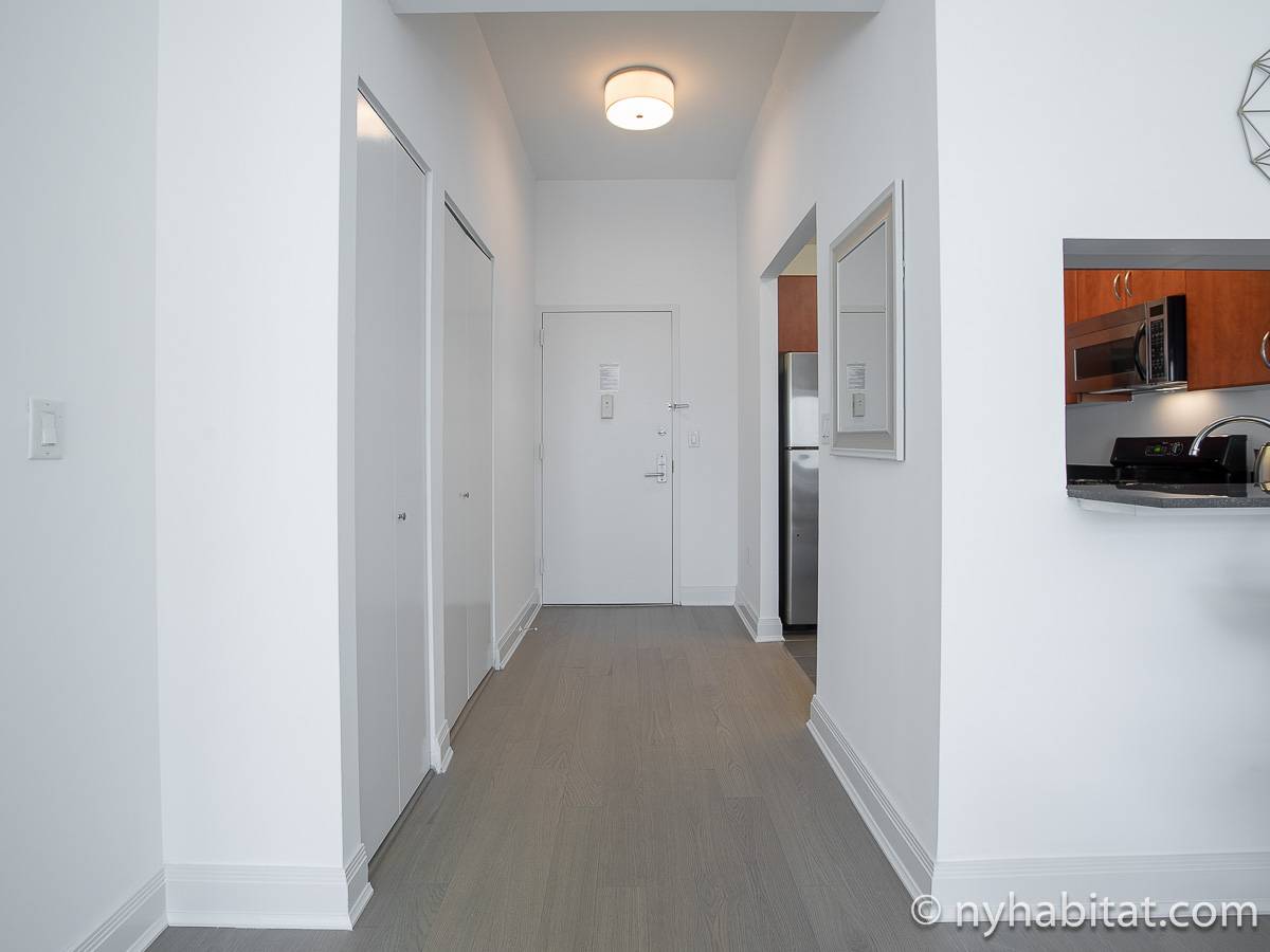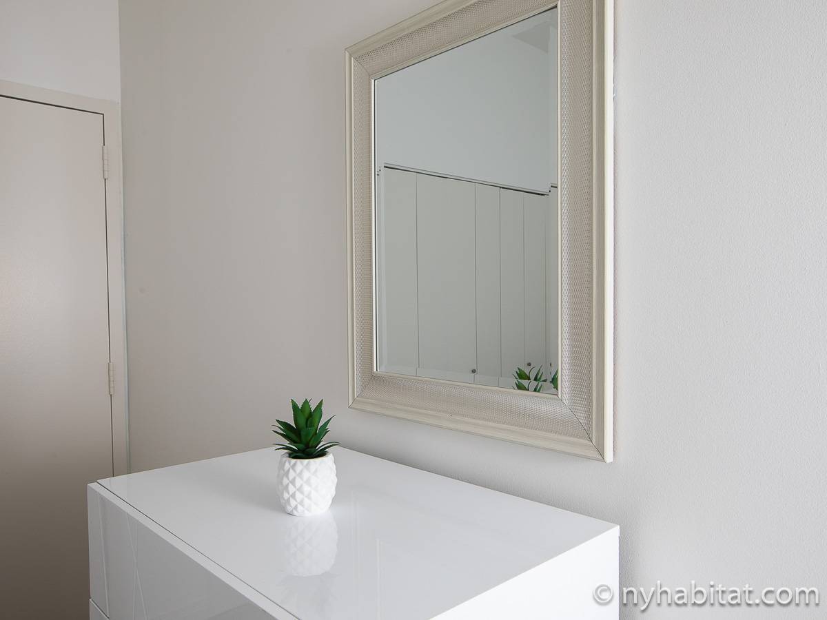 Cet appartement T2 meublé à New York est décoré avec goût dans des tons gris et blancs. Le salon est doté d’une grande fenêtre éclairant naturellement la pièce, pendant que vous êtes confortablement installé sur le canapé à regarder vos séries préférées sur la télé écran plat. Une table pour quatre est à votre disposition afin que vous puissiez inviter vos amis à dîner, maintenant que vous avez une cuisine entièrement équipée à votre disposition. La cuisine dispose d’un plan de travail qui donne sur le salon avec des tabourets sur lesquels vous installer pour un repas détendu. Dotée de placards en bois de cerisier et d’électroménager en inox, la cuisine dispose aussi d’avantages comme un lave-vaisselle qui vous faciliteront la réception. La chambre est meublée d’un lit Queen size et d’une grande fenêtre ainsi que de nombreux placards pour vos affaires. Des draps et serviettes sont fournis, et le Wi-Fi est disponible dans l’ensemble de l’appartement. La salle de bain carrelée en marbre est équipée d’une baignoire-douche, d’un grand miroir et d’un lavabo avec un placard de rangement en-dessous.