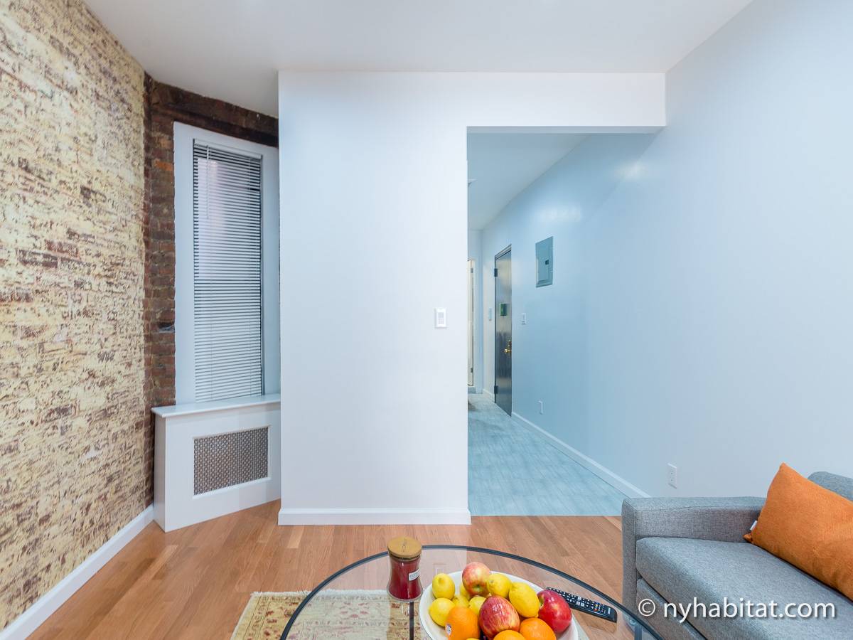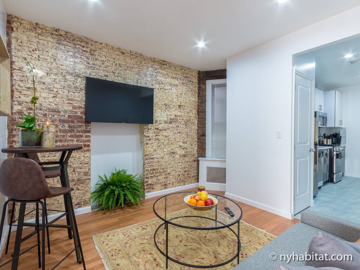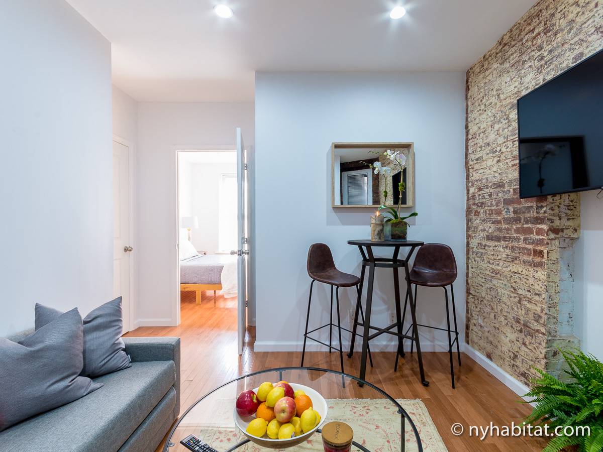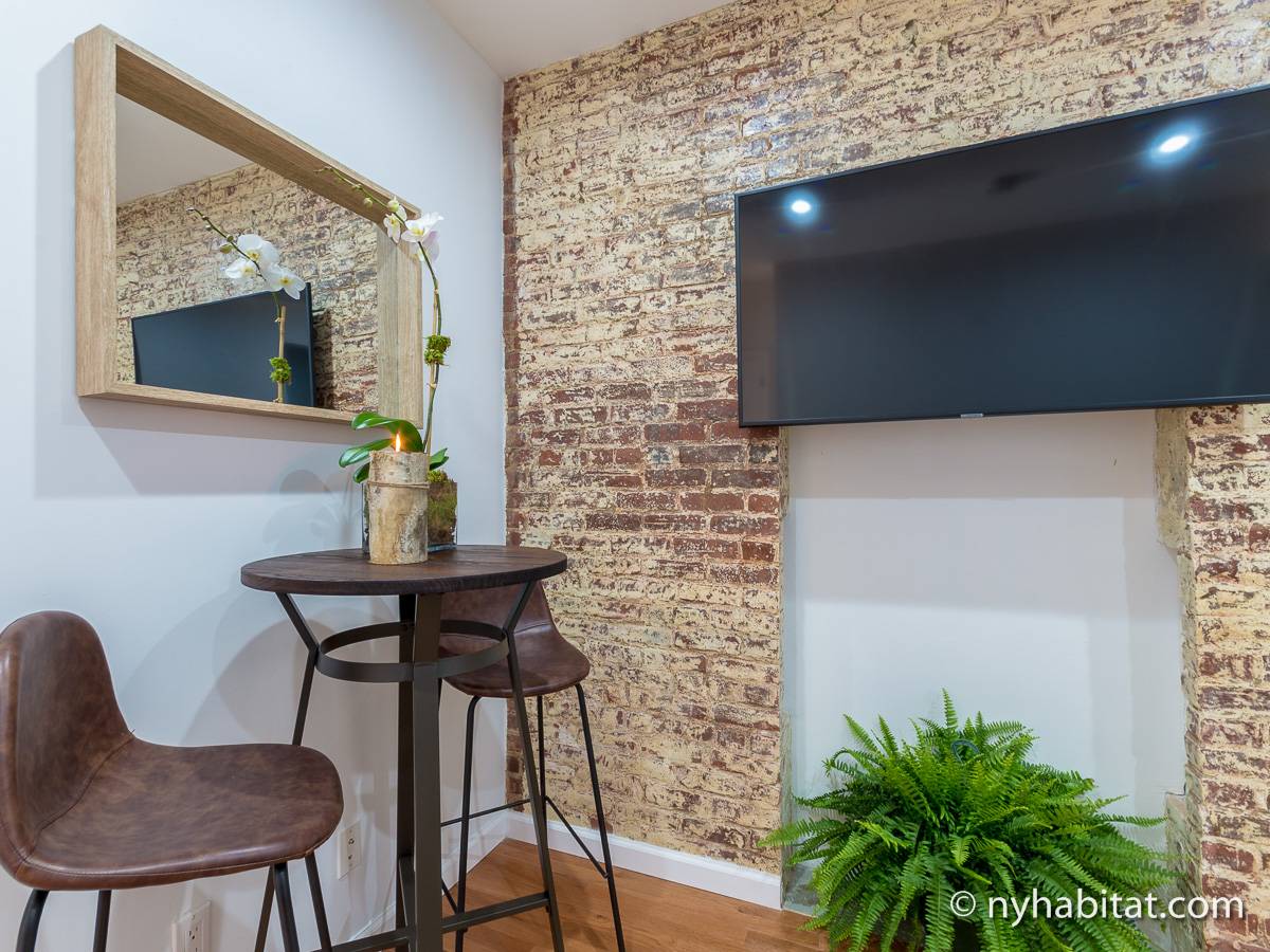 Cet appartement T2 meublé avec de charmants murs en briques apparentes est situé dans le quartier pittoresque de Gramercy, à Manhattan. Cette location meublée se trouve dans un petit immeuble de 4 étages (correspondant à 3 étages en Europe), près de East 14th et de 3rd Avenue.