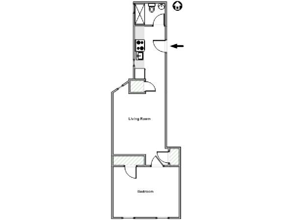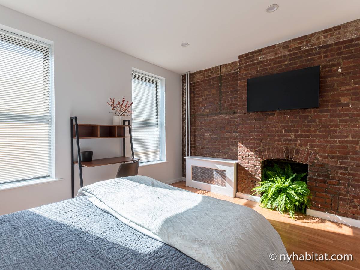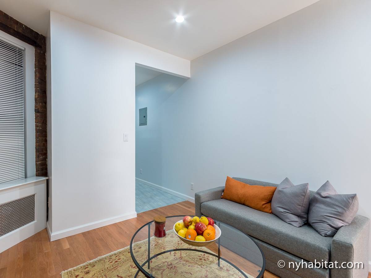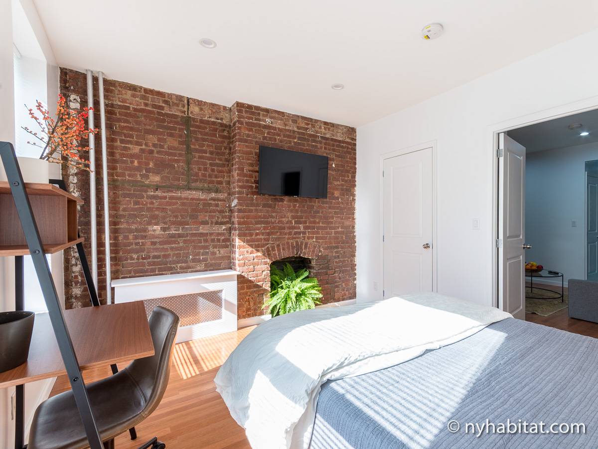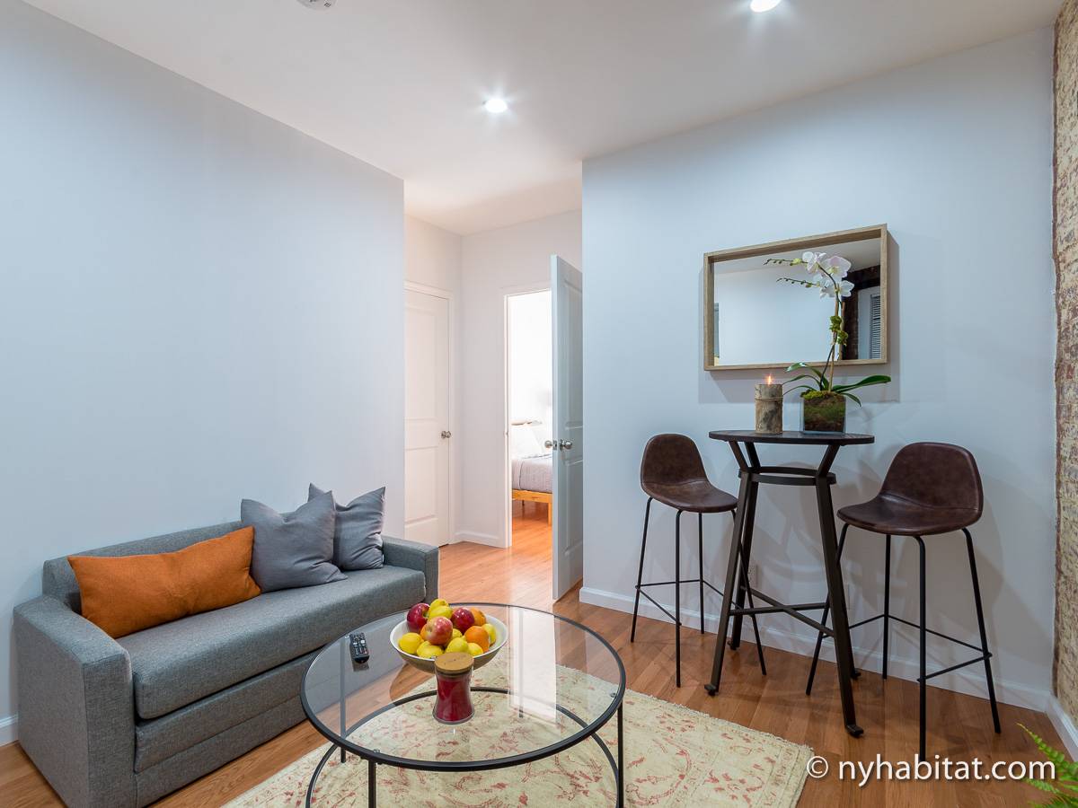 Cet appartement T2 meublé avec de charmants murs en briques apparentes est situé dans le quartier pittoresque de Gramercy, à Manhattan. Cette location meublée se trouve dans un petit immeuble de 4 étages (correspondant à 3 étages en Europe), près de East 14th et de 3rd Avenue.