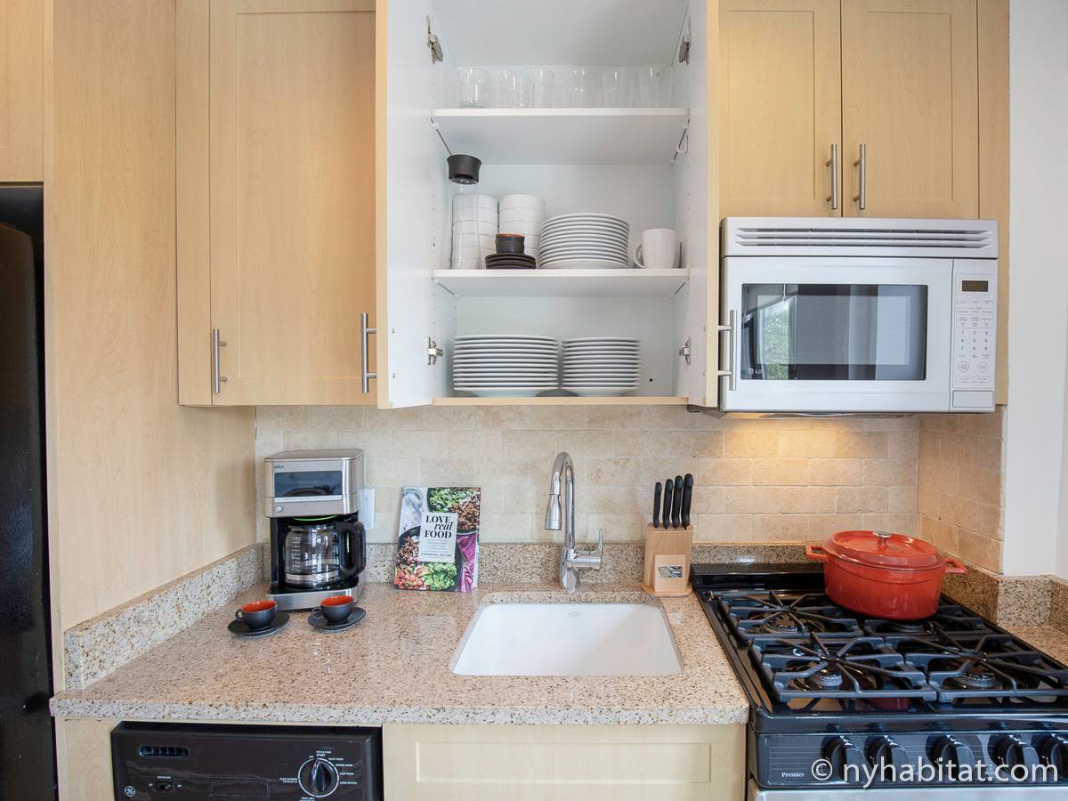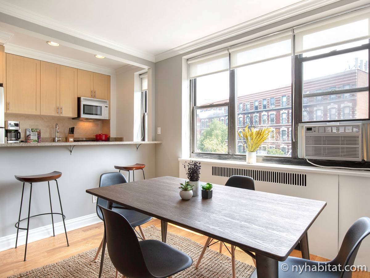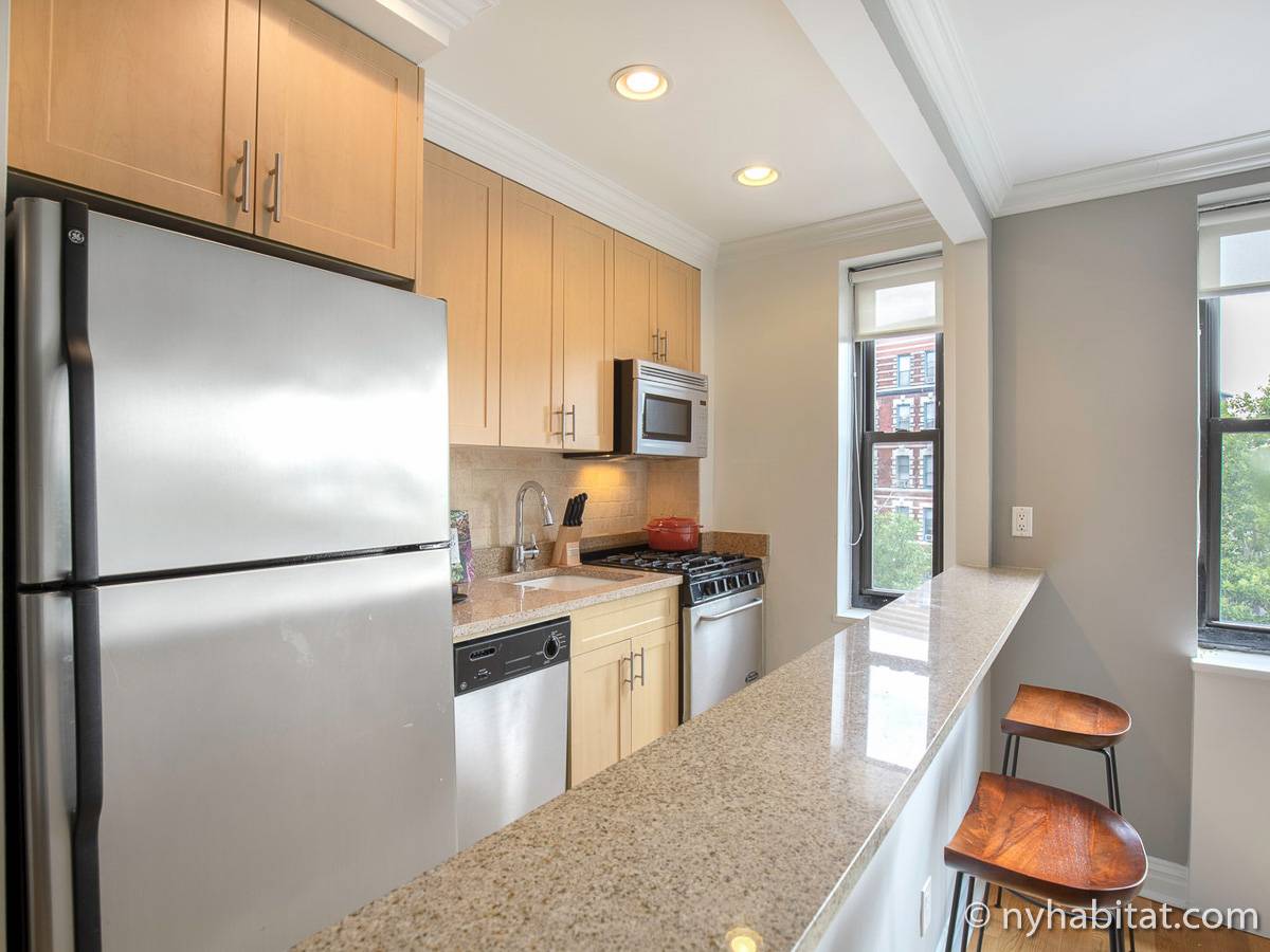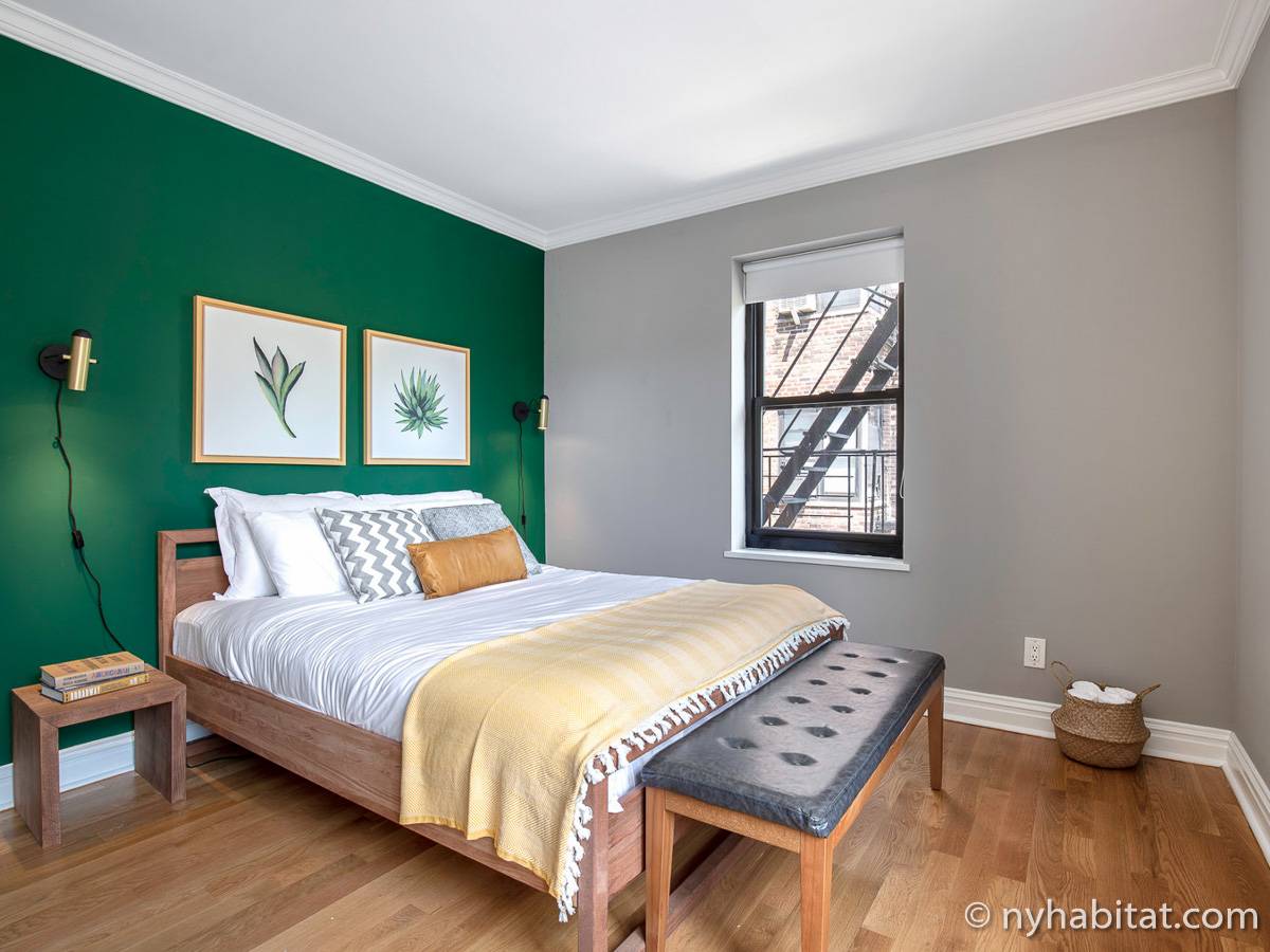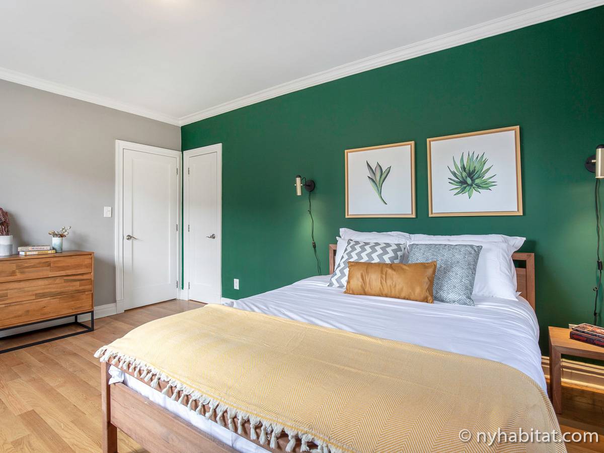 Cette location meublée de 80 m2 est dotée de parquet au sol. La cuisine ouverte est spacieuse et lumineuse, avec des tabourets hauts et table de salle à manger où vous rassasier, vous amuser et travailler à la maison. Elle dispose d’appareils électroménagers en acier inoxydable : un frigo et un congélateur, un micro-onde, un four, une cafetière, un grille-pain et un lave-vaisselle. Le séjour a été conçu dans un style moderne, dans des tons verts froids et boisés. L’appartement comprend également une télévision, le câble et un climatiseur. Vous retrouverez cette atmosphère moderne dans la chambre meublée avec un grand lit Queen, des draps, une fenêtre, des tiroirs en bois et de nombreux espaces de rangement. La salle de bain est entièrement blanche ce qui lui donne un côté épuré, et équipée d’une baignoire-douche en acier inoxydable, d’un lavabo, de rideaux et d’un meuble avec miroir.