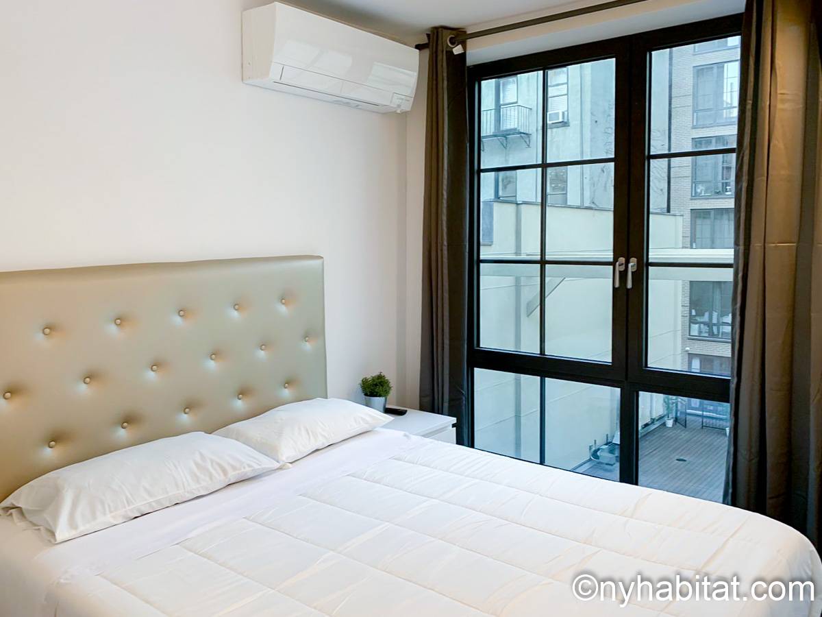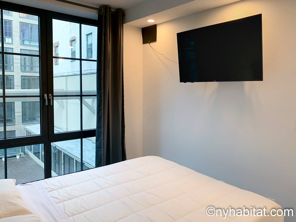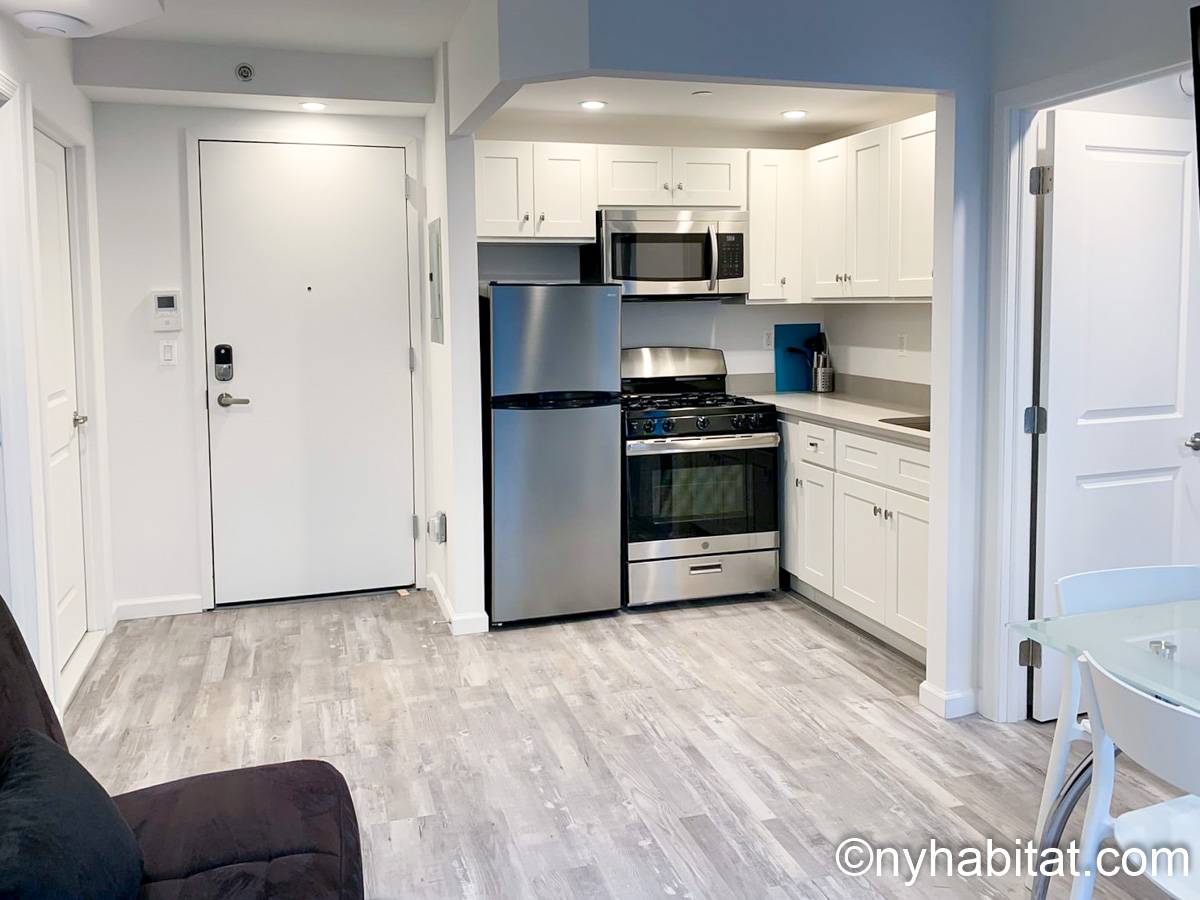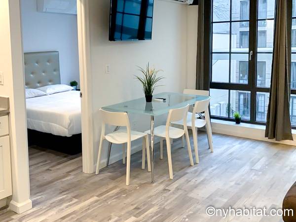 Cet appartement T3 meublé avec salle de bain se trouve au troisième étage d’un immeuble avec ascenseur et aux grandes fenêtres. Devant l’immeuble, il y a un grand trottoir à l’ombre des arbres. L'appartement T3 se trouve entre la 53e rue West et la 10e Avenue à Midtown West, à Manhattan, à New York.