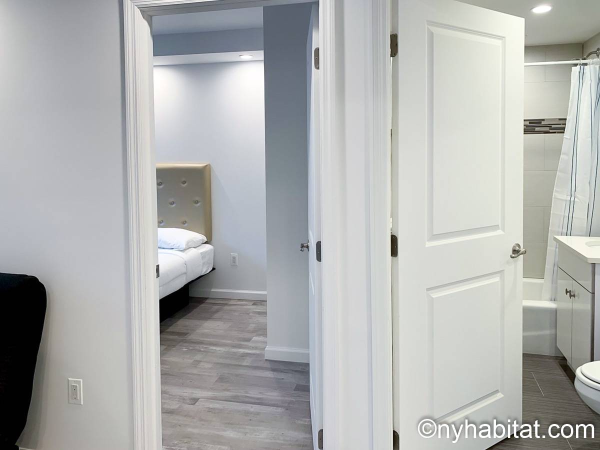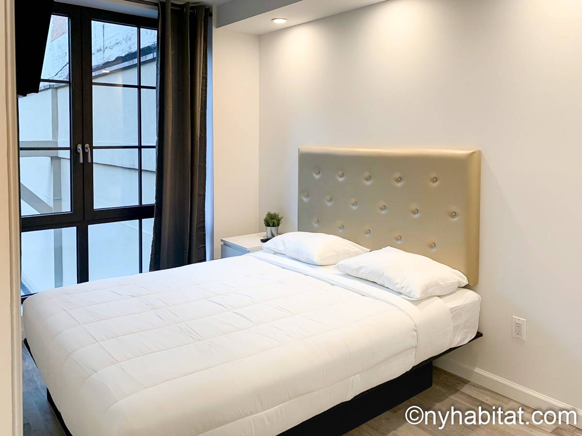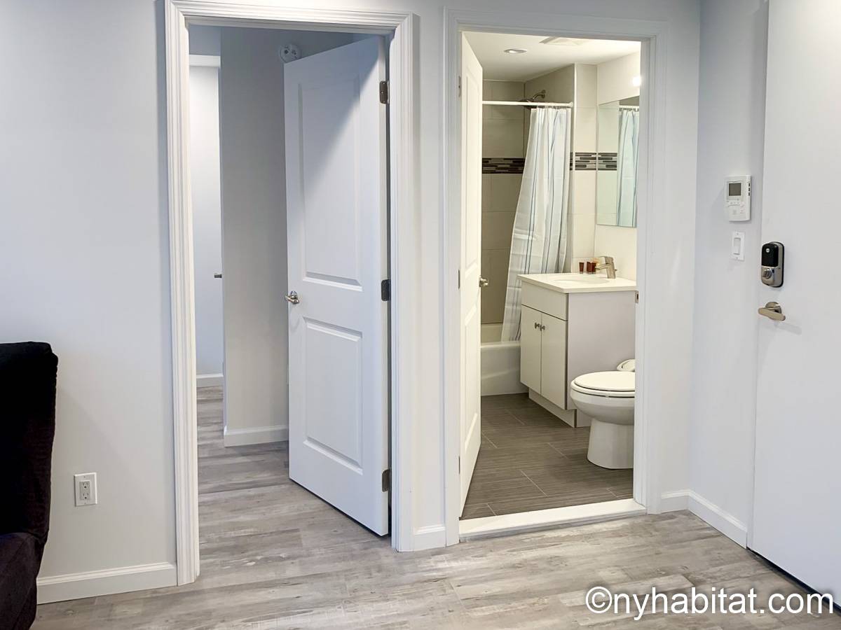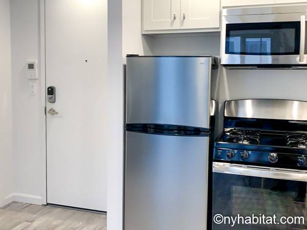 Cet appartement T3 meublé avec salle de bain se trouve au troisième étage d’un immeuble avec ascenseur et aux grandes fenêtres. Devant l’immeuble, il y a un grand trottoir à l’ombre des arbres. L'appartement T3 se trouve entre la 53e rue West et la 10e Avenue à Midtown West, à Manhattan, à New York.