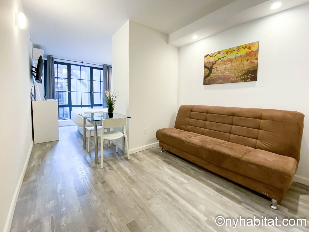 Ce studio T1 de style moderne se trouve entre la West 53rd Street et la 10th Avenue à Midtown West, à Manhattan, New York ! Vous trouverez cet appartement au 2e étage (équivalent du 1er étage en Europe) d’un immeuble bas comportant un système de sécurité. L’immeuble a un ascenseur, facilitant l'accès à votre studio T1, et offre des commodités comme une buanderie au sein de l'immeuble et la climatisation.