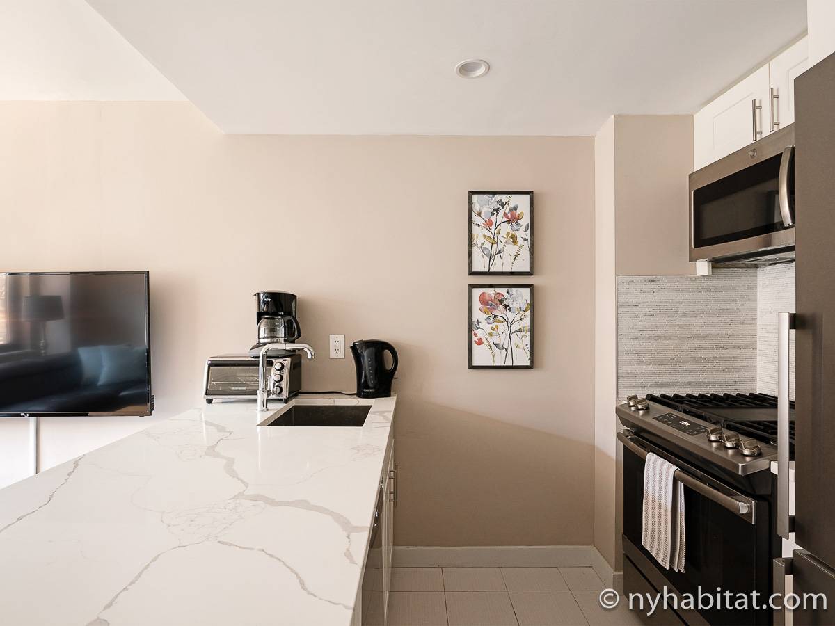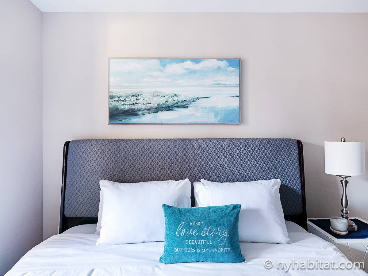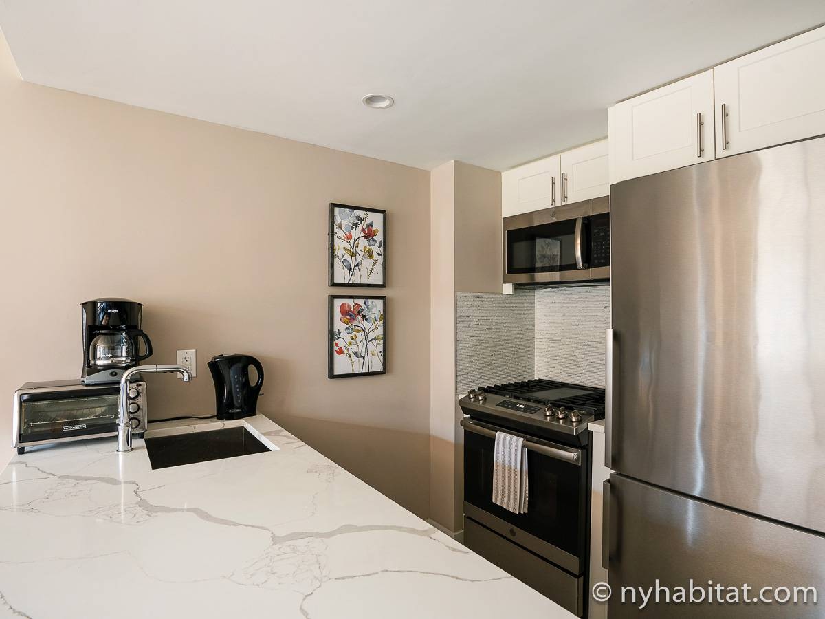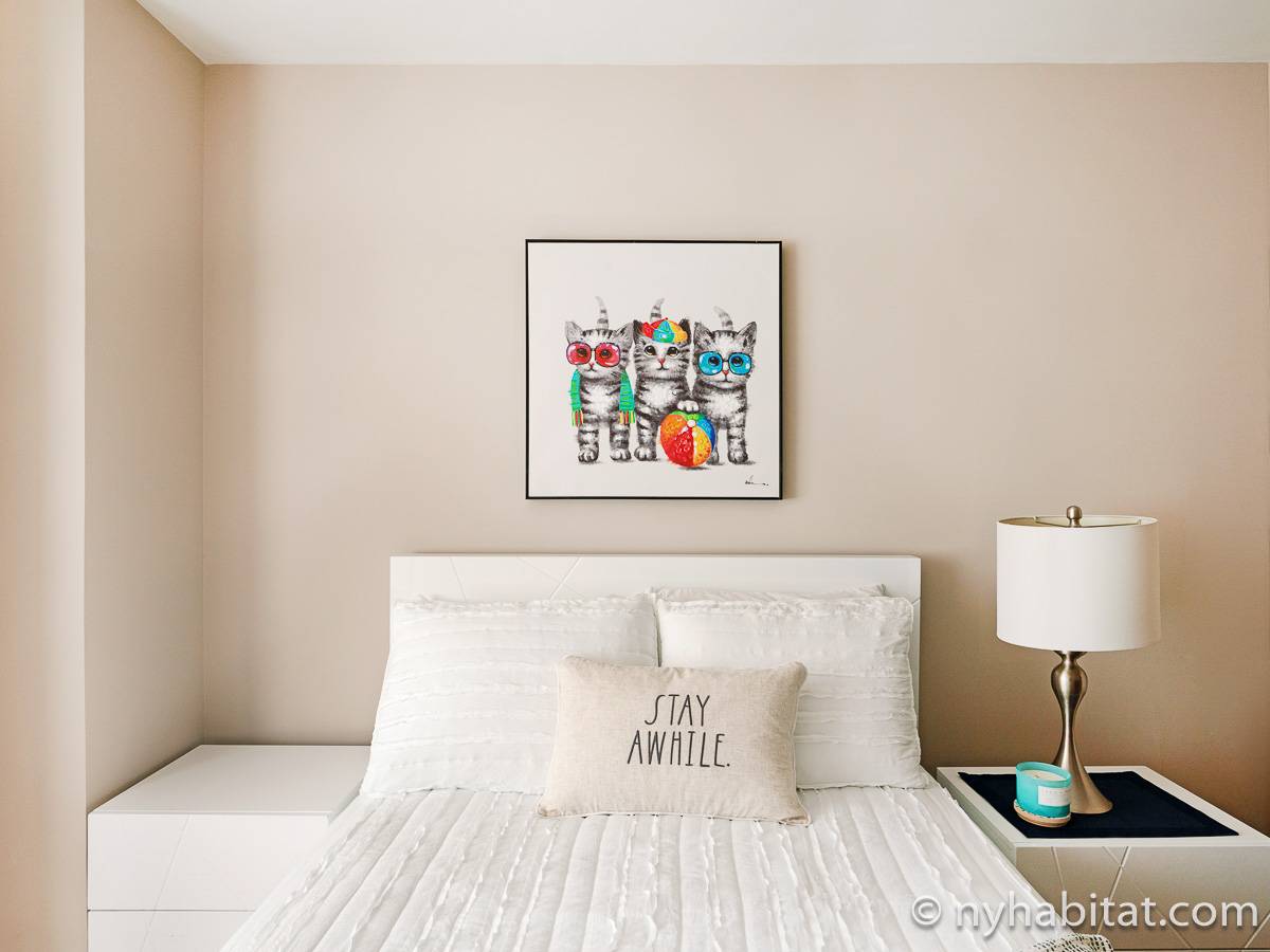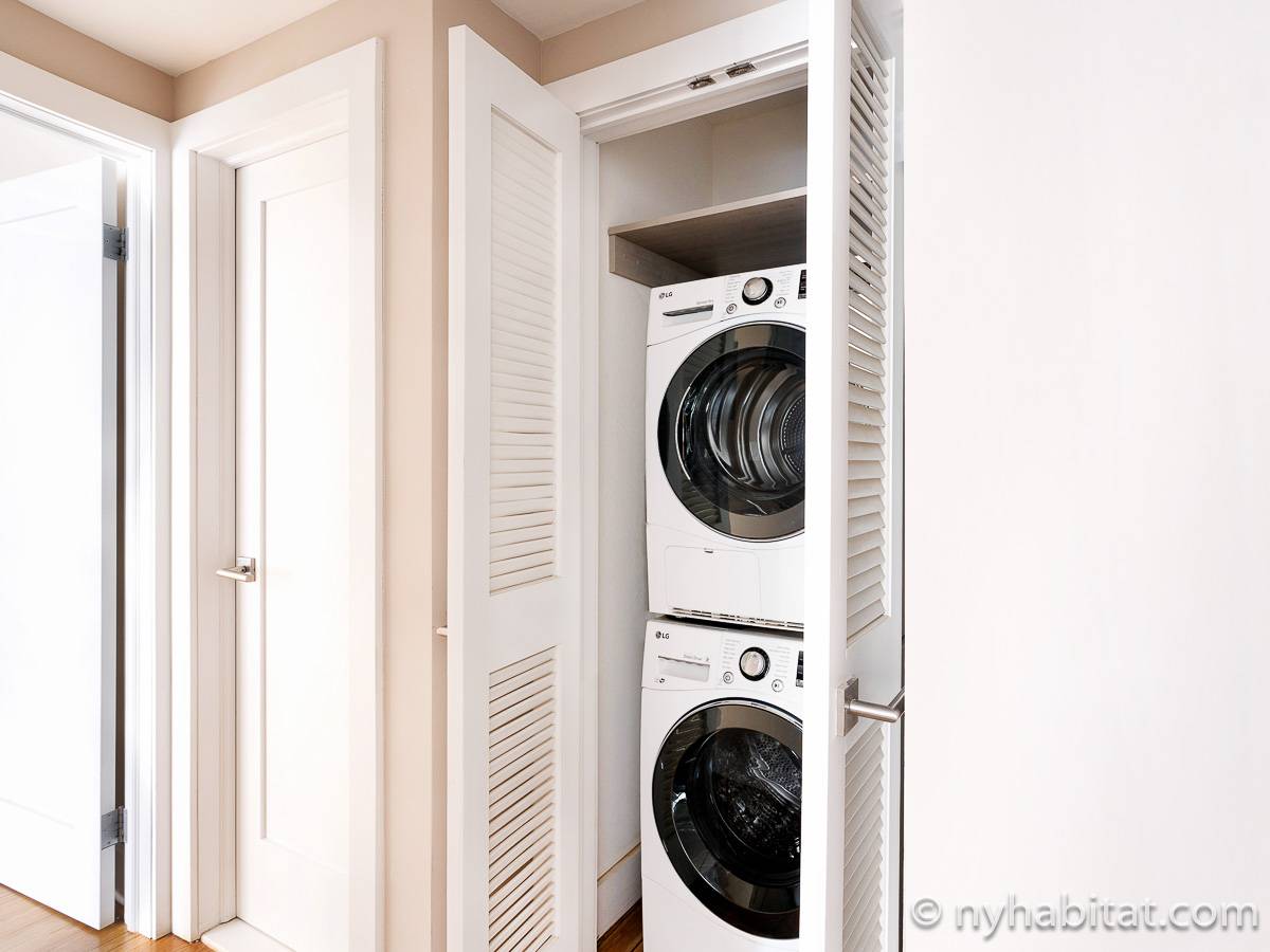 L'espace lumineux et les meubles contemporains complètent l'atmosphère moderne de cette location meublée. Le séjour dispose d'une table à manger, d'un canapé et d'une télévision. Dans la cuisine, vous pourrez utiliser le micro-ondes, la cafetière, le grille-pain et le réfrigérateur en acier inoxydable. Les deux chambres sont dotées d’un lit double accompagné d'une table de chevet avec une lampe. La salle de bain est dotée de carrelage imitation marbre et comprend une baignoire-douche. Il y a également une petite buanderie avec une machine à laver et un sèche-linge à l'intérieur de l'appartement.