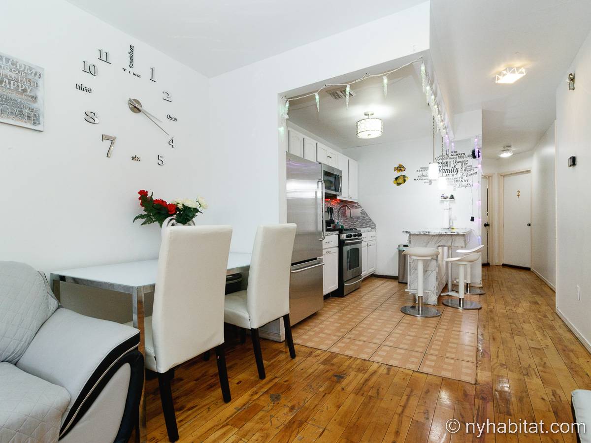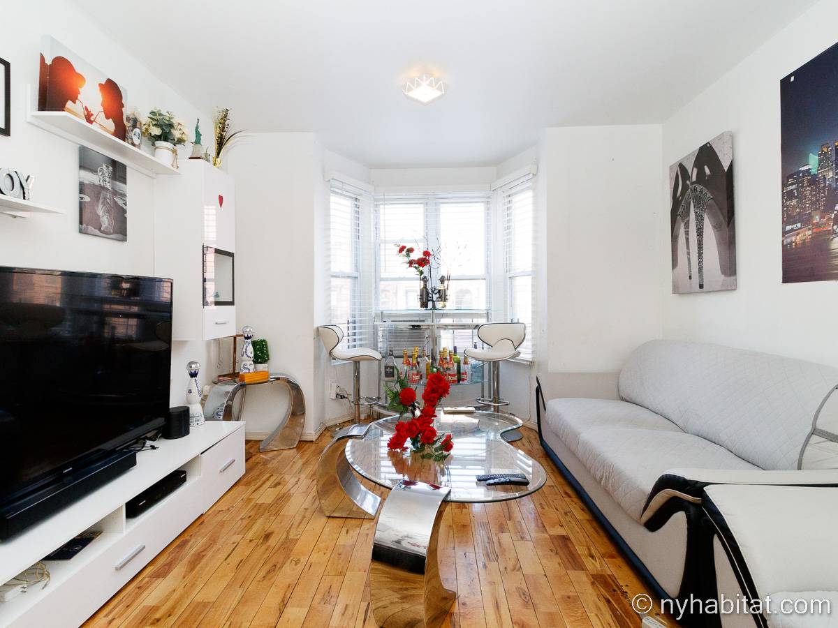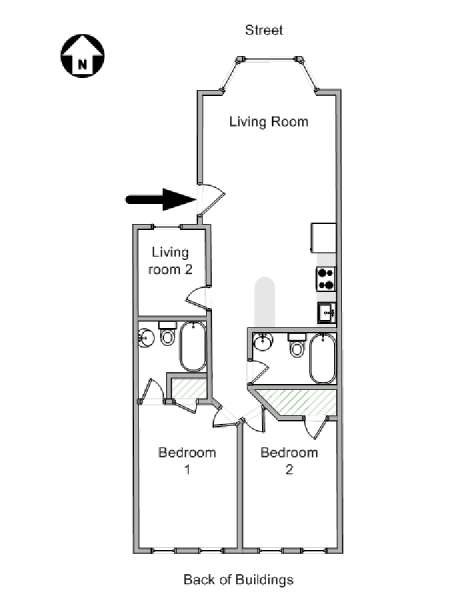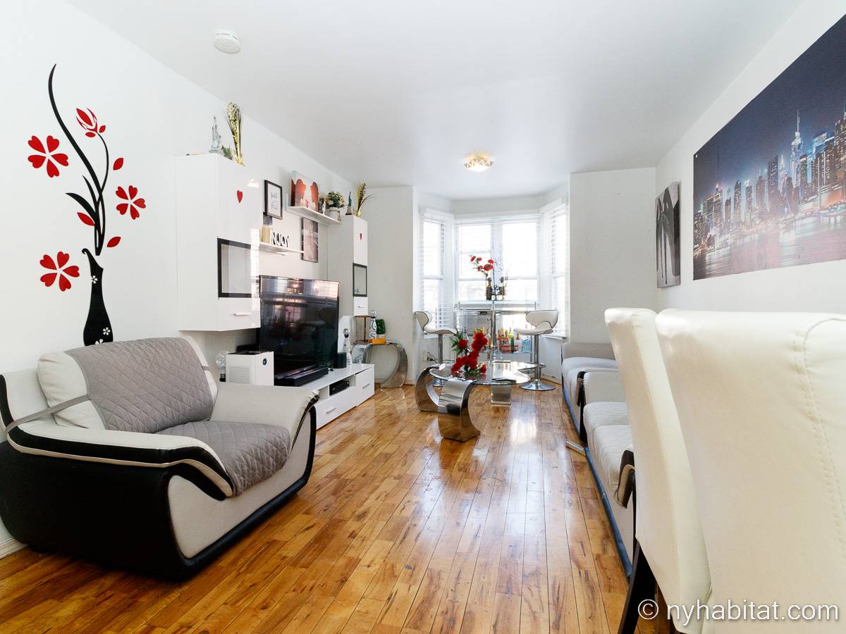 Entre Willoughby Avenue et Throop Avenue, cet appartement T3, meublé, avec deux salles de bain, se situe dans le quartier de Bedford-Stuyvesant, à Brooklyn, New York. D’une surface de 84 m2, il occupe le 2e étage (l’équivalent du premier étage en Europe) d’une maison de ville de 3 étages sans ascenseur.