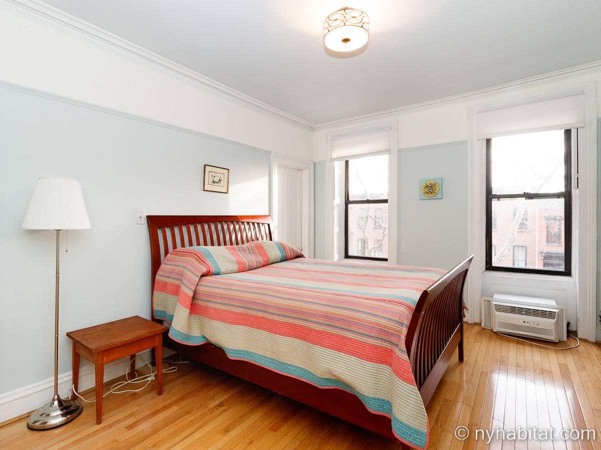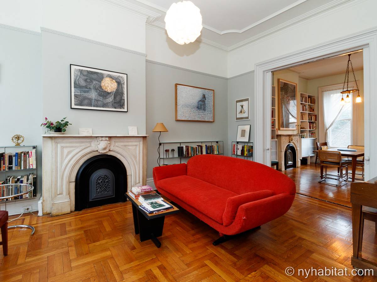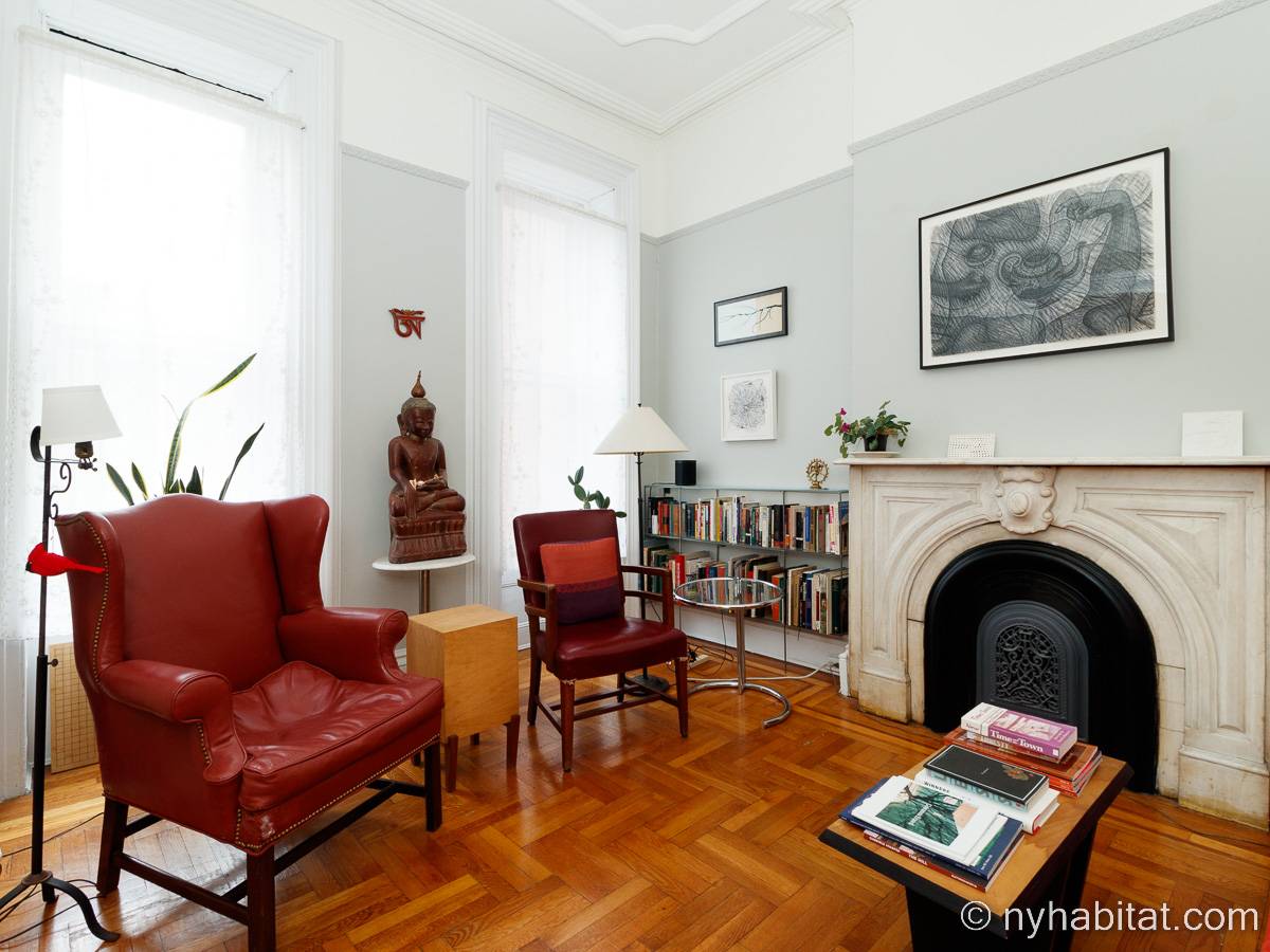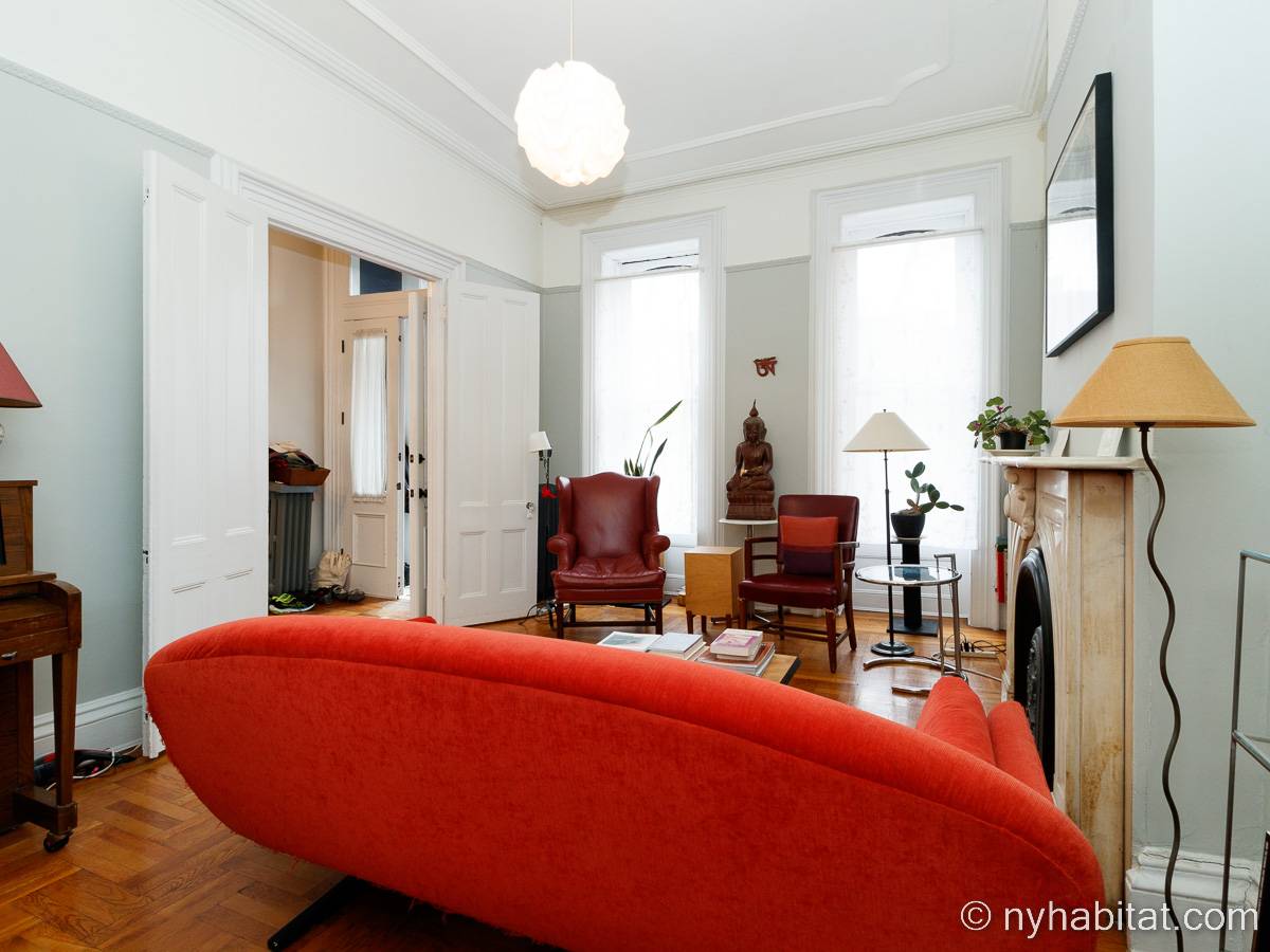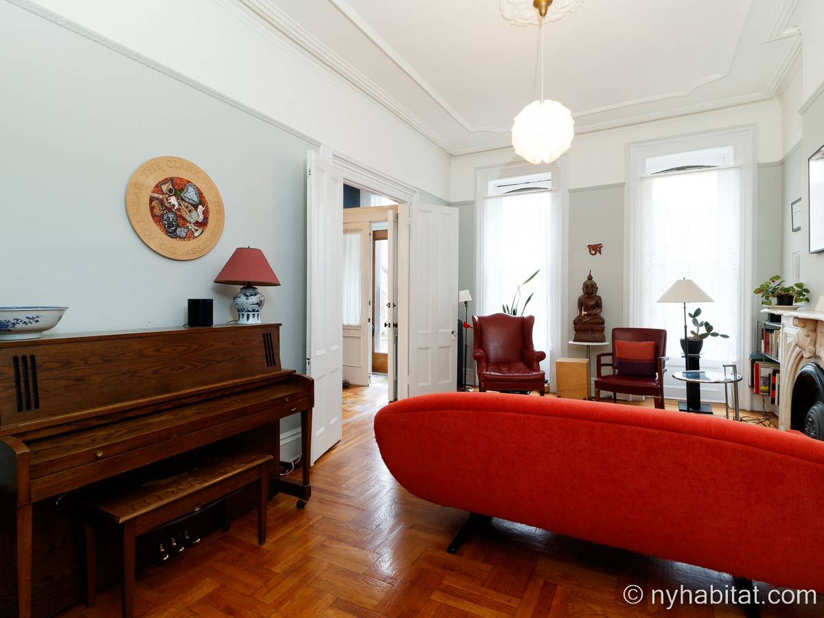 Cet appartement T3, meublé, avec une salle de bain, se situe entre Bergen Street et Bond Street. D’une superficie de 116 m2, ce bien en duplex se trouve aux 2e et 3e étages (l’équivalent des 1er et 2e étages en Europe) d’un immeuble brownstone sans ascenseur de Boerum Hill, un quartier de Brooklyn, à New York. L’appartement comporte un accès à un balcon privatif et à un jardin verdoyant.