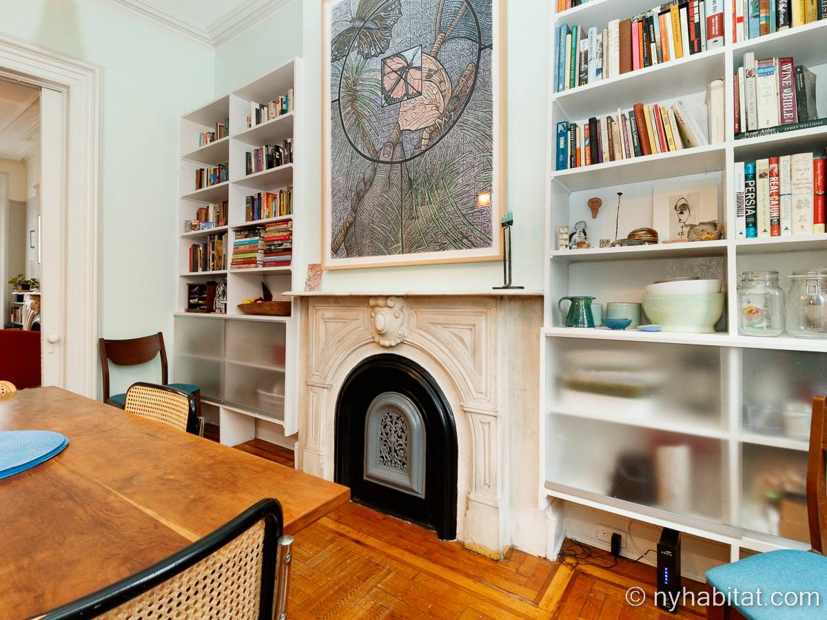 À l’étage inférieur de cette location meublée, vous trouverez de grandes fenêtres, de hauts plafonds, du parquet, des cheminées décoratives et des moulures décoratives. Des bibliothèques et des meubles de rangement longent les murs du séjour, de la cuisine et du coin repas, et la lumière naturelle pénètre dans la pièce par deux côtés. Il y a un canapé et une table à manger. La cuisine est équipée d’un lave‑vaisselle, d’un réfrigérateur et d’un four.