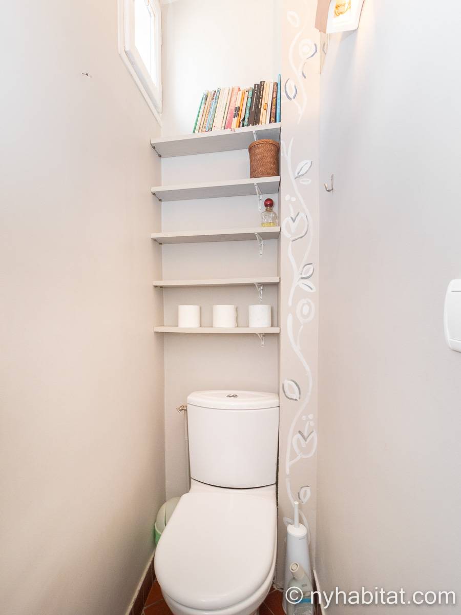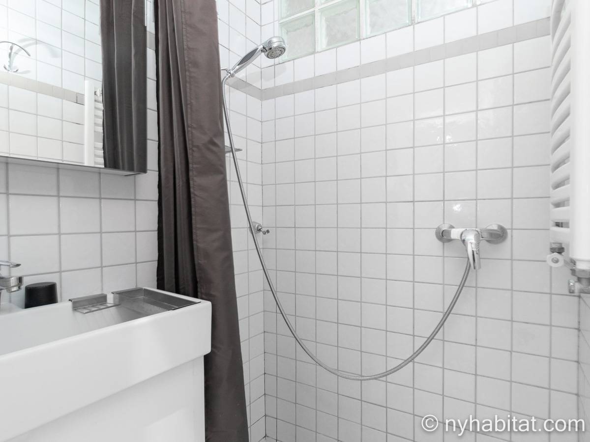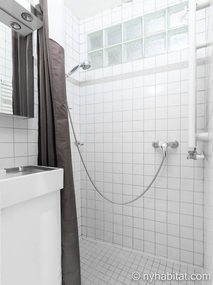Cet appartement est bien équipé pour les Américains qui ont l'habitude d'avoir des lave-vaisselle, lave-linge et sèche-linge encastrés, et un salon-salle à manger spacieux. L'inconvénient, c'est la salle de bain (d'environ 36 pieds carrés) : le carrelage monte jusqu'à une hauteur de 6 pieds, la douche s'écoule au centre de la pièce près d'un petit lavabo (de 12 pieds de diamètre) sans aucune cloison entre les deux. Par conséquent, il faut éloigner le pommeau de douche du lavabo pour ne pas que l'autre moitié de la salle de bain ne soit trempée. Mais la pièce entière est QUAND MÊME trempée, donc si vous avez besoin d'utiliser le lavabo après avoir pris votre douche, vous marcherez sur un sol froid et trempé. Mis à part cela, cette salle de bain est tout à fait correcte et fait bien l'affaire. On peut toujours aller sur le tapis devant la salle de bain et s'y habiller au sec grâce à l'armoire et aux étagères qui s'y trouvent. |
