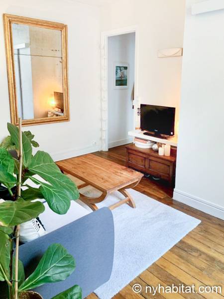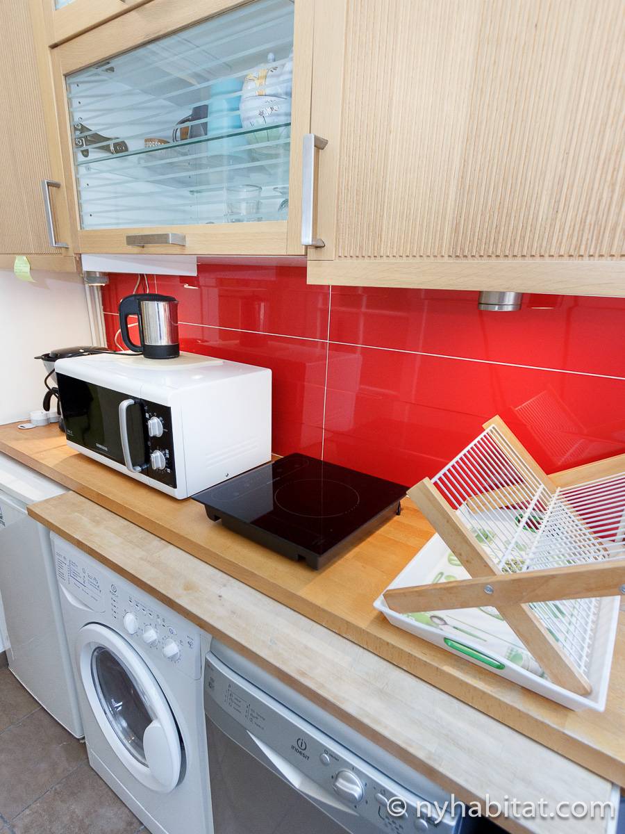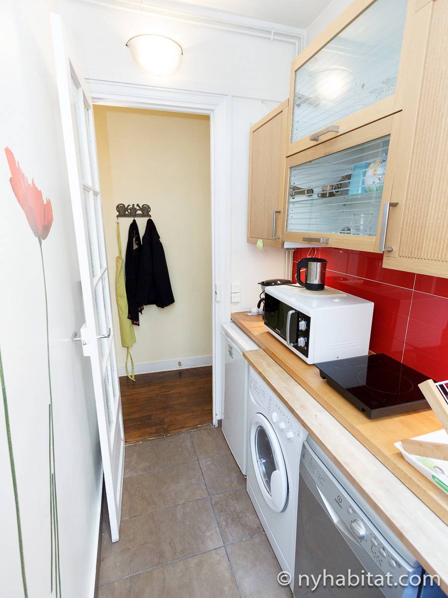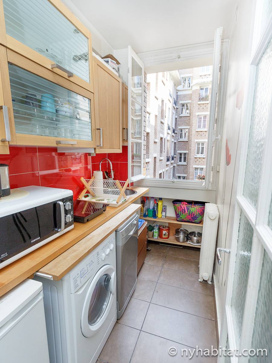 Le séjour de cet appartement T2 fait 12 m2 et dispose de parquet, d’un canapé et d’une télévision à écran plat. Les fenêtres donnent sur la cour (côté sud). La cuisine indépendante est juste à côté du salon. Elle est équipée de tout le nécessaire pour cuisiner et manger sur place, y compris un réfrigérateur, un congélateur et un lave-vaisselle. L’appartement vous offre même un lave-linge séchant, pour plus de confort.