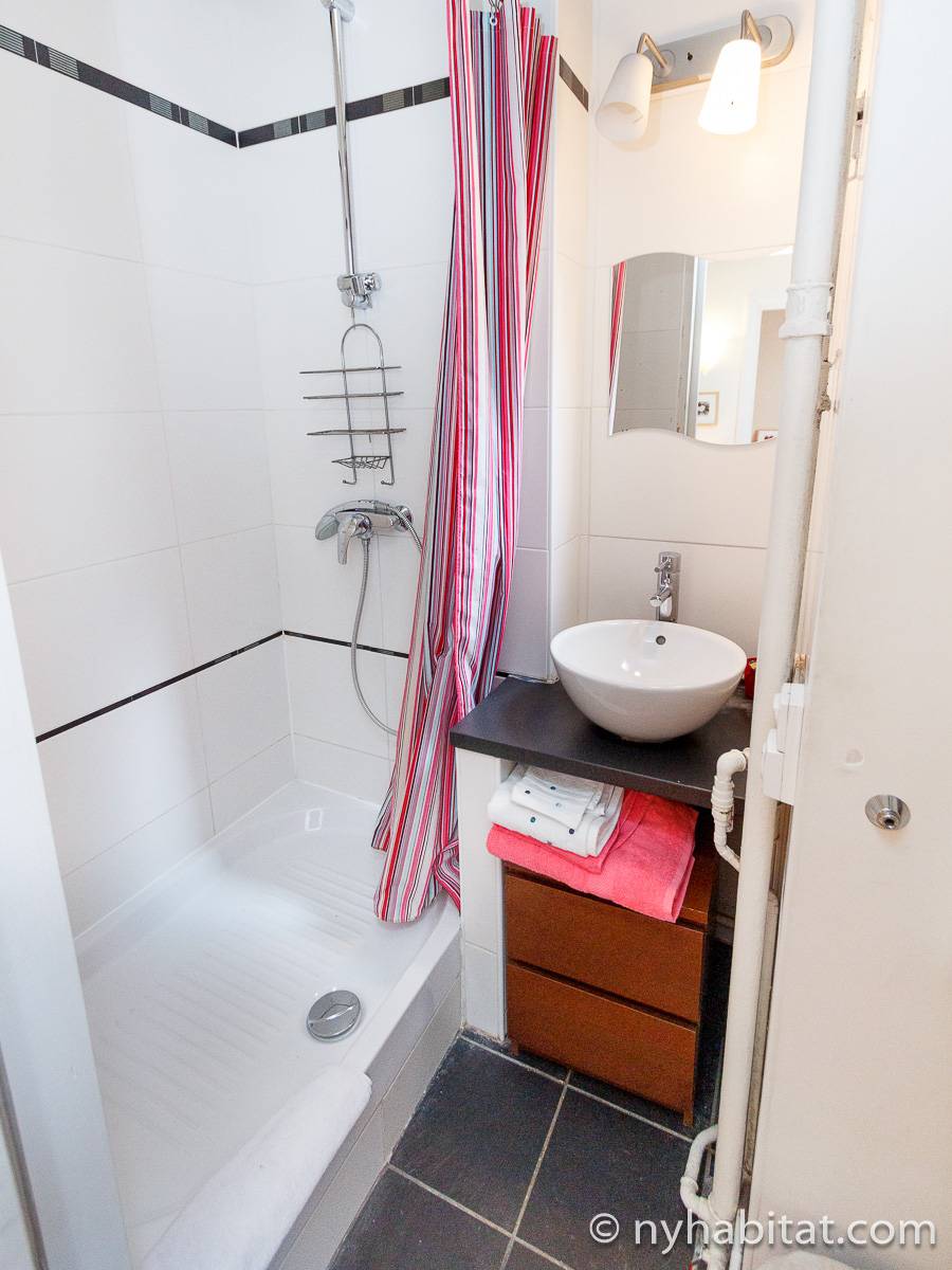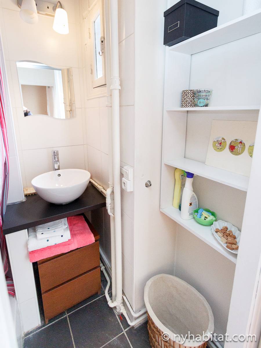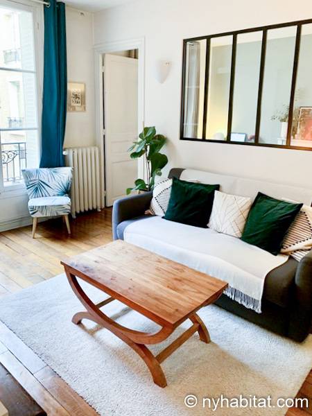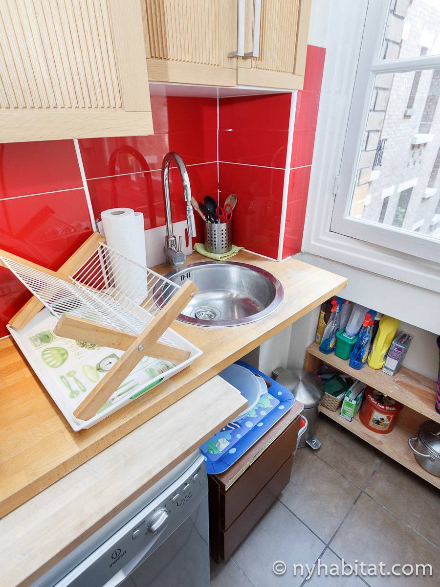 Le séjour de cet appartement T2 fait 12 m2 et dispose de parquet, d’un canapé et d’une télévision à écran plat. Les fenêtres donnent sur la cour (côté sud). La cuisine indépendante est juste à côté du salon. Elle est équipée de tout le nécessaire pour cuisiner et manger sur place, y compris un réfrigérateur, un congélateur et un lave-vaisselle. L’appartement vous offre même un lave-linge séchant, pour plus de confort.