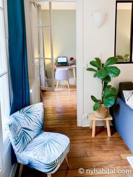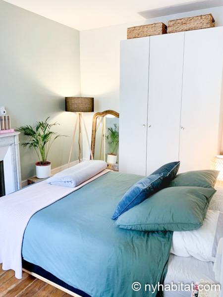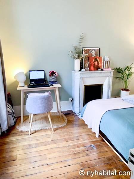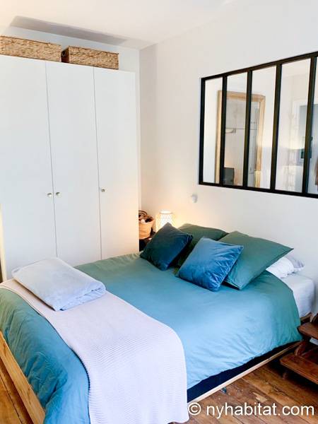 La chambre est également dotée de parquet et d’une fenêtre donnant sur la cour. Elle comporte un bureau et un lit double. Attention : cette pièce est reliée au séjour par une ouverture qui ressemble à une fenêtre.