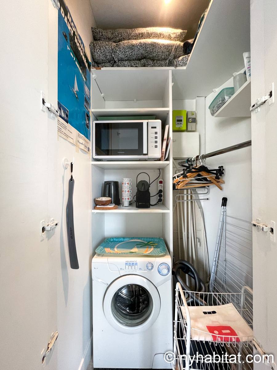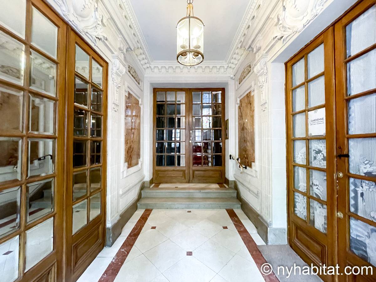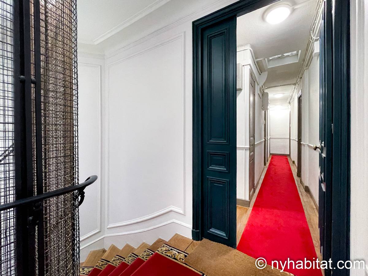 Ce studio T1 entièrement meublé se trouve dans le quartier de la Place de Wagram-Ternes, dans le 17ème arrondissement de Paris. Situé au dernier étage d’un immeuble Haussmannien de 7 étages datant du 19ème siècle avec ascenseur jusqu’au 6ème étage (le dernier étage doit être monté à pied pour arriver dans cette location meublée). L’accès à cet élégant et typique immeuble parisien est sécurisé par un digicode-interphone et une conciergerie à plein temps.
