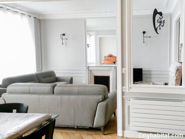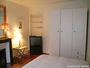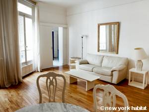 Du parquet chevron tapisse l'intérieur du séjour de cette location meublée qui contient un canapé, une table à manger, une télévision et la climatisation. La cuisine, dotée de carrelage et d'un plan de travail en granit, comprend un réfrigérateur, un congélateur, un grille-pain, une cafetière et un lave-vaisselle. Séparée par une porte coulissante à la française, la chambre se compose du même parquet à motifs, d'un lit double et de deux tables de chevet de chaque côté du lit. Le sol et les murs de la salle de bain et des toilettes sont dotés de carreaux effet marbre. La salle de bain comprend une douche.