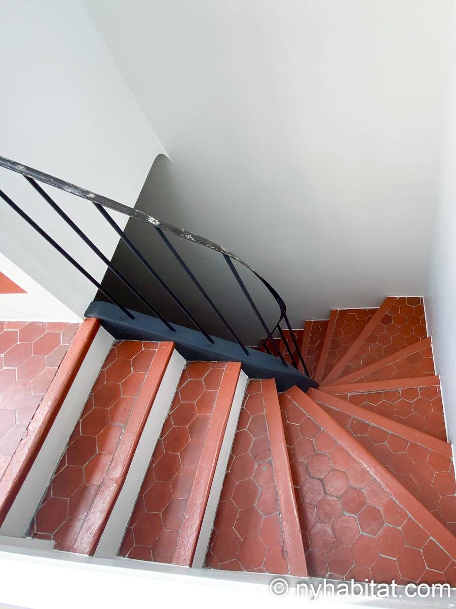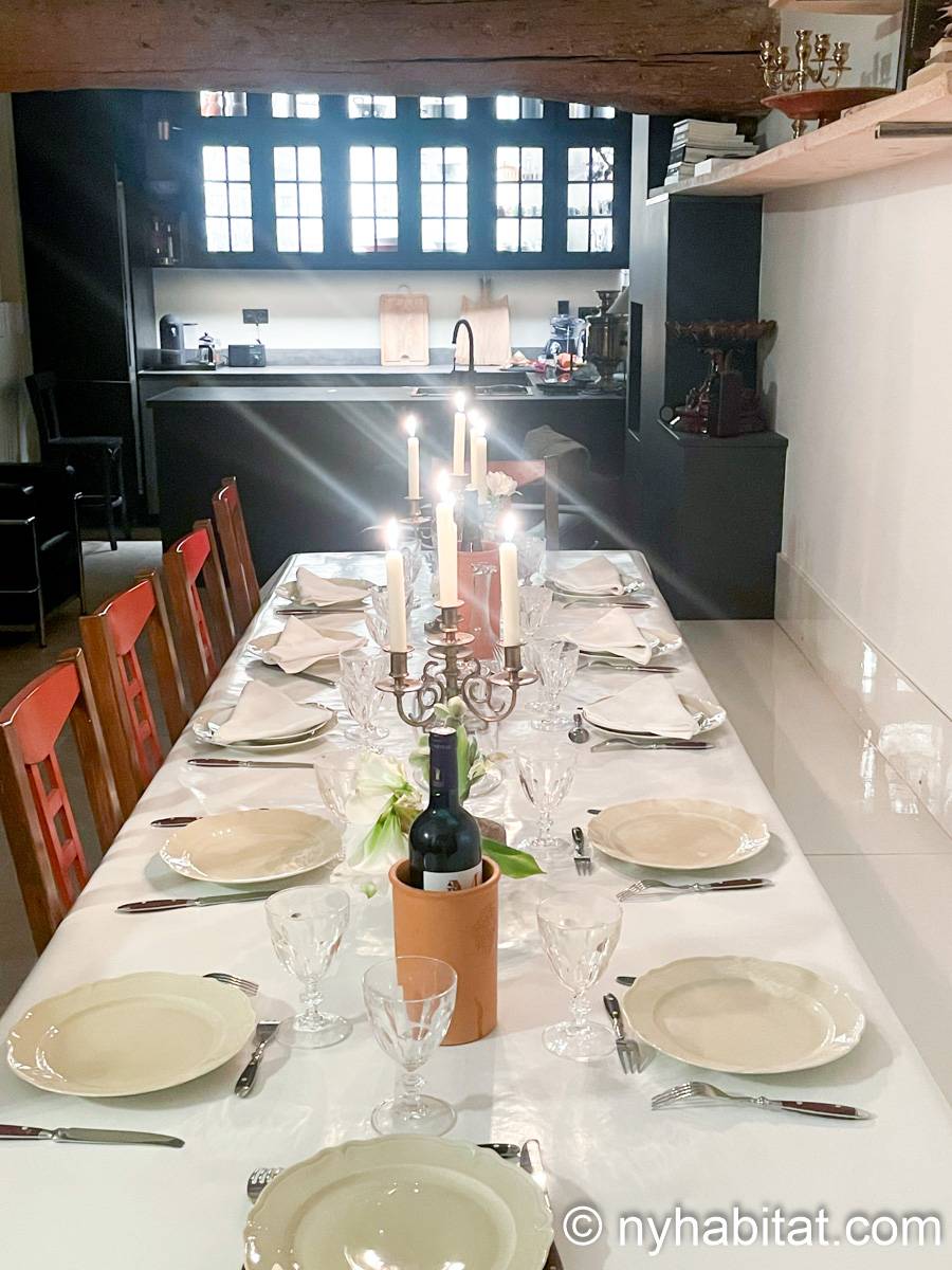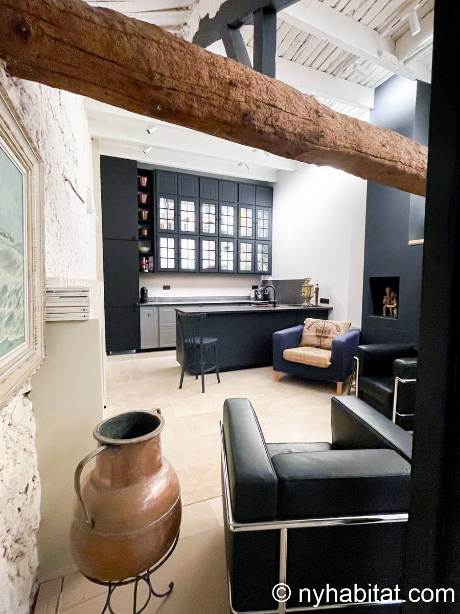 Dans cette maison T4, les briques apparentes et les poutres apparentes ajoutent du caractère au séjour situé au rez-de-chaussée ; on y trouve un canapé, une table à manger, une télévision et la climatisation. Le deuxième séjour, situé au troisième étage, est revêtu de carrelage carrière et comprend un canapé, une table à manger, deux lits simples, la climatisation, ainsi qu’une cuisine ouverte. Quant à la cuisine du rez-de-chaussée, elle est équipée d'une cafetière et possède des sièges de bar.