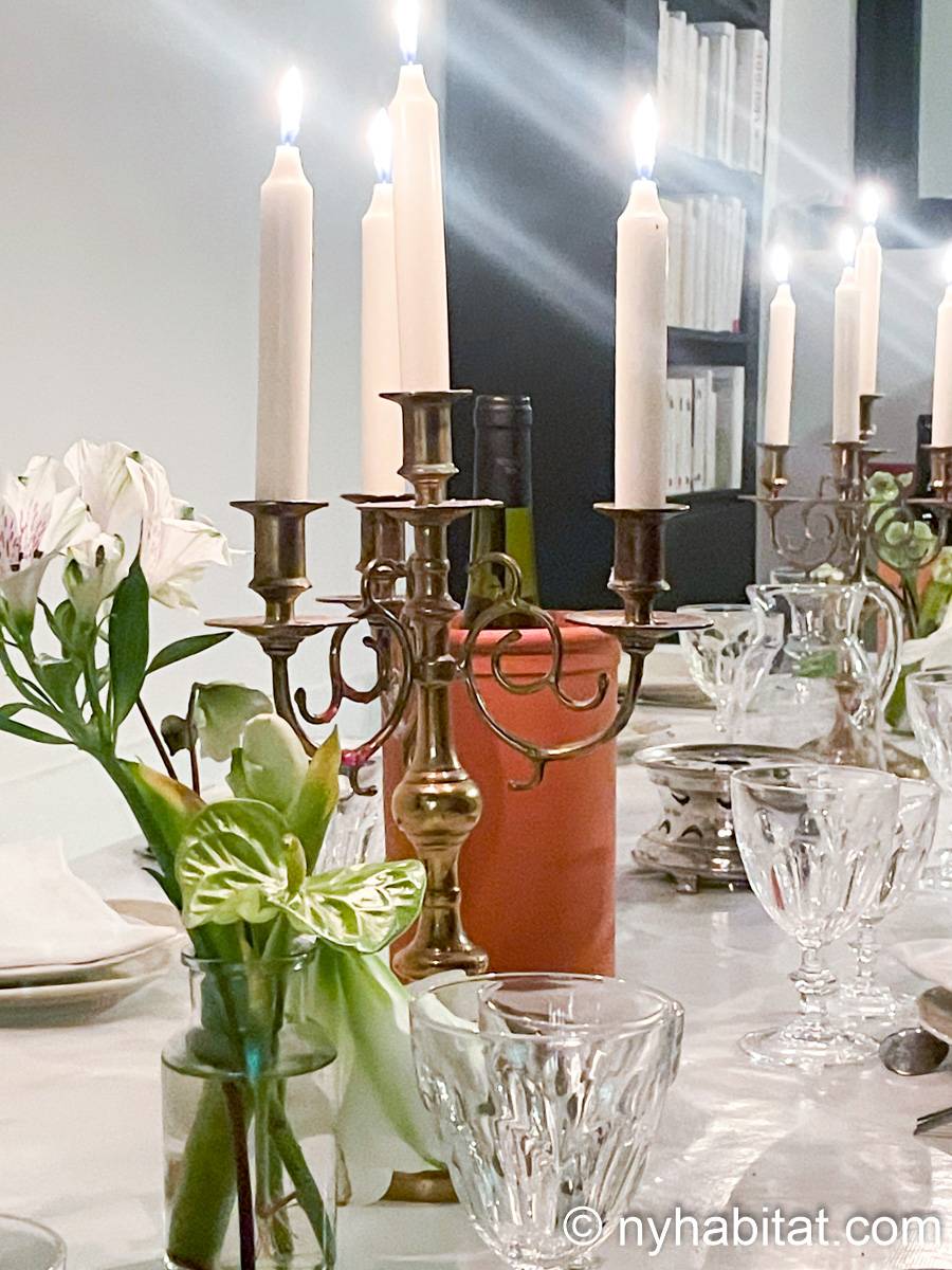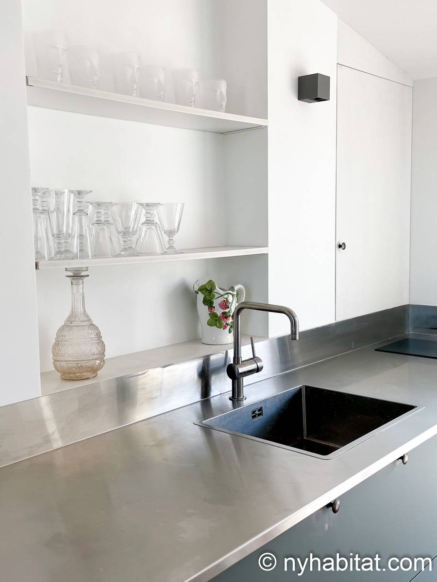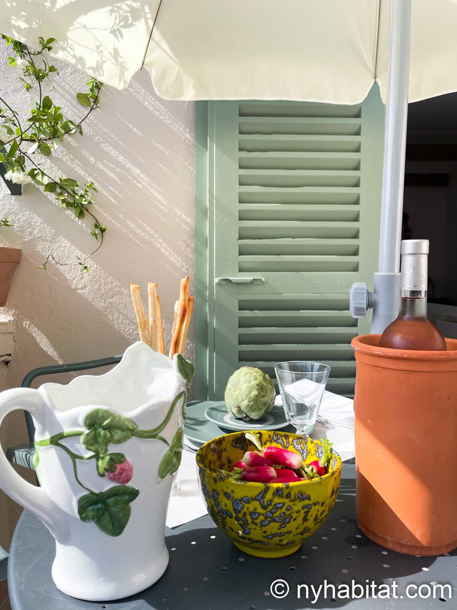 Dans cette maison T4, les briques apparentes et les poutres apparentes ajoutent du caractère au séjour situé au rez-de-chaussée ; on y trouve un canapé, une table à manger, une télévision et la climatisation. Le deuxième séjour, situé au troisième étage, est revêtu de carrelage carrière et comprend un canapé, une table à manger, deux lits simples, la climatisation, ainsi qu’une cuisine ouverte. Quant à la cuisine du rez-de-chaussée, elle est équipée d'une cafetière et possède des sièges de bar.