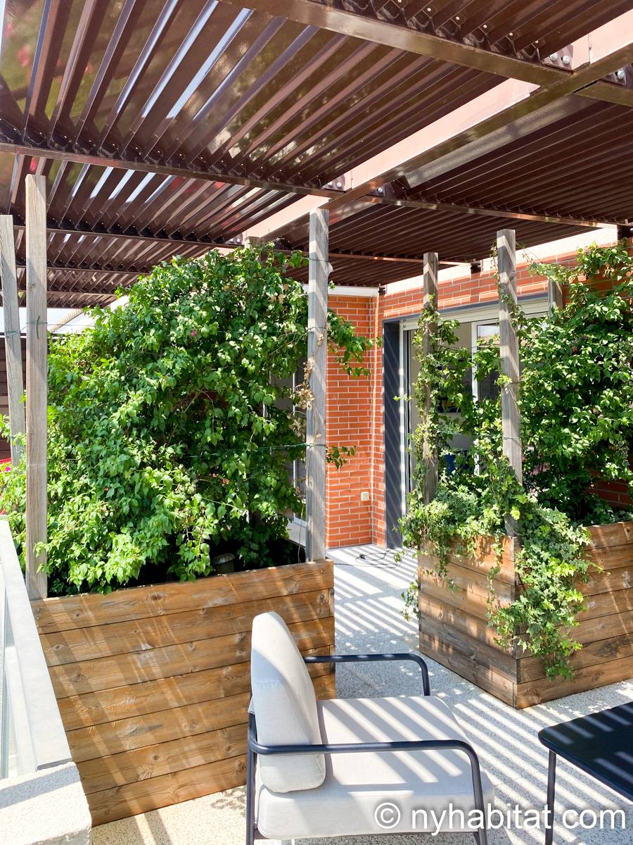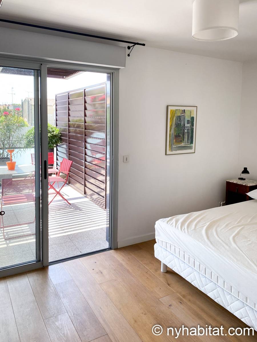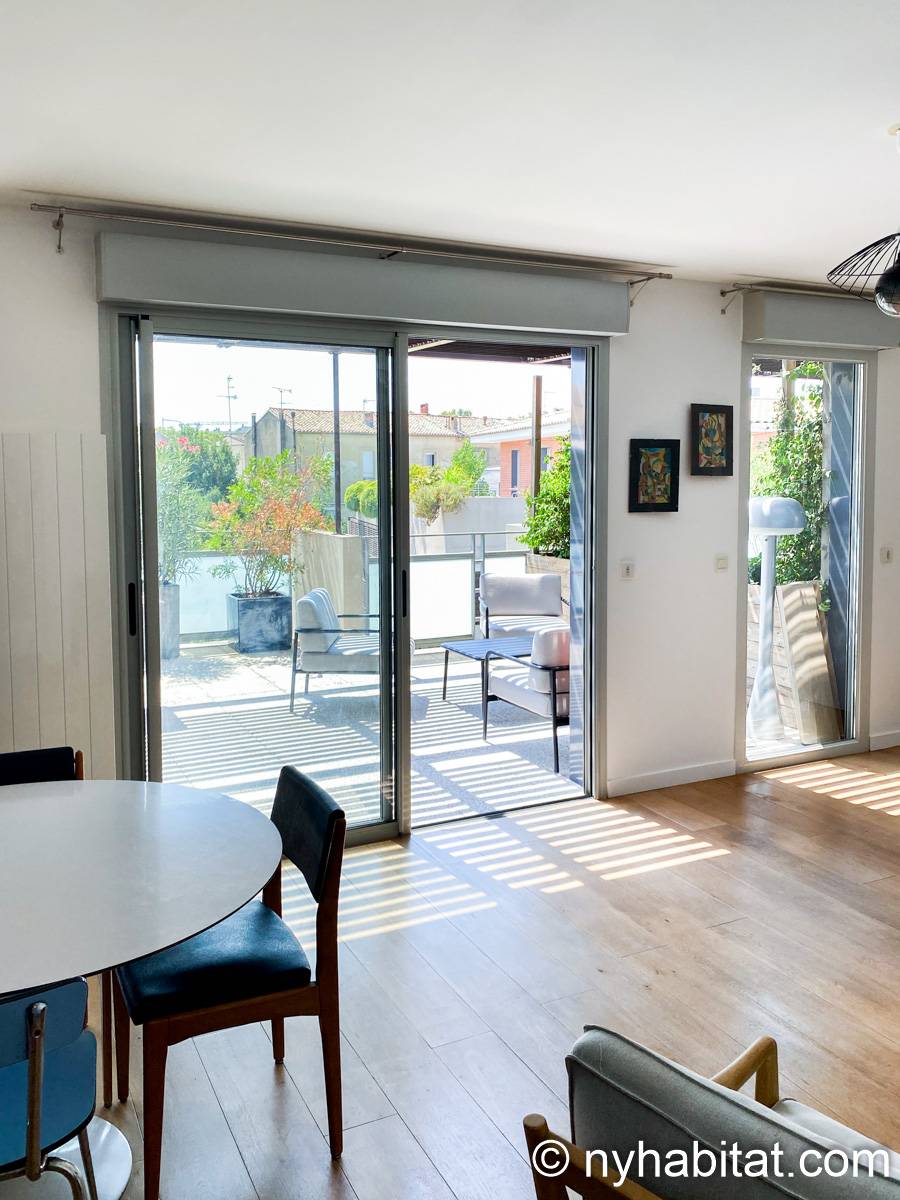 Bien qu'il se trouve à seulement 1 km de la place de la Comédie, une place publique emblématique du centre-ville datant de 300 ans, cet appartement présente un style contemporain. Une grande porte vitrée coulissante laisse entrer la lumière naturelle dans l'appartement, tandis qu'une multitude de sièges sont disponibles pour se détendre, tels qu'un canapé, des chaises et une table. La cuisine ouverte est équipée d'un réfrigérateur, d'un congélateur, d'un four, d'un micro-ondes, d'une machine à café et d'un lave-vaisselle pour vous permettre de préparer vos repas à la maison. De plus, la salle de bain est équipée d'un pommeau de douche à main, d'un lavabo et d'une machine à laver. L'appartement habillé d'œuvres d'art comprend également deux chambres avec chacune un lit double – un lit classique et un canapé-lit – ainsi qu'un accès à une terrasse extérieure. Le patio extérieur est agrémenté de verdure et de quelques tables et chaises.