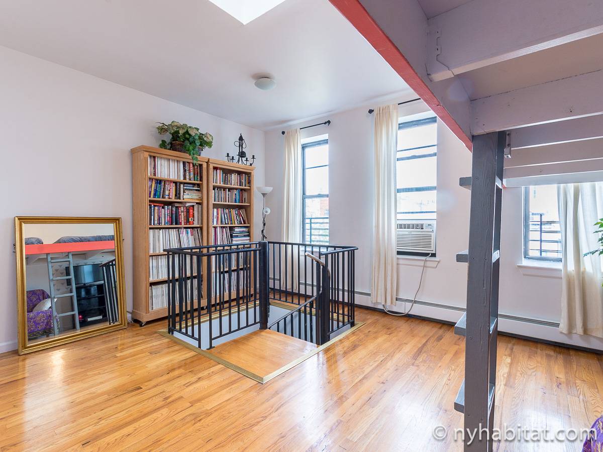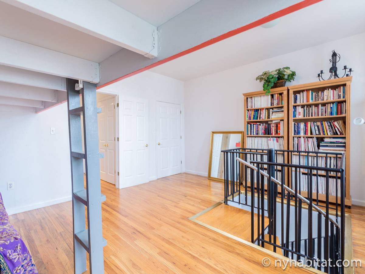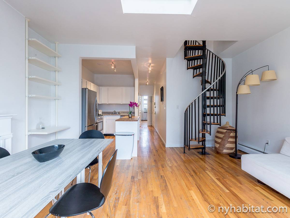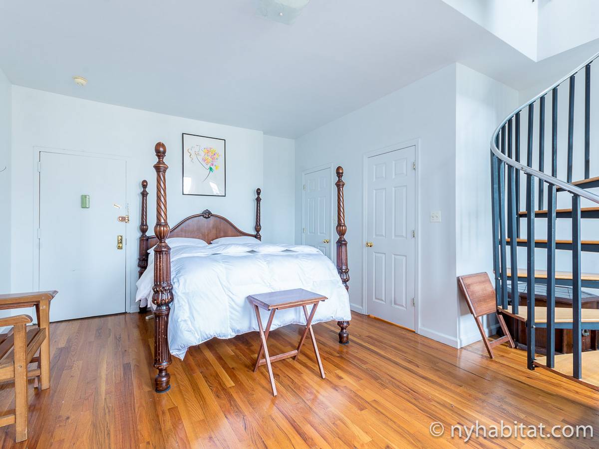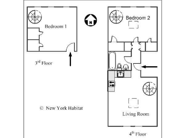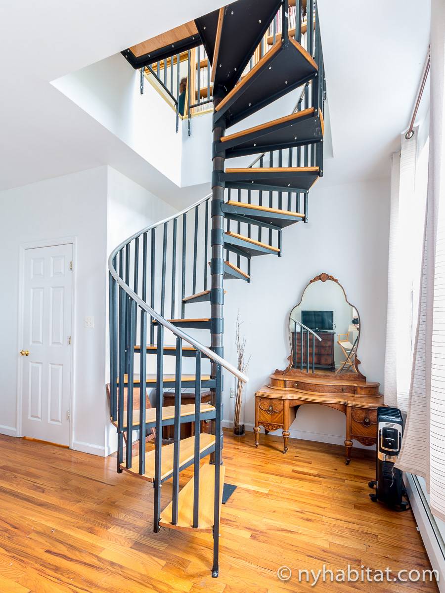 Questo appartamento con 2 camere da letto situato su 2 livelli si trova al terzo e quarto piano (corrispondenti al secondo e terzo piano in Europa) di una palazzina di 4 piani ad Harlem, Manhattan. Ci sono due entrate all'appartamento: dal secondo piano una porta collega alla camera da letto principale, e al terzo piano c'è un'altra porta che entra sul corridoio dell'appartamento. C'è anche una lavanderia all'interno dell'alloggio.