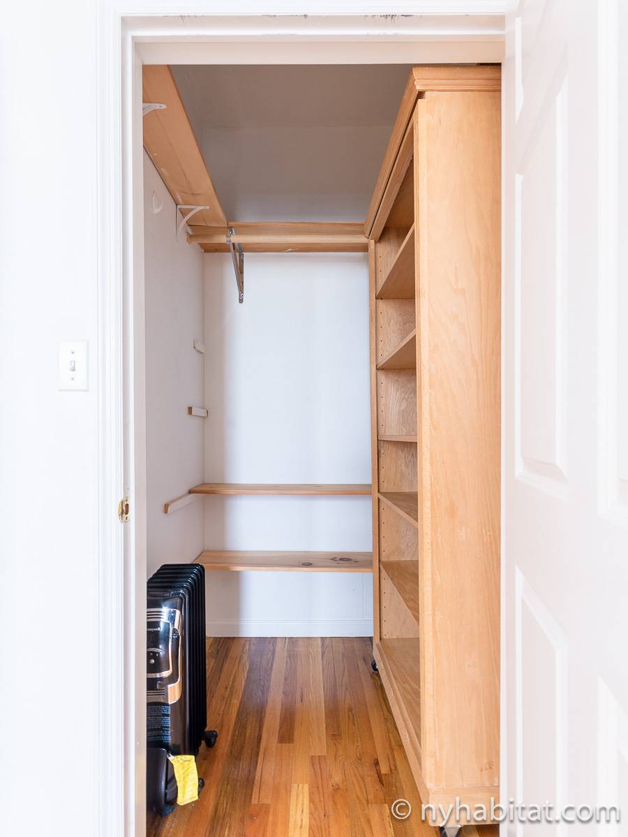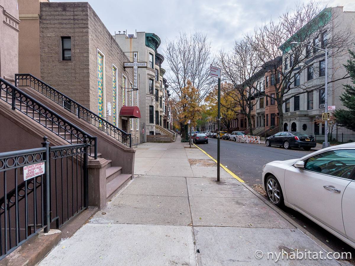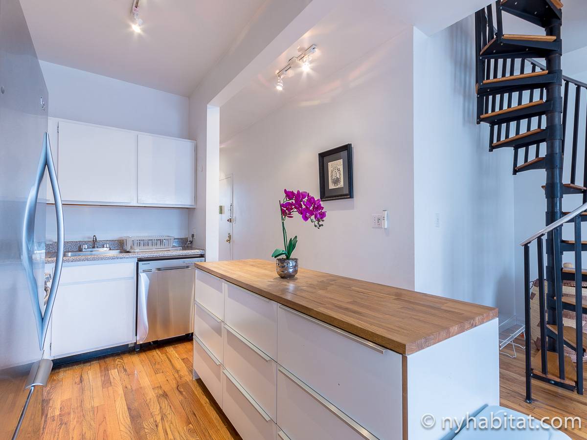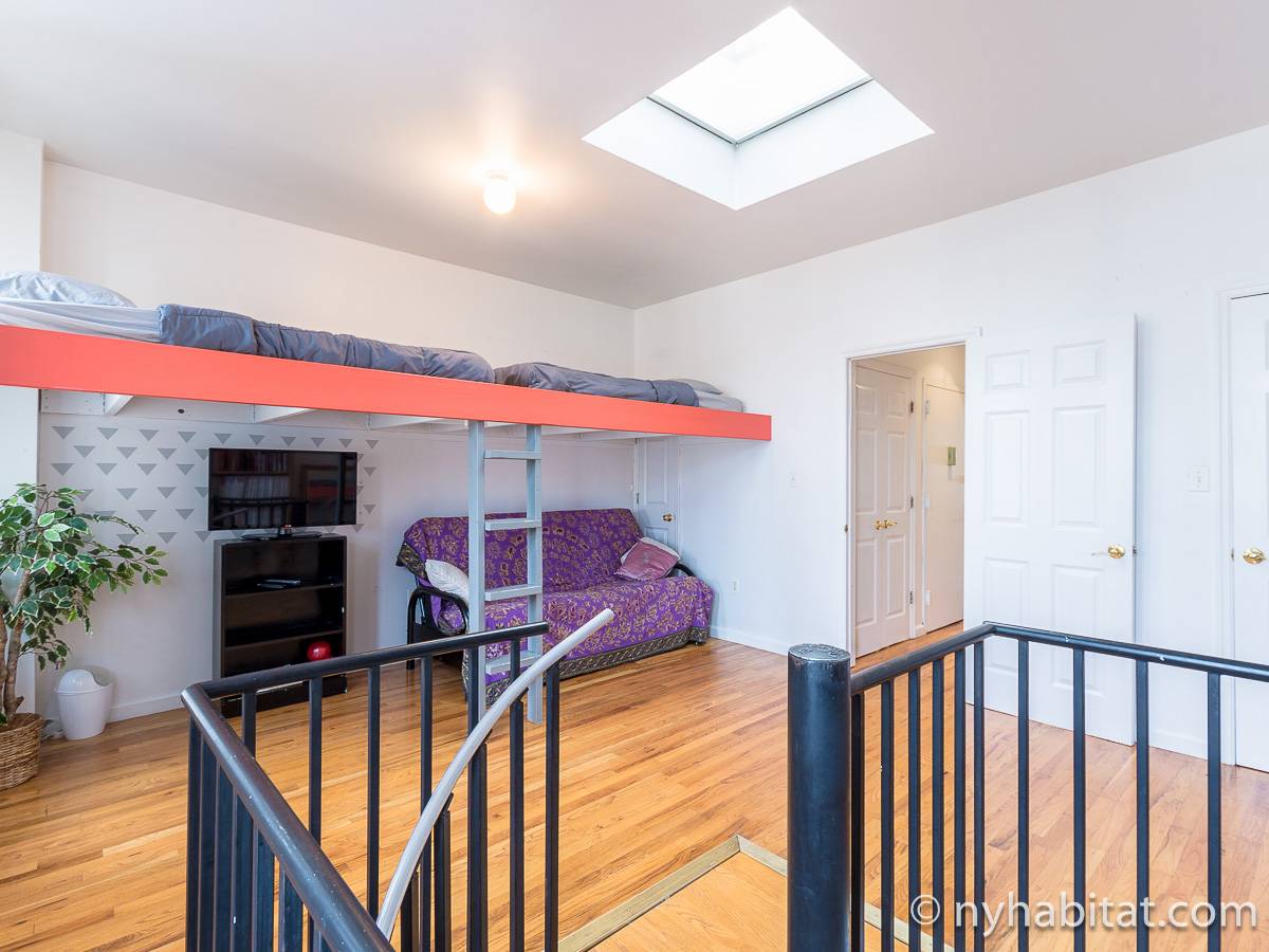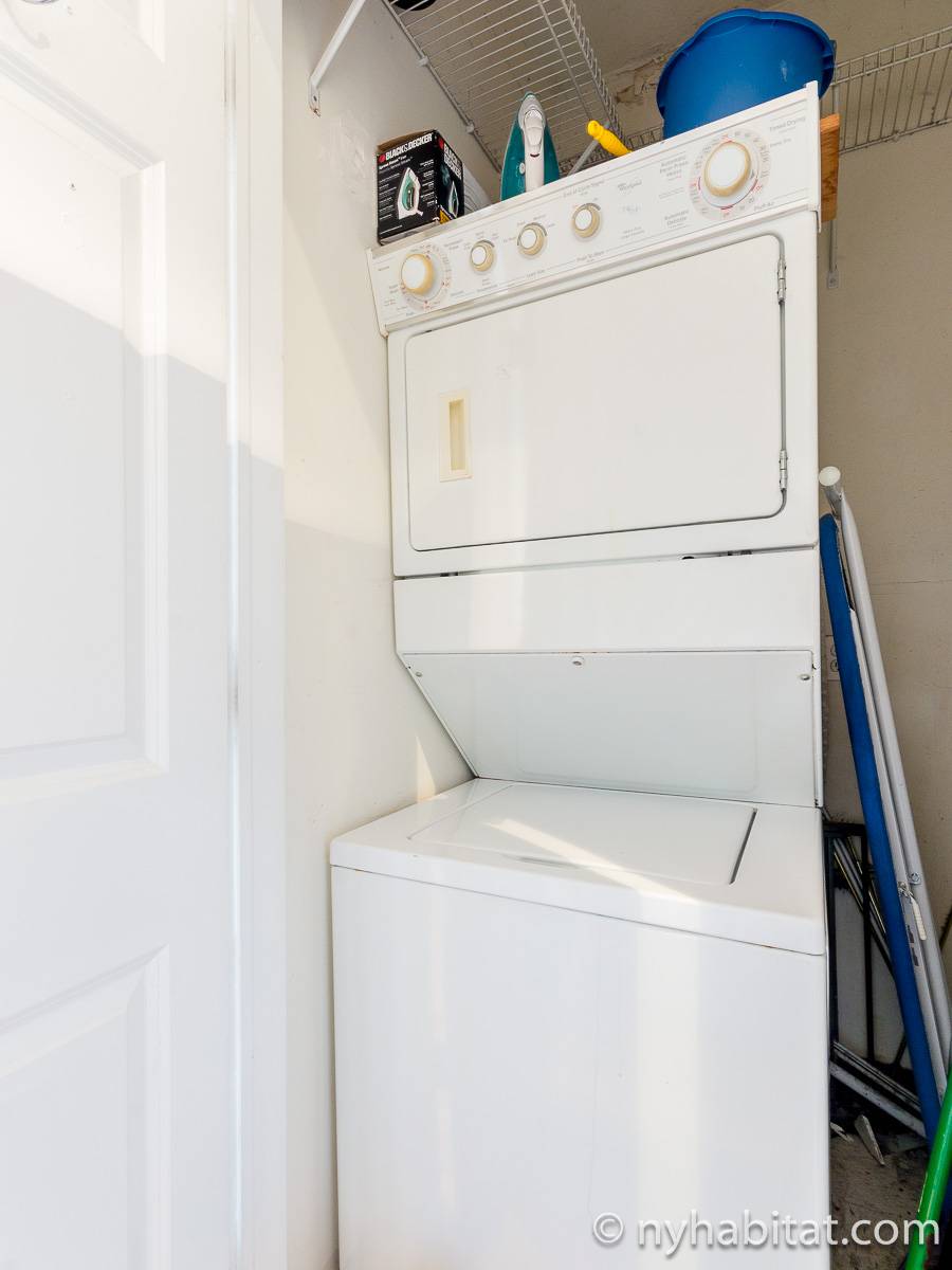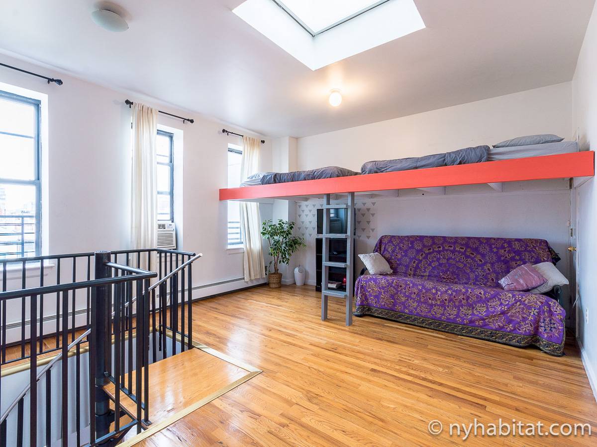 Questo appartamento con 2 camere da letto situato su 2 livelli si trova al terzo e quarto piano (corrispondenti al secondo e terzo piano in Europa) di una palazzina di 4 piani ad Harlem, Manhattan. Ci sono due entrate all'appartamento: dal secondo piano una porta collega alla camera da letto principale, e al terzo piano c'è un'altra porta che entra sul corridoio dell'appartamento. C'è anche una lavanderia all'interno dell'alloggio.