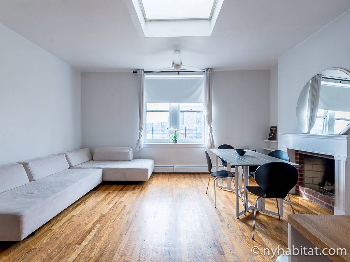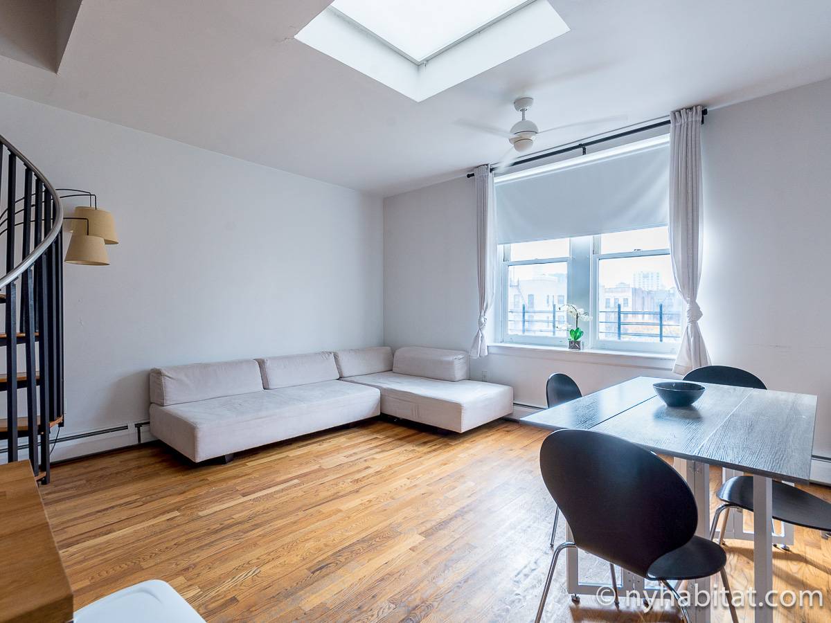 Un corridoio collega alle altre stanze al terzo piano. Il bagno si trova appena in fondo al corridoio e contiene una vasca da bagno con idromassaggio dotata di una moderna doccia. Anche il soggiorno dell'appartamento si trova su questo piano. La stanza presenta pavimenti in parquet, un caminetto decorativo e due finestre esposte a sud su un tipico viale alberato di New York. L'esposizione a sud insieme al lucernario e agli arredi bianchi rendono questo spazio davvero molto luminoso. C'è un'altra scala a chiocciola in questa stanza che porta al tetto, che però è chiuso a chiave e non vi sarà accessibile. Inoltre, la stanza contiene un grande divano moderno che può essere scomposto in due letti singoli e un tavolo da pranzo rotondo per quattro persone. Il tavolo da pranzo è convenientemente posizionato vicino alla cucina a vista, perfetta per cucinare dei pasti in casa.