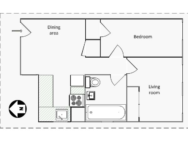 Quest'appartamento in affitto con vista a sud sul cortile posteriore, presenta una cucina abitabile completamente accessoriata con zona pranzo. Il soggiorno separato è arredato con due divani e un tavolino da caffè, e la camera da letto presenta un letto matrimoniale e una scrivania. Il bianco neutro delle pareti e i pavimenti piastrellati vi permettono di imprimere la vostra personalità all'ambiente.