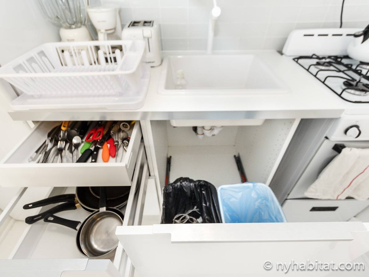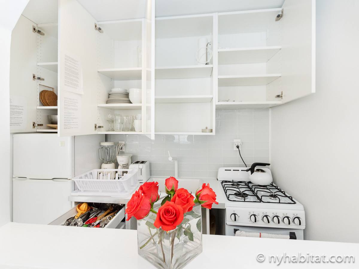 La zona giorno è ammobiliata con un letto ad una piazza e mezza, tavolo, sedie e una credenza. La cucina è perfettamente attrezzata e comprende macchina da caffè, tostapane e svariati accessori di base. In bagno le piastrelle nere creano un contrasto moderno con gli accessori bianchi. Inoltre è disponibile l’aria condizionata, piacevole rimedio durante i mesi più caldi dell’anno.