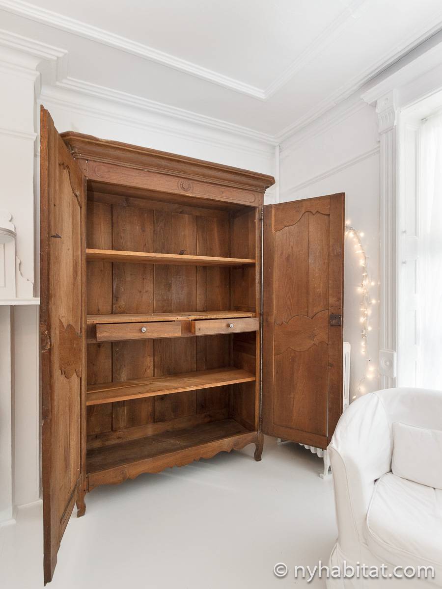 Di recente rinnovò l’appartamento conserva i suoi dettagli storici, come il caminetto decorativo e i pavimenti in legno massello. Le tre grandi finestre, esposte a sud, consentono l'illuminazione naturale della camera. Ma è soprattutto l'arredamento in stile liberty che rende unico quest'appartamento in affitto: le pareti della camera presentano decorazioni con lucine bianche, mentre i muri e l’arredamento bianco rendono l'ambiente spazioso, illuminato e accogliente.