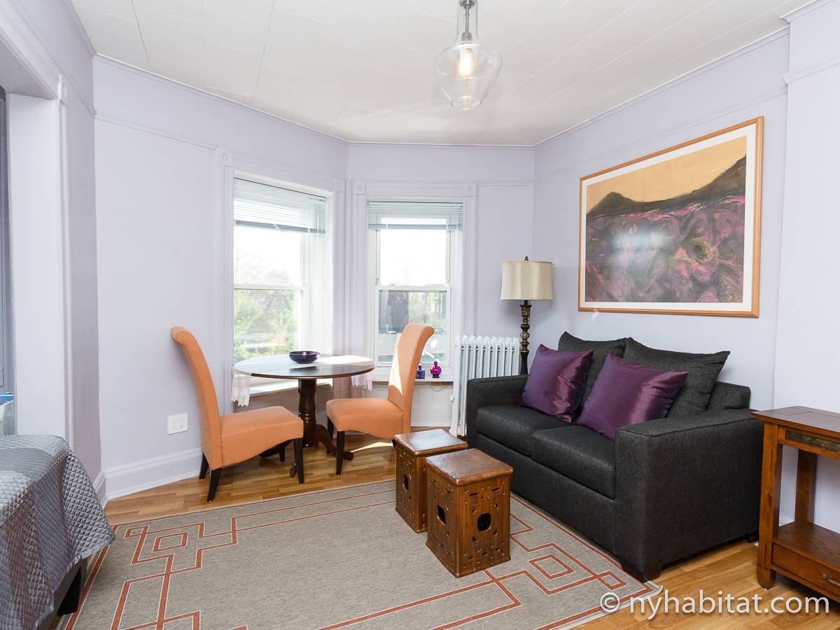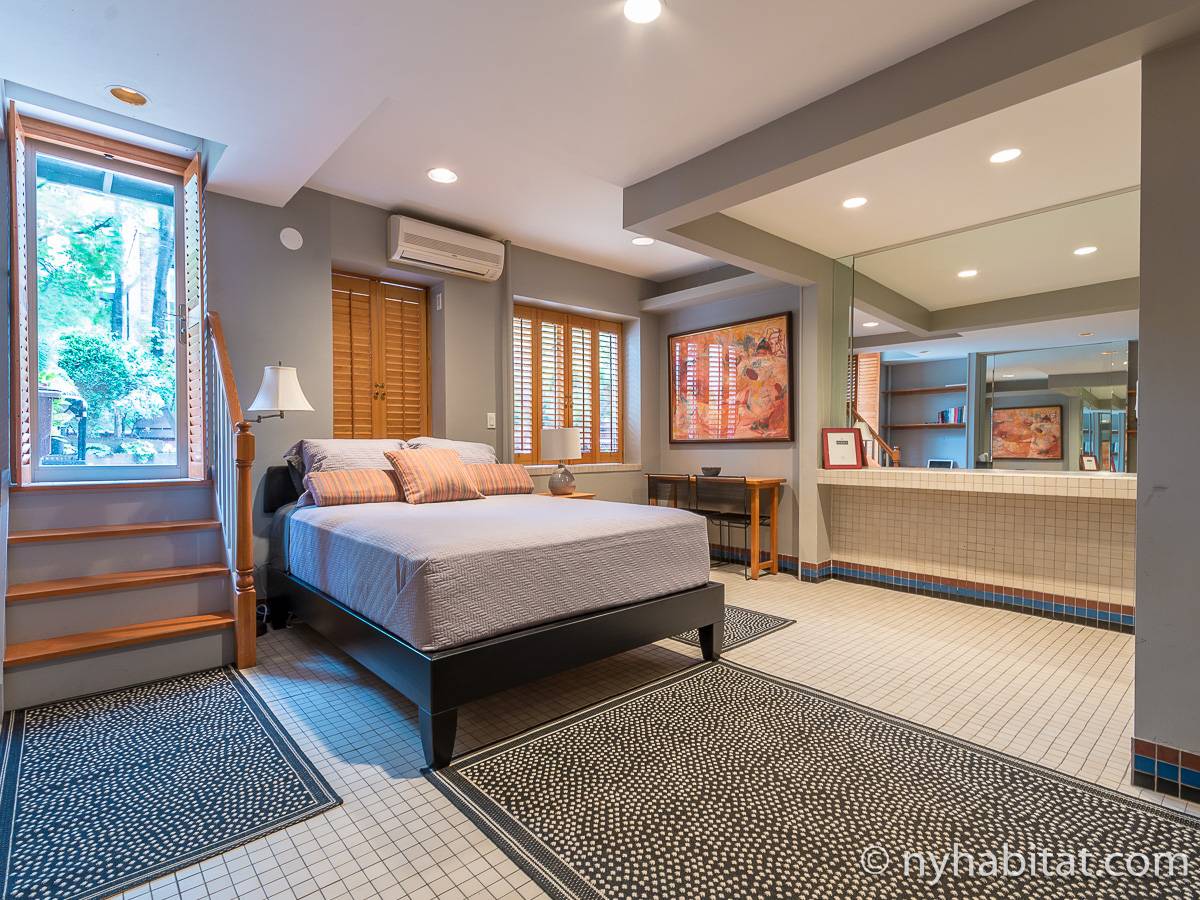 Lo spazio abitativo principale misura circa 30 mq ed è arredato in modo eclettico, con vari accessori moderni. Qui, tre finestre danno sulla strada e, grazie al passaggio di luce naturale, rischiarano l’ambiente. Troverete, inoltre, un letto matrimoniale e un divano, così come un caminetto decorativo che conferisce carisma a questo appartamento newyorkese. Infine, un tavolo da pranzo in legno sarà a vostra disposizione per mangiare o lavorare.