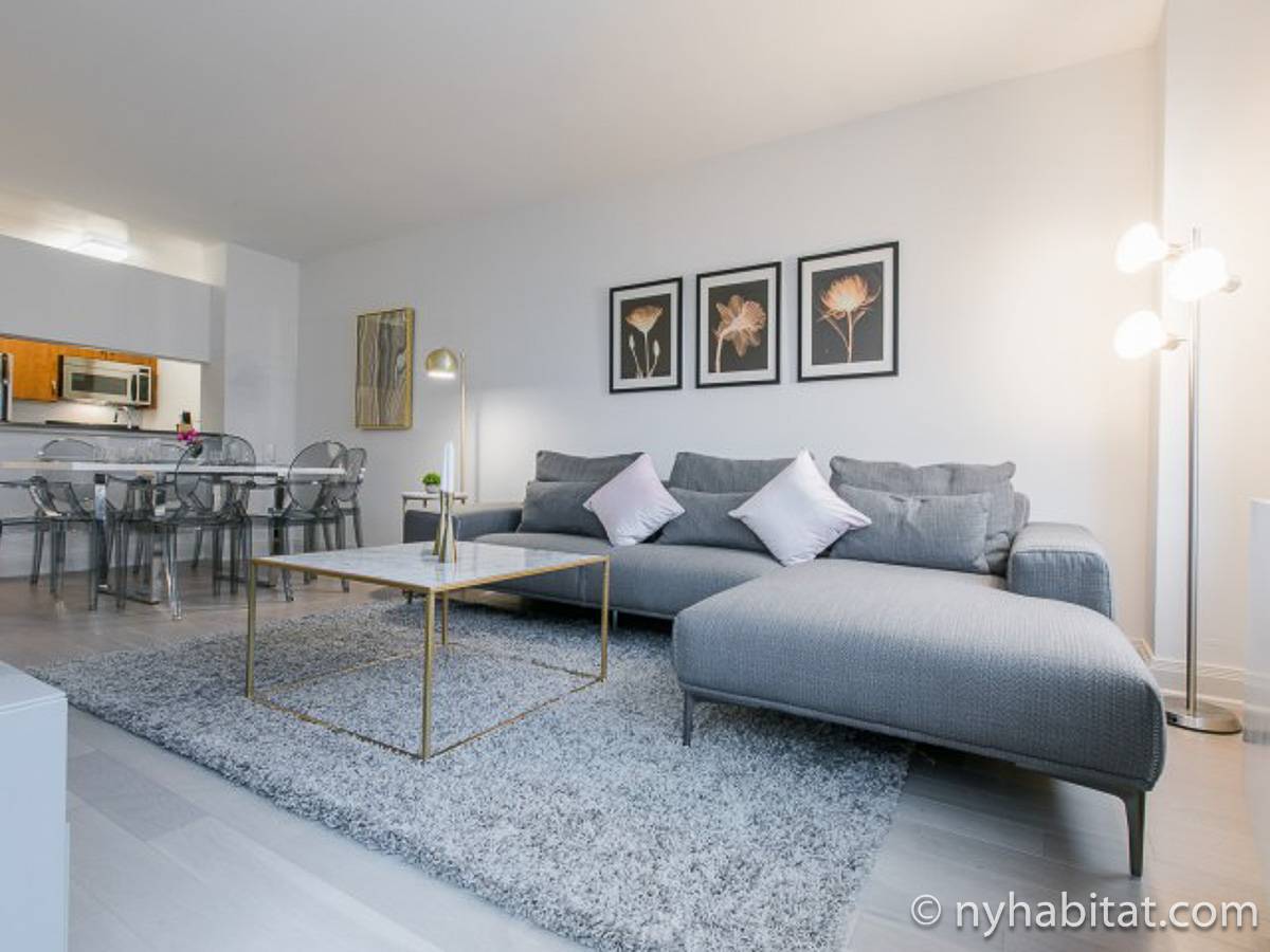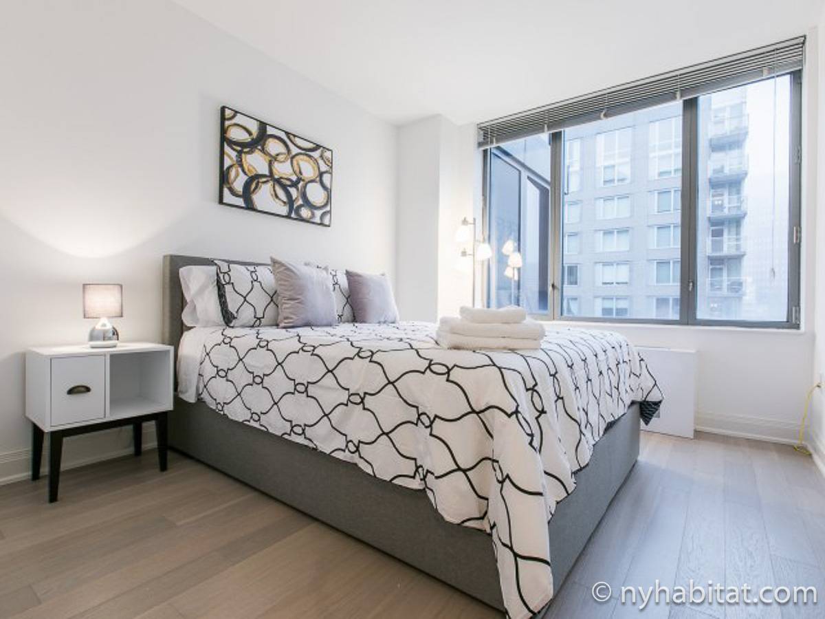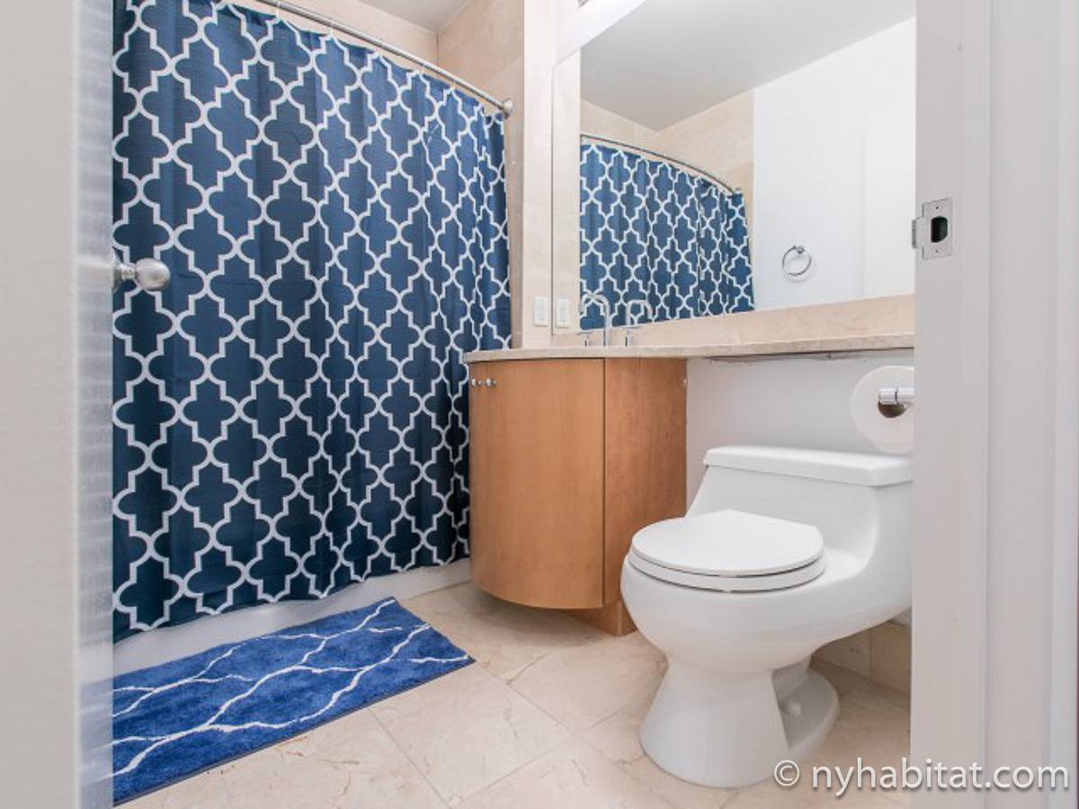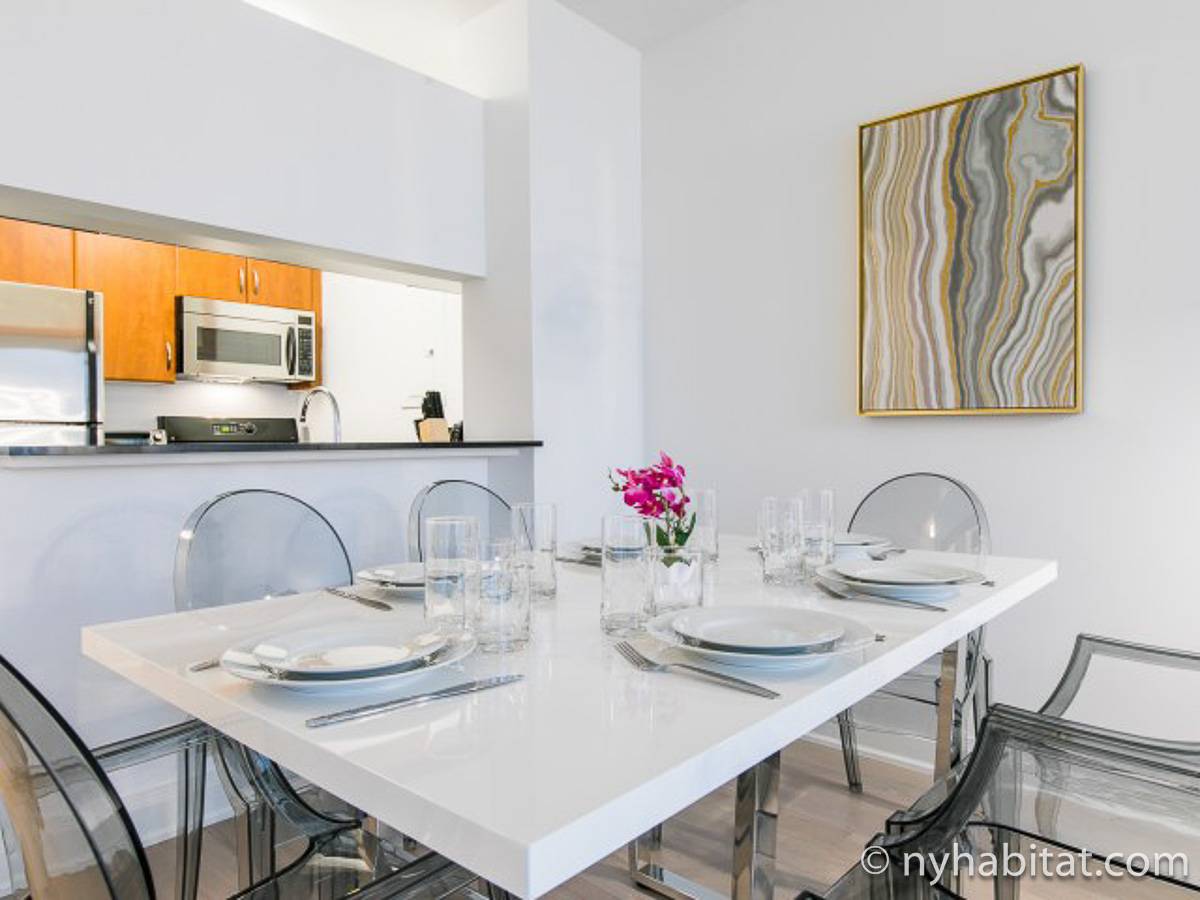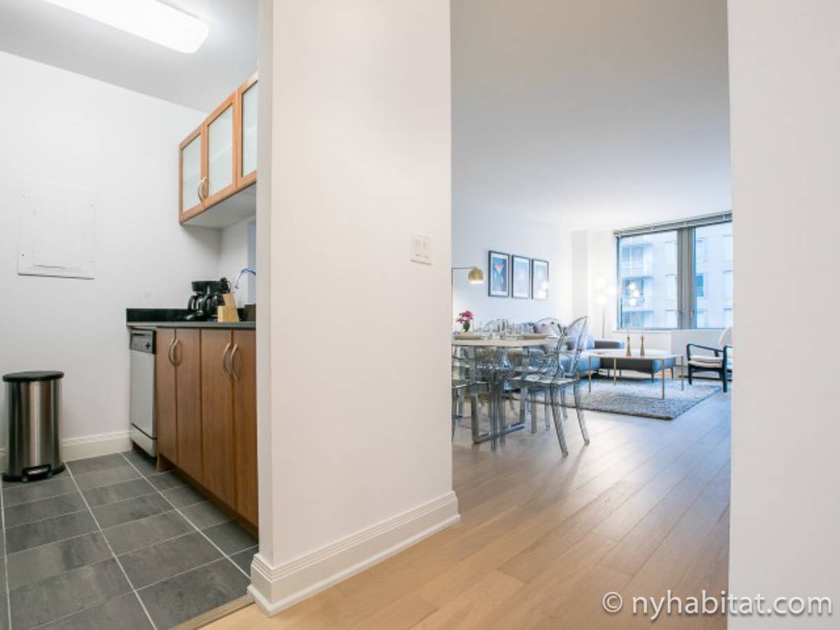 Fate di questo appartamento ammobiliato con due camere da letto e due bagni la vostra casa a New York City. L’appartamento è decorato in stile moderno, con pavimenti in legno chiaro e una combinazione di colori chiari che lo rendono arioso e luminoso. Il soggiorno dispone di molte finestre che permettono alla luce naturale di illuminare l’ambiente. In più, qui potrete godervi il lusso di avere un balcone ammobiliato dove sedervi e ammirare il panorama mentre sorseggiate un buon caffè. Concedetevi un po’ di sano relax sul divano nel soggiorno mentre guardate i vostri programmi preferiti sulla tv via cavo a schermo piatto. In alternativa, non mancherà mai l’occasione per invitare i vostri amici a cena grazie al tavolo da pranzo con sedie che si trova proprio fuori dalla cucina. La cucina è dotata di armadietti in legno di ciliegio e ha tutto ciò di cui avete bisogno per preparare le vostre ricette preferite: un piano cottura con forno, un forno a microonde a incasso, un tostapane, un frigorifero e una lavastoviglie. Entrambe le camere da letto presentano un letto queen size, tv via cavo e moltissimo spazio per conservare i vostri effetti personali. Sono disponibili lenzuola e asciugamani e il WiFi è presente in tutto l’appartamento. I due bagni completi con vasca e doccia sono una vera comodità per chi vive con la famiglia o dei coinquilini; così non dovrete mai fare la fila per il bagno.