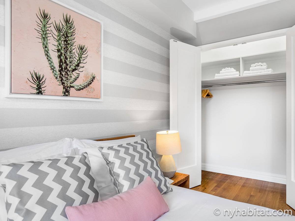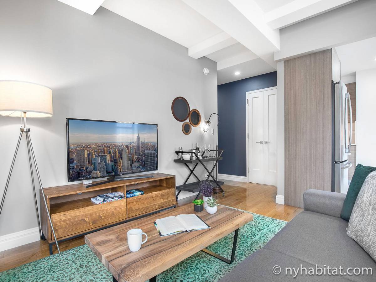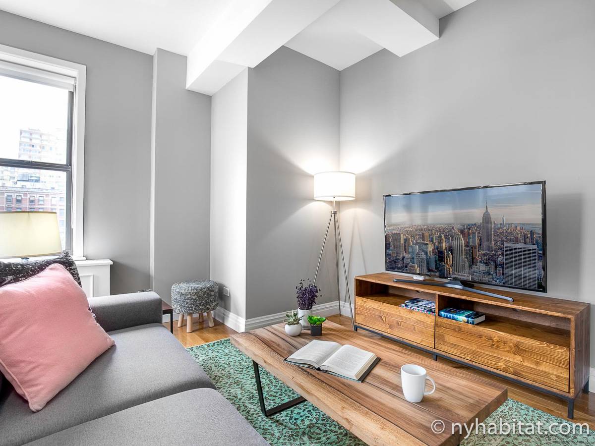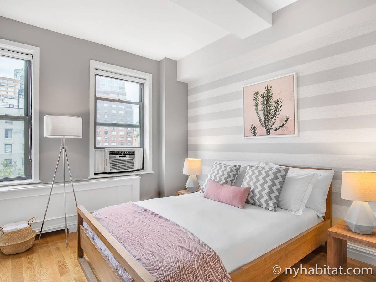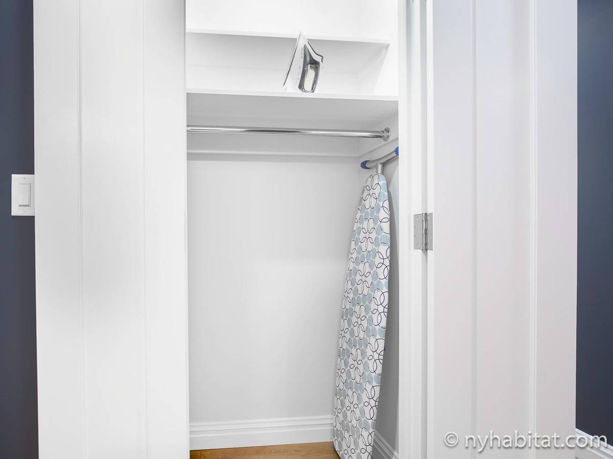 Questo appartamento ammobiliato con due camere da letto, un bagno e un WC si trova all’ottavo piano (settimo piano in Europa) di un grattacielo dotato di ascensore e portiere e situato tra West 70th Street e Amsterdam Avenue, nell’Upper West Side di Manhattan.