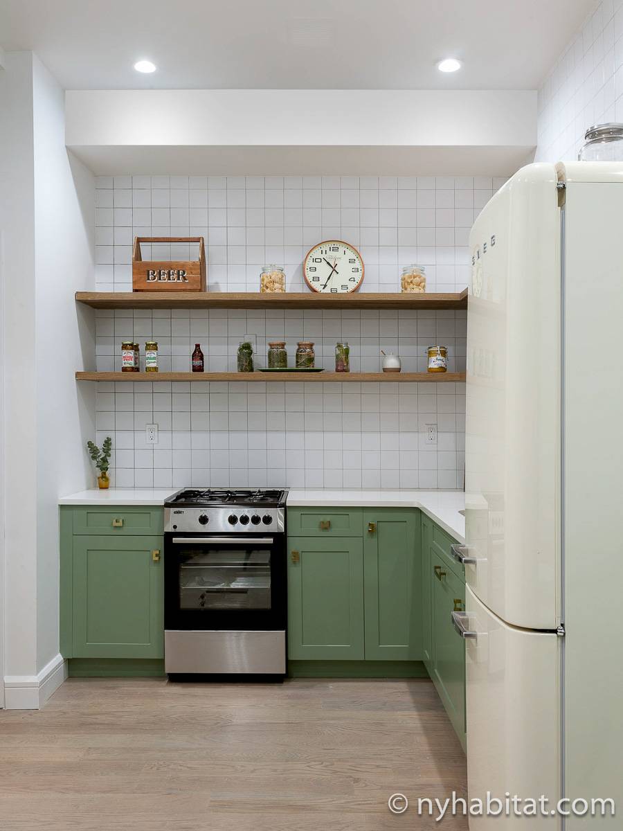 Dal soggiorno di questo appartamento ammobiliato con una camera da letto si può godere della vista della strada alberata attraverso una parete finestrata. Lasciate che la luce naturale si diffonda nello spazio mentre vi rilassate sul divano con il vostro libro preferito. Un tavolo da pranzo per quattro persone accanto al soggiorno vi permette di sedervi e gustare un pasto fatto in casa. Nella cucina completamente attrezzata troverete tutto il necessario per preparare le vostre ricette preferite. La cucina di ispirazione rétro è dotata di mobili colorati, scaffali e un frigorifero sempre in stile rétro. Le finestre da parete a parete della camera da letto aprono lo spazio e vi permettono di svegliarvi con la luce del sole che entra. La camera è arredata con un letto matrimoniale e un materasso molto confortevole. Il bagno è progettato con piastrelle in stile underground e una doccia vetrata.