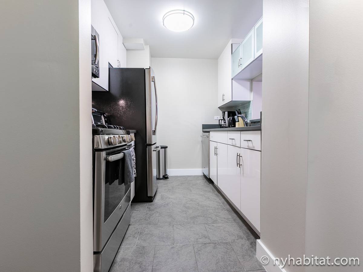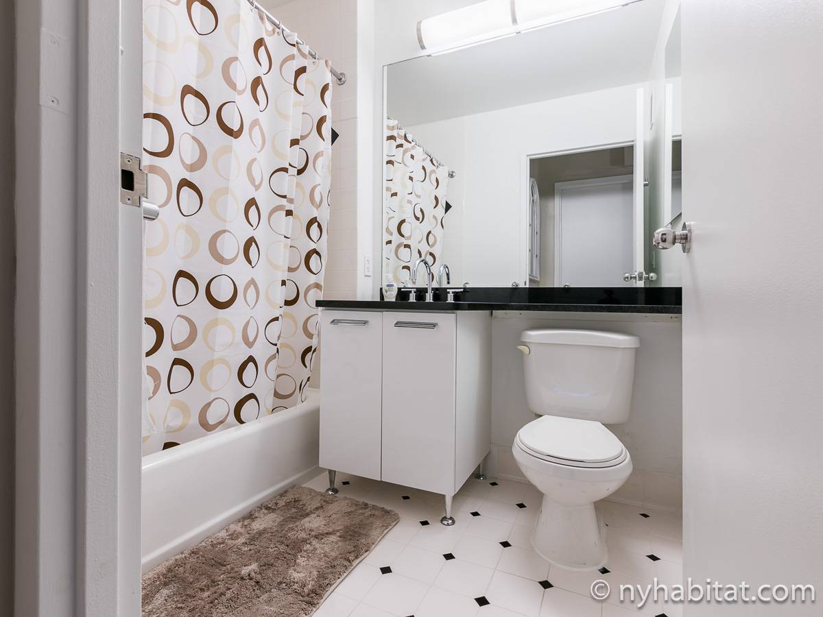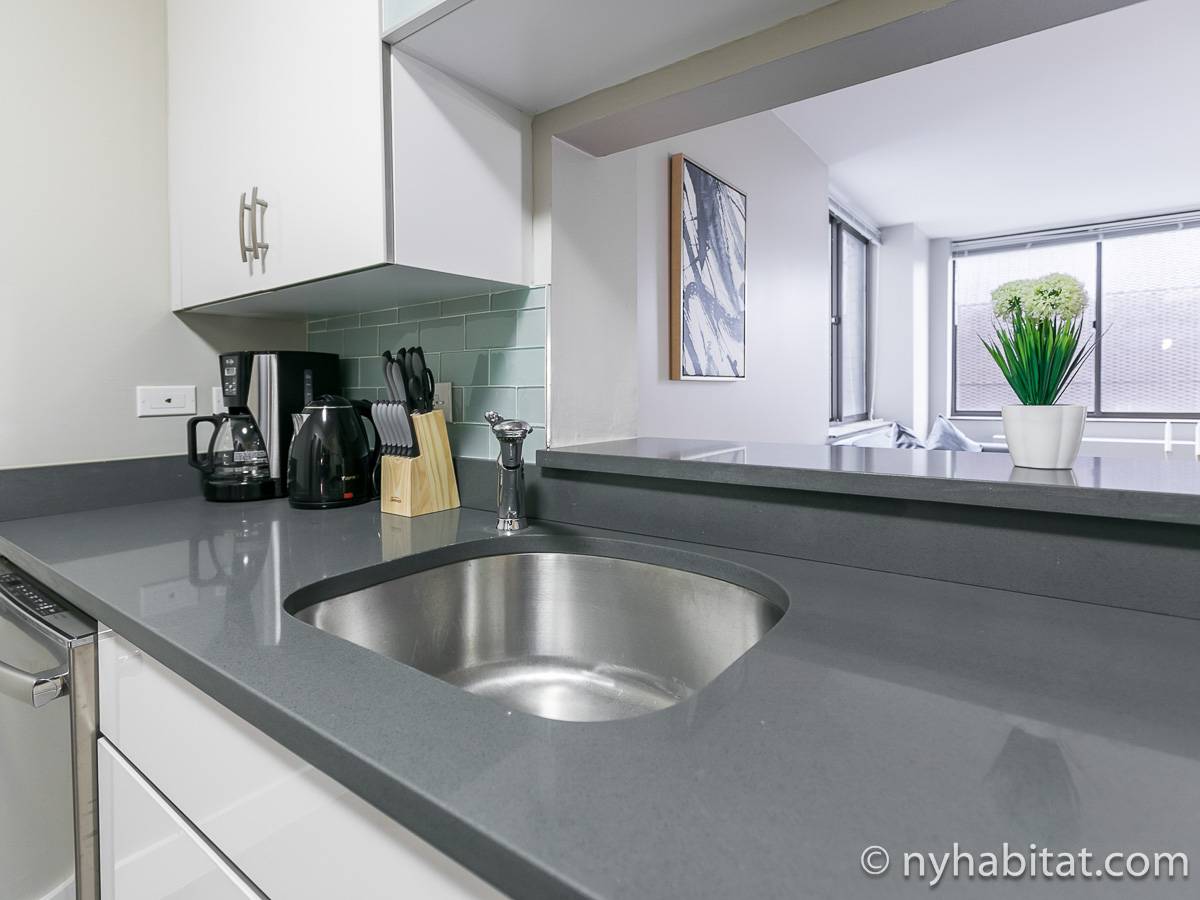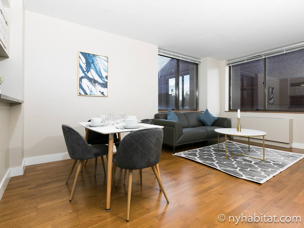 Questo appartamento di New York con una camera da letto è arredato con toni di grigio e dispone di tutto il necessario per entrare a far parte della vita di New York. Il soggiorno è arredato con un divano, un tavolino e una TV a schermo piatto intorno a un tappeto. In questo spazio si trova anche un tavolo da pranzo per quattro persone, per sedersi a tavola appena fuori dalla cucina. La cucina si trova in prossimità del soggiorno, con un piano di lavoro ritagliato che apre lo spazio tra i due ambienti. È progettata con mobili bianchi contemporanei, piani di lavoro in granitogrigio ed elettrodomestici in acciaio inox, compresa la lavastoviglie. Dal letto matrimoniale della camera da letto si gode di una vista su New York. Il bagno è in stile bianco e nero, con vasca/doccia combinata, piani d'appoggio neri, un grande specchio e uno spazio per riporre i propri oggetti. La lavanderia è comodamente situata nell'edificio.
