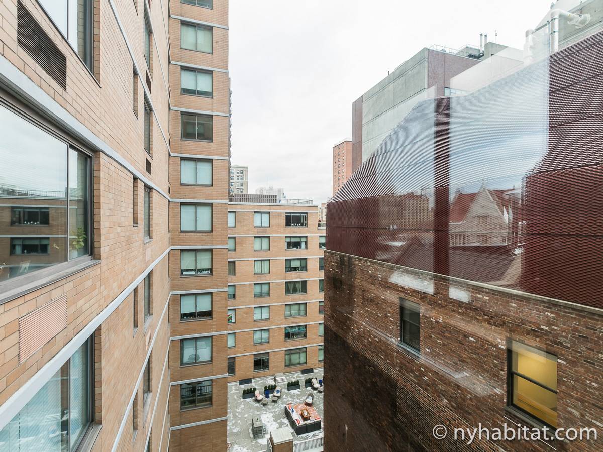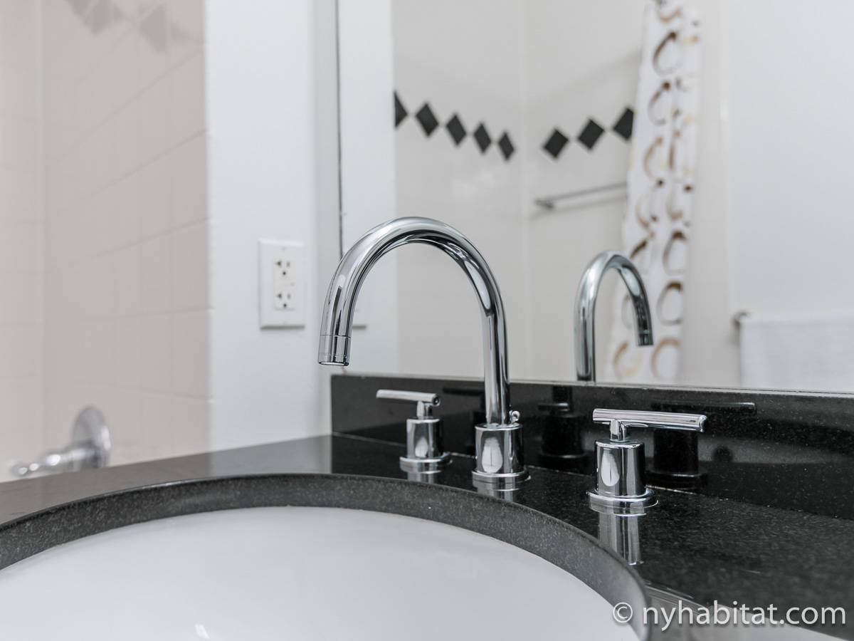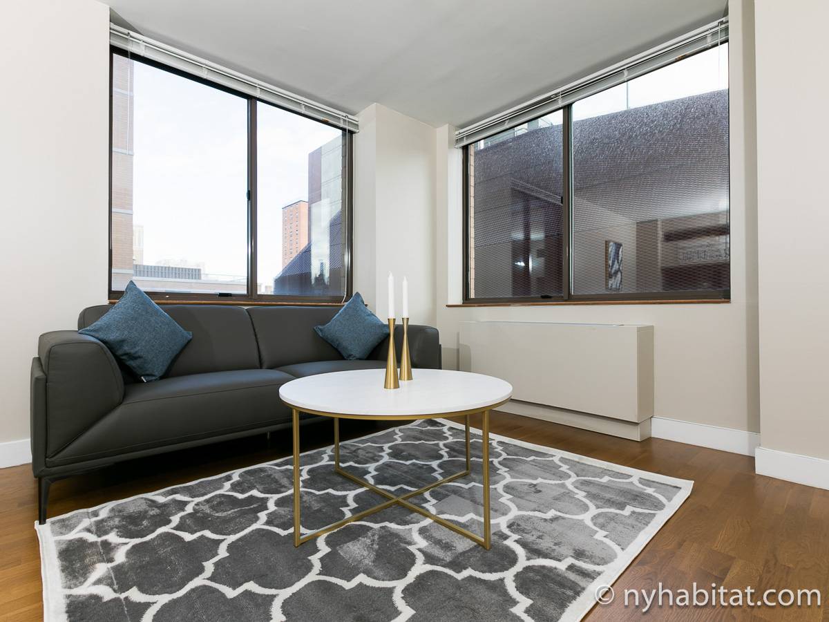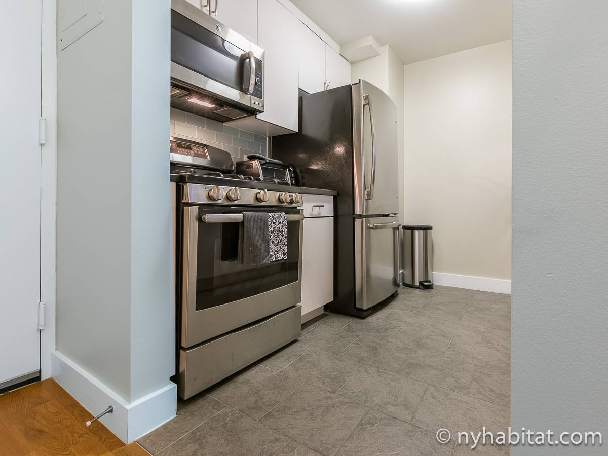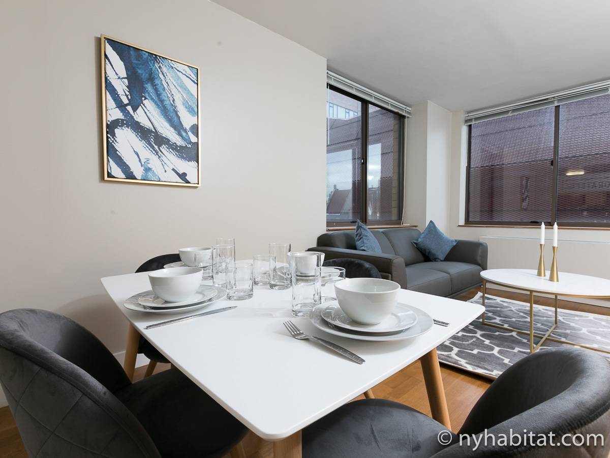 Questo appartamento di New York con una camera da letto è arredato con toni di grigio e dispone di tutto il necessario per entrare a far parte della vita di New York. Il soggiorno è arredato con un divano, un tavolino e una TV a schermo piatto intorno a un tappeto. In questo spazio si trova anche un tavolo da pranzo per quattro persone, per sedersi a tavola appena fuori dalla cucina. La cucina si trova in prossimità del soggiorno, con un piano di lavoro ritagliato che apre lo spazio tra i due ambienti. È progettata con mobili bianchi contemporanei, piani di lavoro in granitogrigio ed elettrodomestici in acciaio inox, compresa la lavastoviglie. Dal letto matrimoniale della camera da letto si gode di una vista su New York. Il bagno è in stile bianco e nero, con vasca/doccia combinata, piani d'appoggio neri, un grande specchio e uno spazio per riporre i propri oggetti. La lavanderia è comodamente situata nell'edificio.