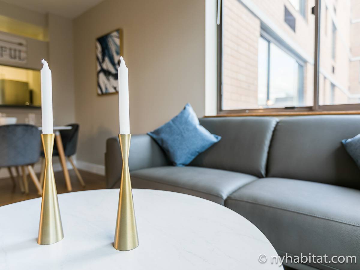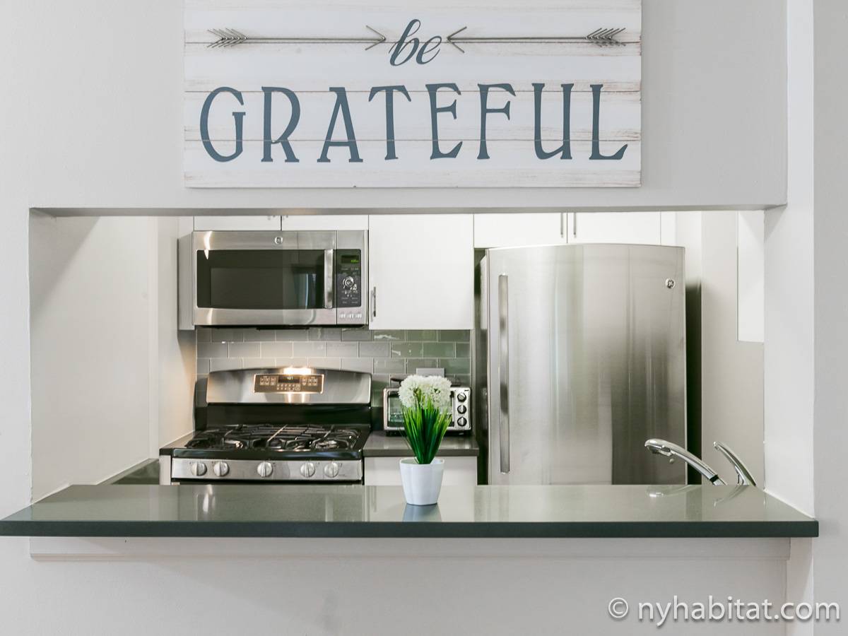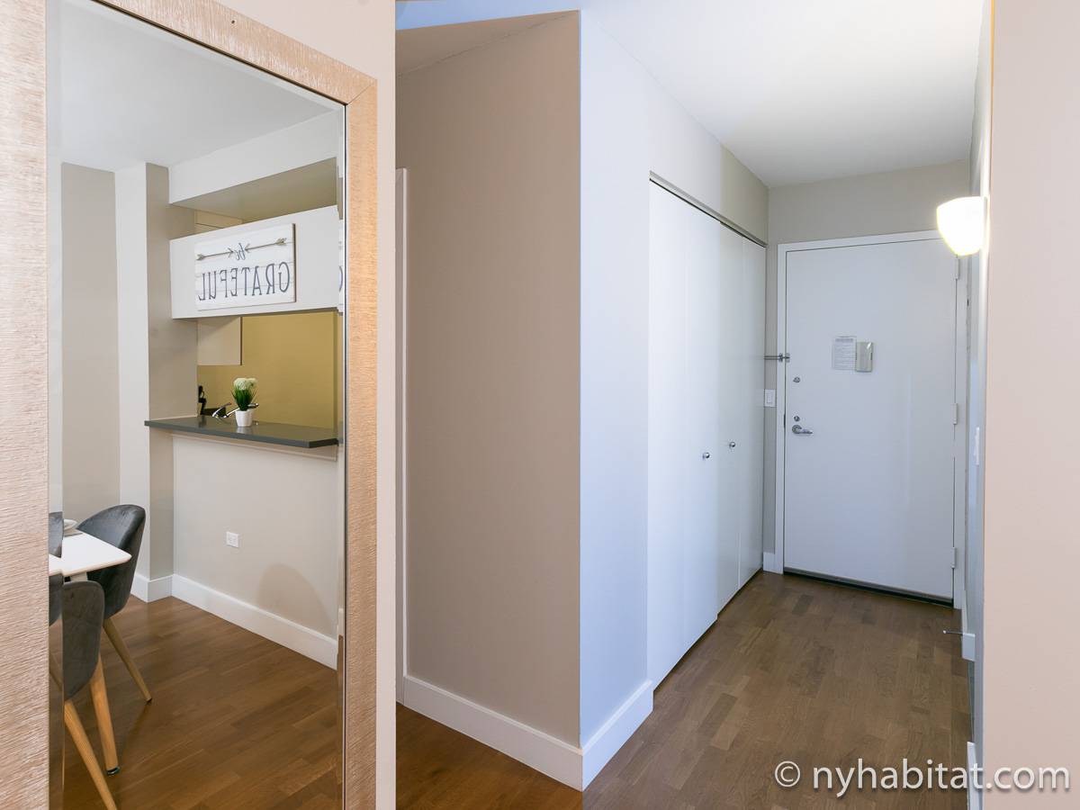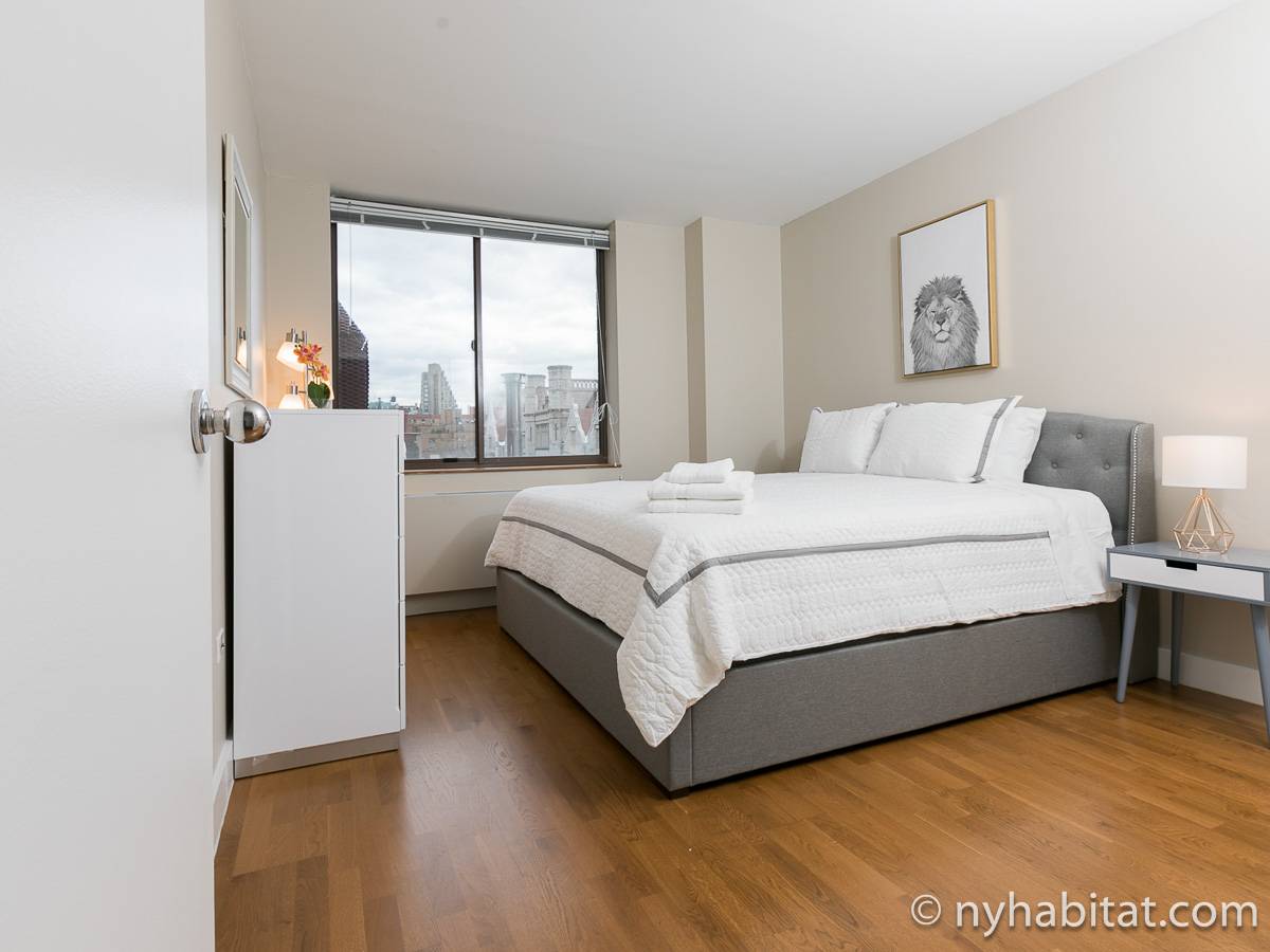 Questo appartamento di New York con una camera da letto è arredato con toni di grigio e dispone di tutto il necessario per entrare a far parte della vita di New York. Il soggiorno è arredato con un divano, un tavolino e una TV a schermo piatto intorno a un tappeto. In questo spazio si trova anche un tavolo da pranzo per quattro persone, per sedersi a tavola appena fuori dalla cucina. La cucina si trova in prossimità del soggiorno, con un piano di lavoro ritagliato che apre lo spazio tra i due ambienti. È progettata con mobili bianchi contemporanei, piani di lavoro in granitogrigio ed elettrodomestici in acciaio inox, compresa la lavastoviglie. Dal letto matrimoniale della camera da letto si gode di una vista su New York. Il bagno è in stile bianco e nero, con vasca/doccia combinata, piani d'appoggio neri, un grande specchio e uno spazio per riporre i propri oggetti. La lavanderia è comodamente situata nell'edificio.