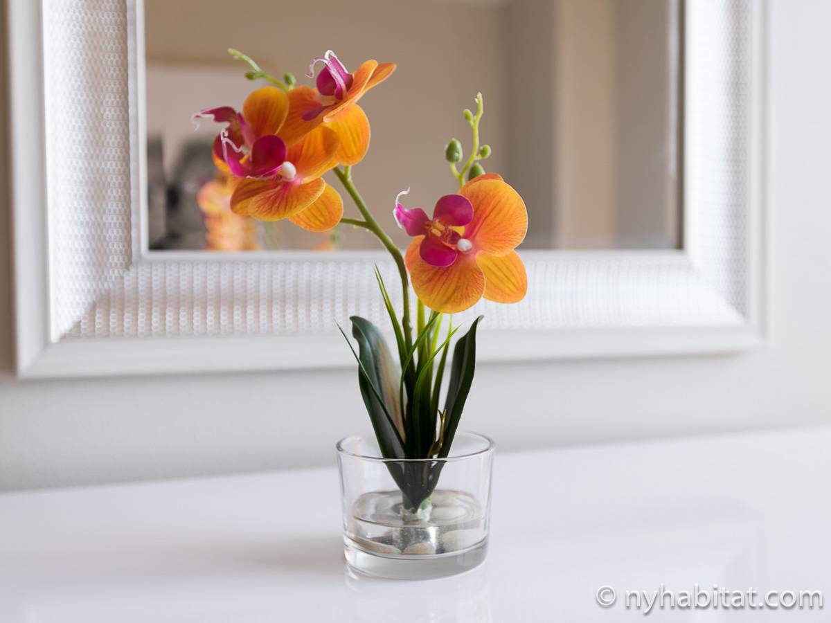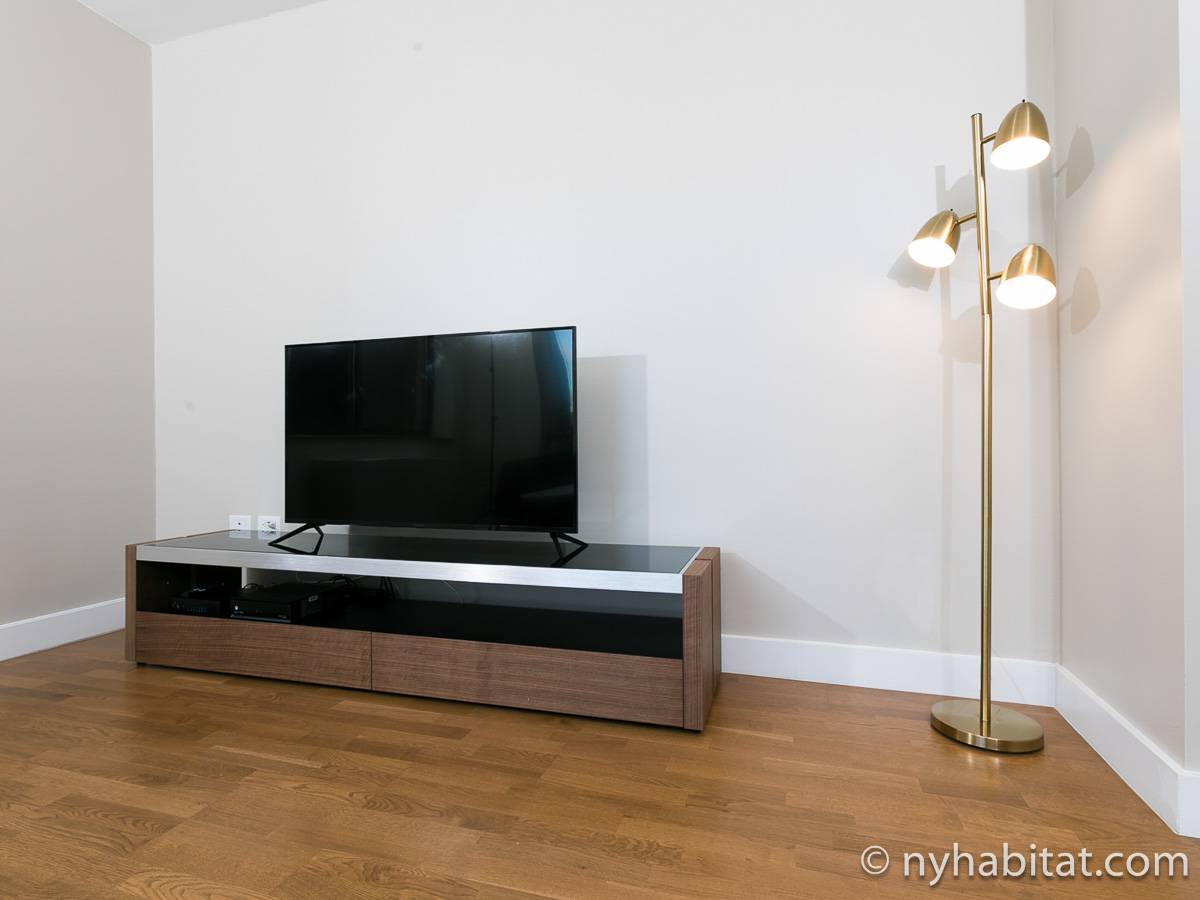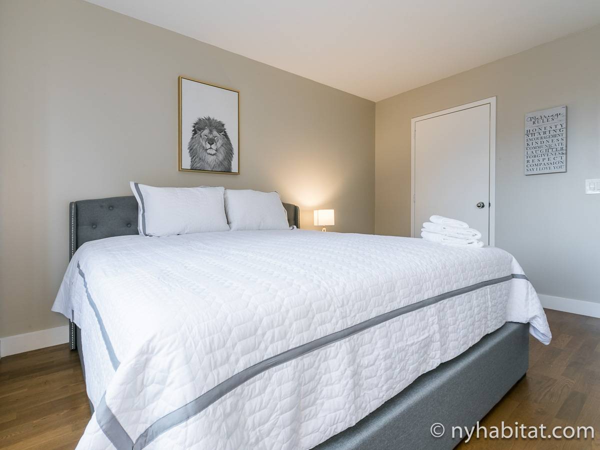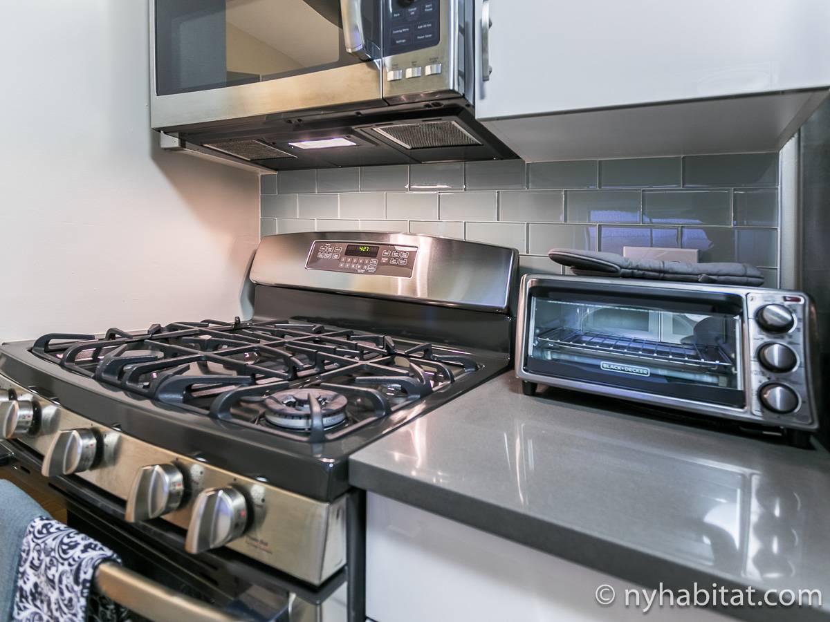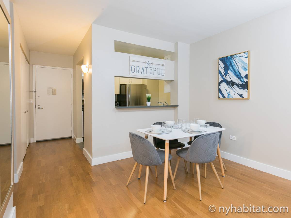 Questo appartamento di New York con una camera da letto è arredato con toni di grigio e dispone di tutto il necessario per entrare a far parte della vita di New York. Il soggiorno è arredato con un divano, un tavolino e una TV a schermo piatto intorno a un tappeto. In questo spazio si trova anche un tavolo da pranzo per quattro persone, per sedersi a tavola appena fuori dalla cucina. La cucina si trova in prossimità del soggiorno, con un piano di lavoro ritagliato che apre lo spazio tra i due ambienti. È progettata con mobili bianchi contemporanei, piani di lavoro in granitogrigio ed elettrodomestici in acciaio inox, compresa la lavastoviglie. Dal letto matrimoniale della camera da letto si gode di una vista su New York. Il bagno è in stile bianco e nero, con vasca/doccia combinata, piani d'appoggio neri, un grande specchio e uno spazio per riporre i propri oggetti. La lavanderia è comodamente situata nell'edificio.